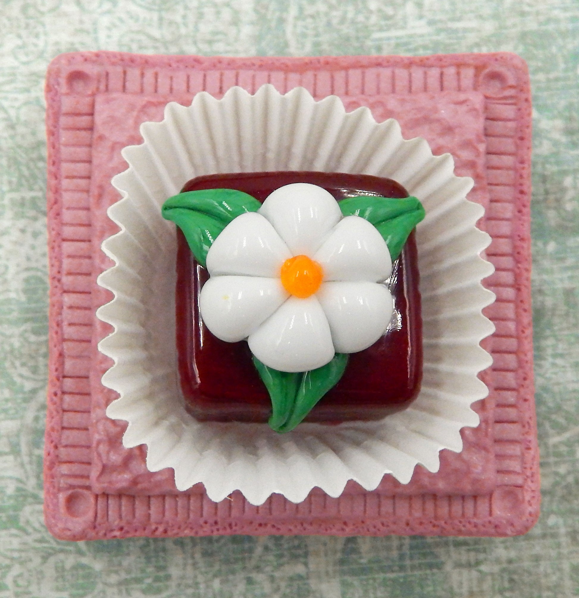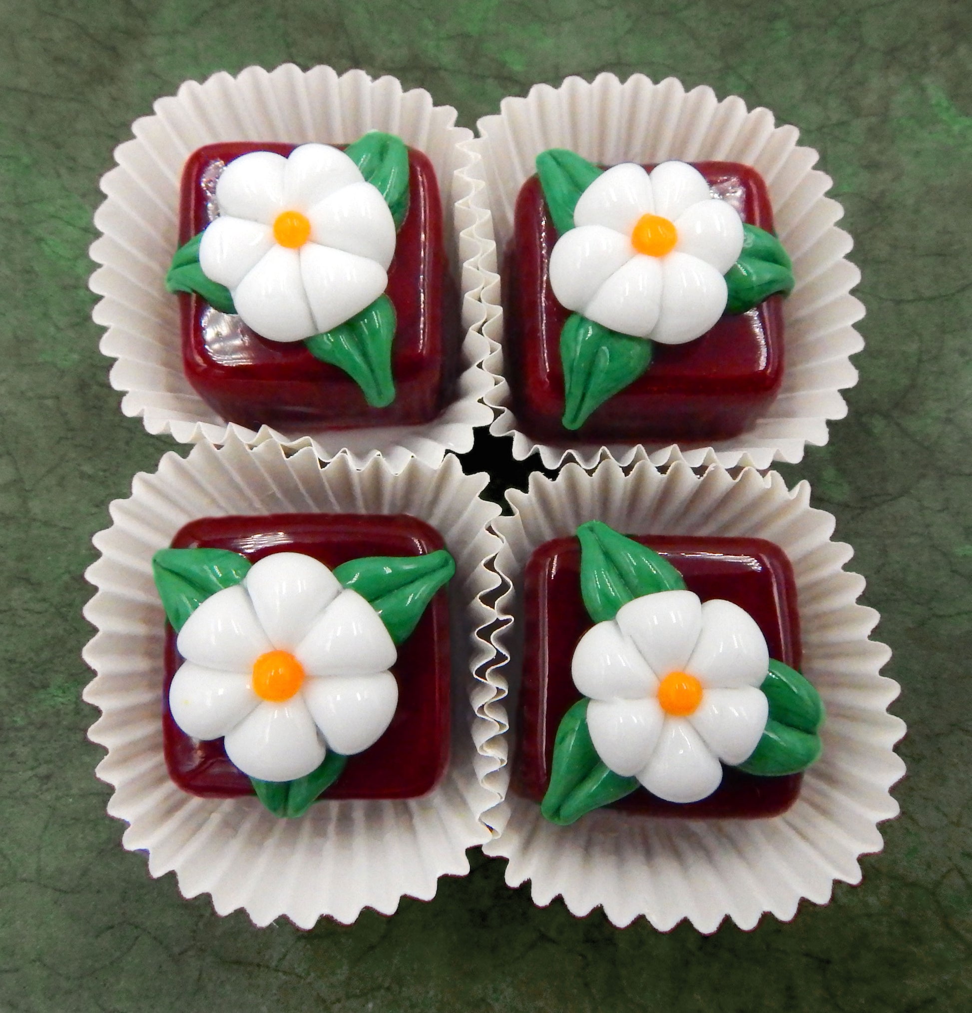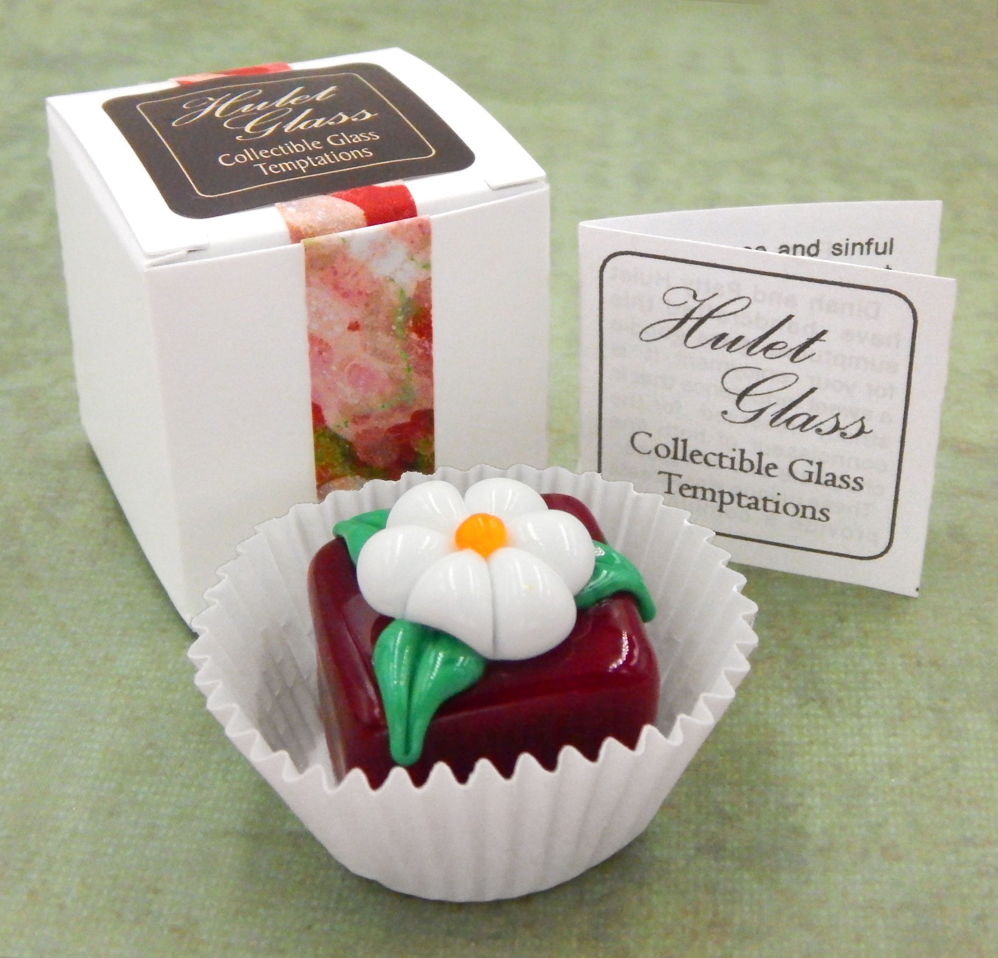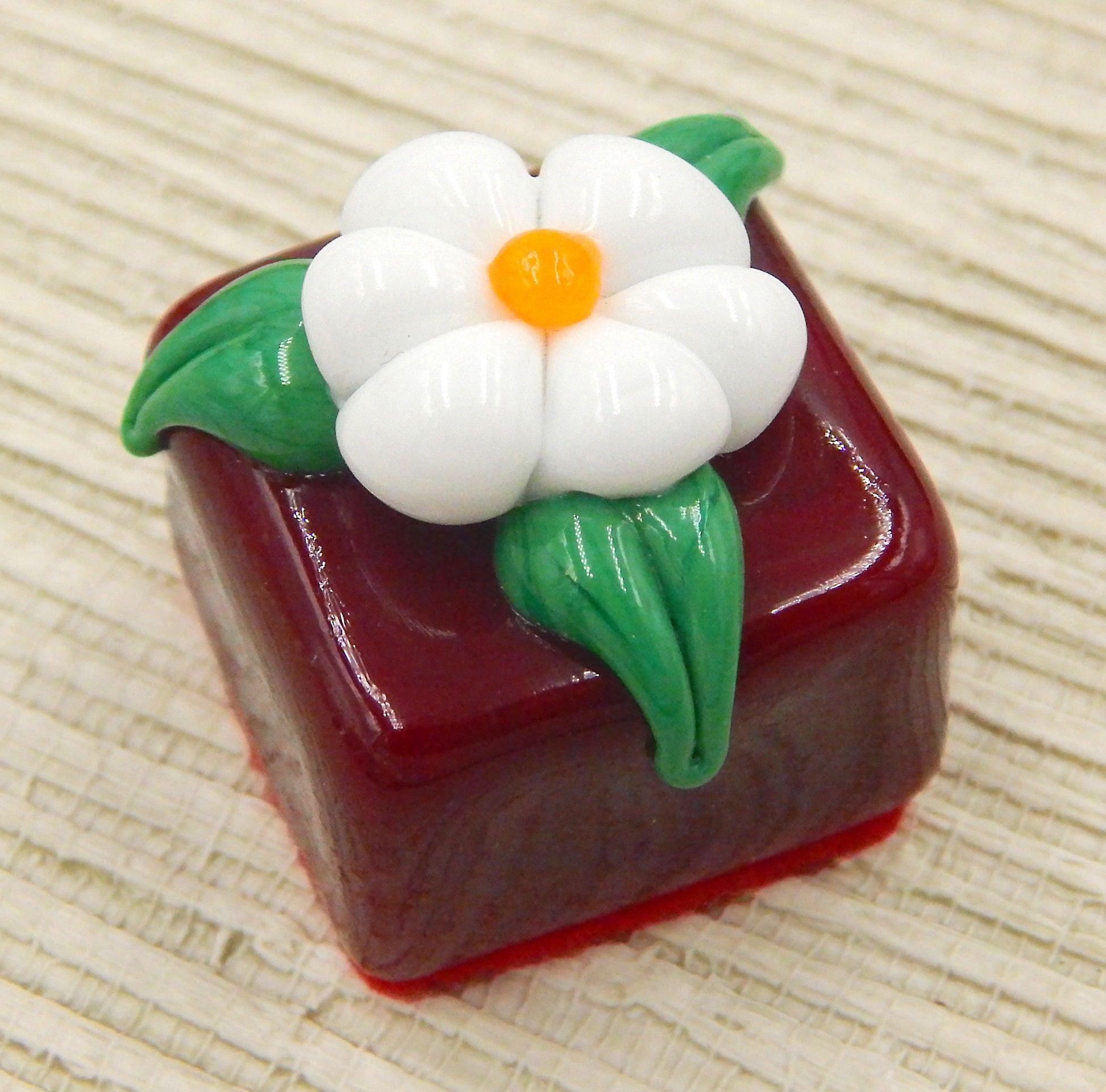 A handmade collectible solid glass dark cherry chocolate with a white chocolate blossom on top created from colorful glass utilizing flameworking techniques. Meticulous attention to detail has gone into the construction of each of our pieces to enhance its appeal and collectibility.