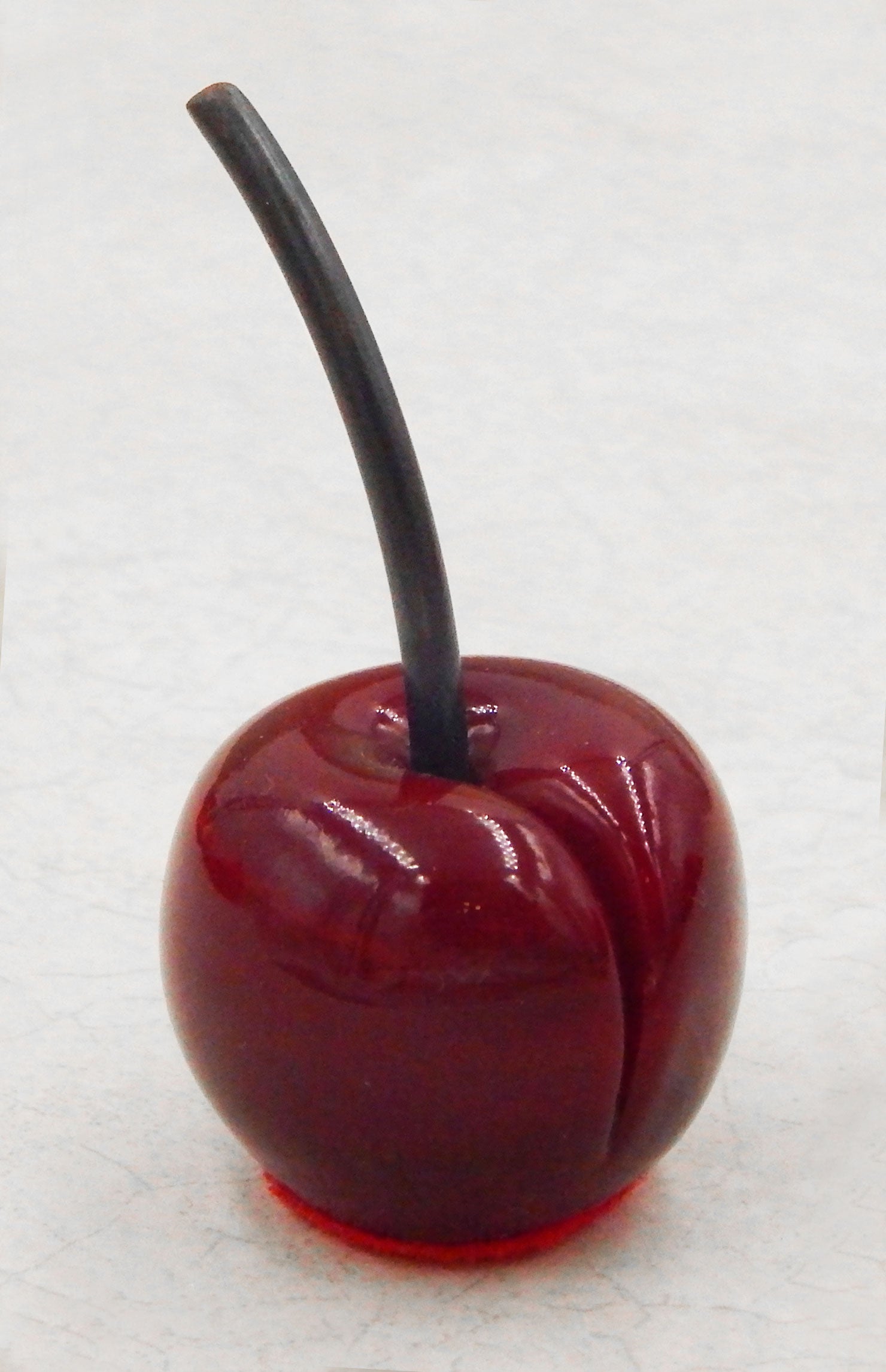 A handmade collectible solid glass deep red cherry created from glass utilizing flameworking techniques. The cherry stem is constructed of dark patinaed copper. Meticulous attention to detail has gone into the construction of each of our pieces to enhance its appeal and collectibility.