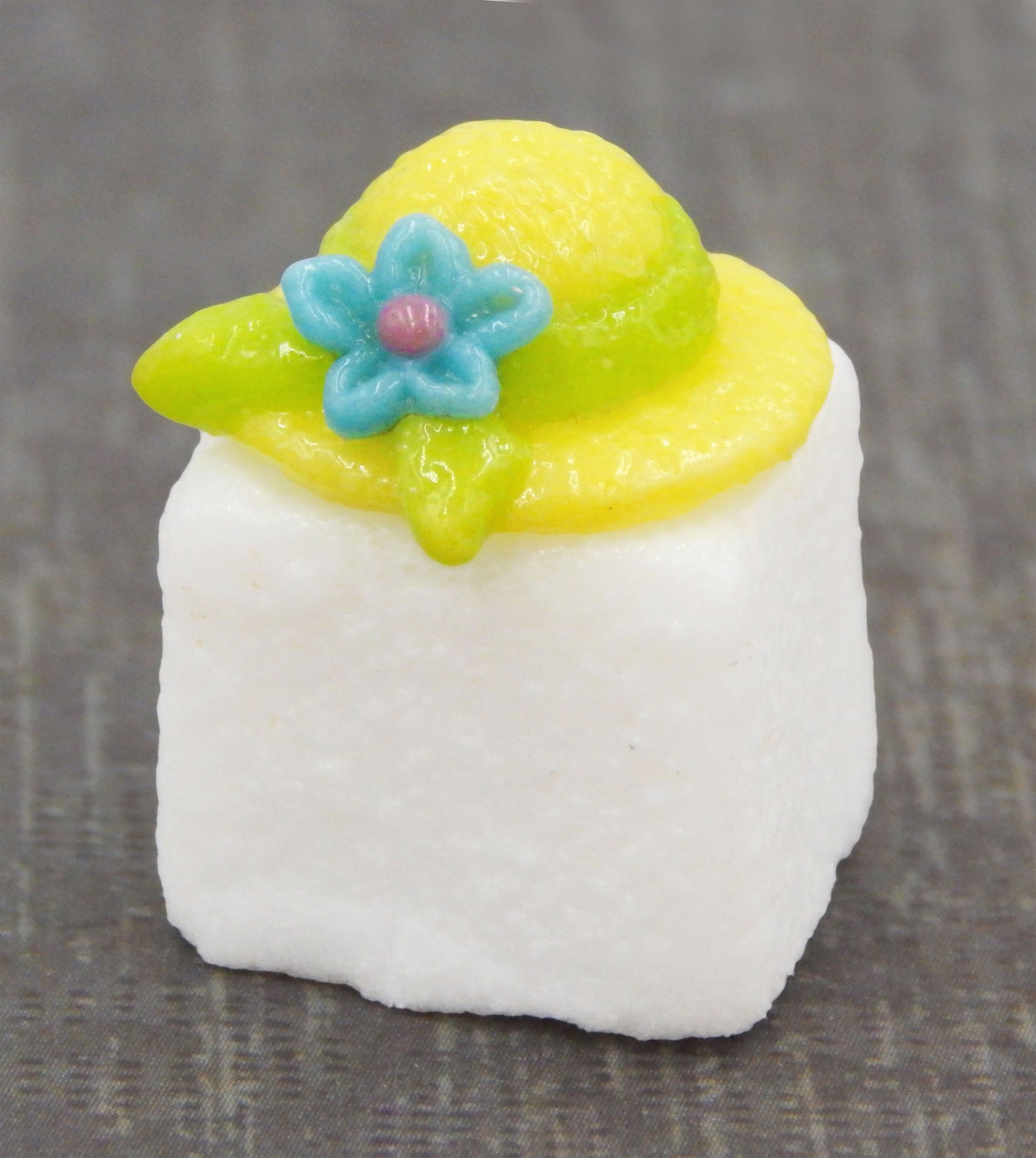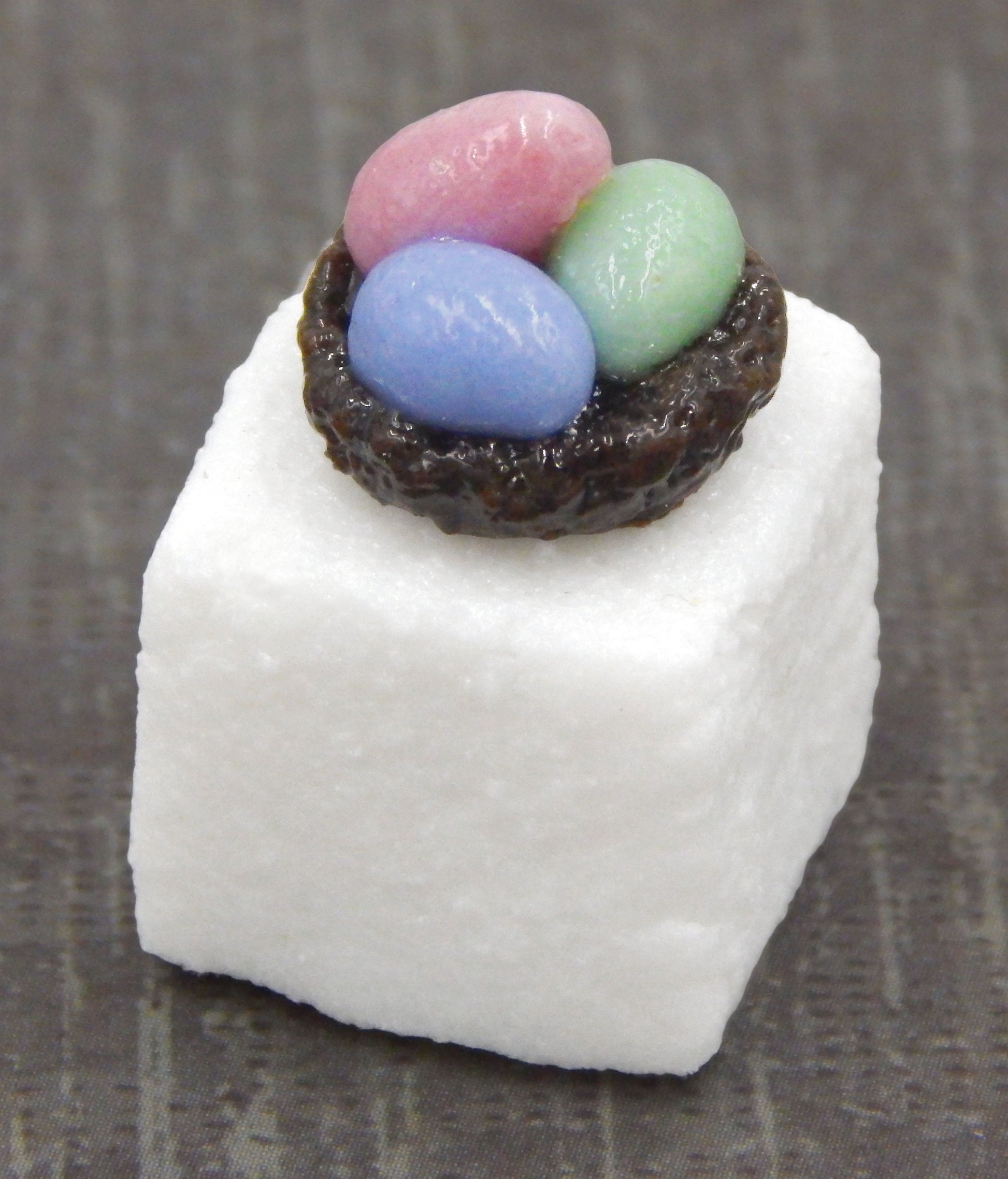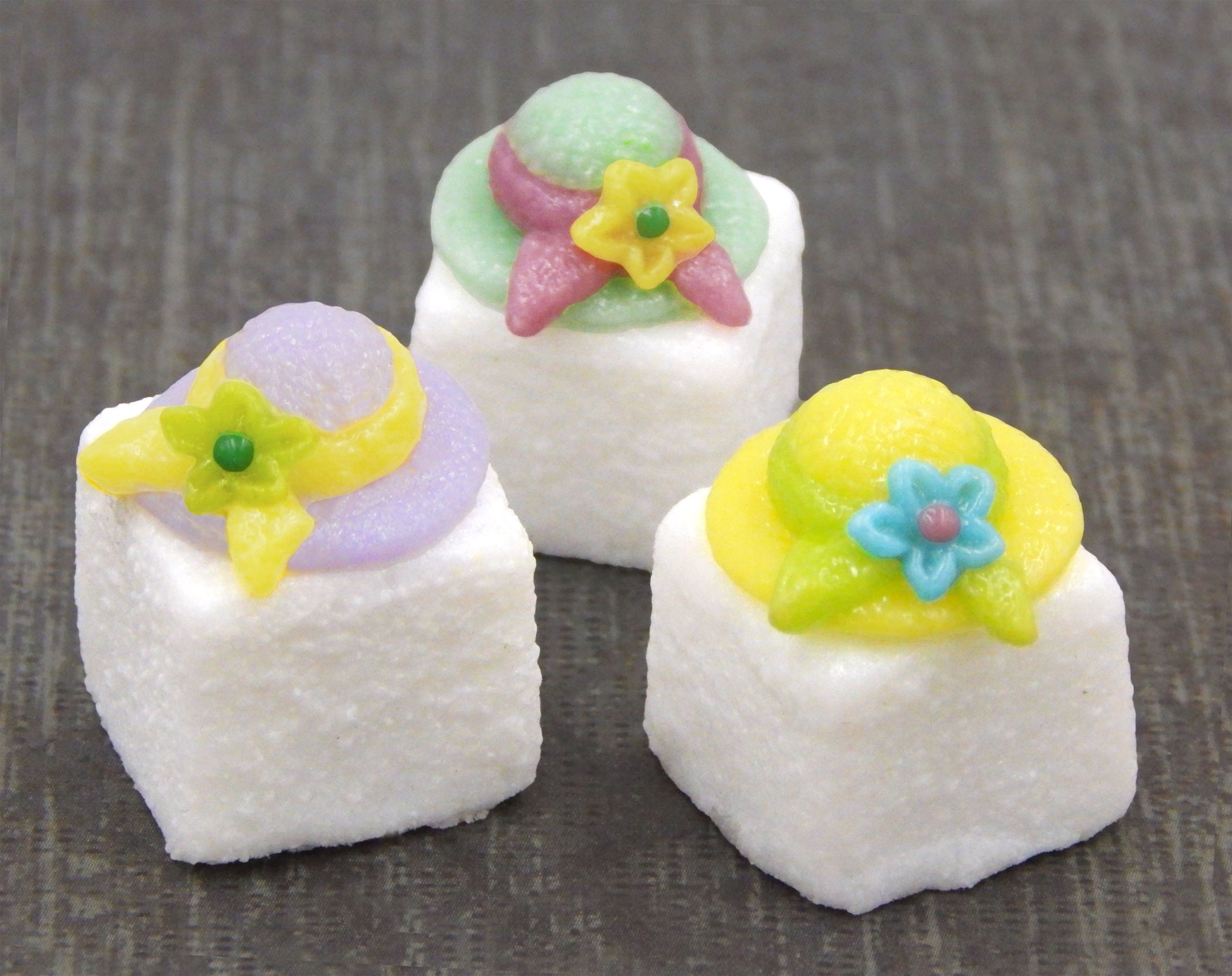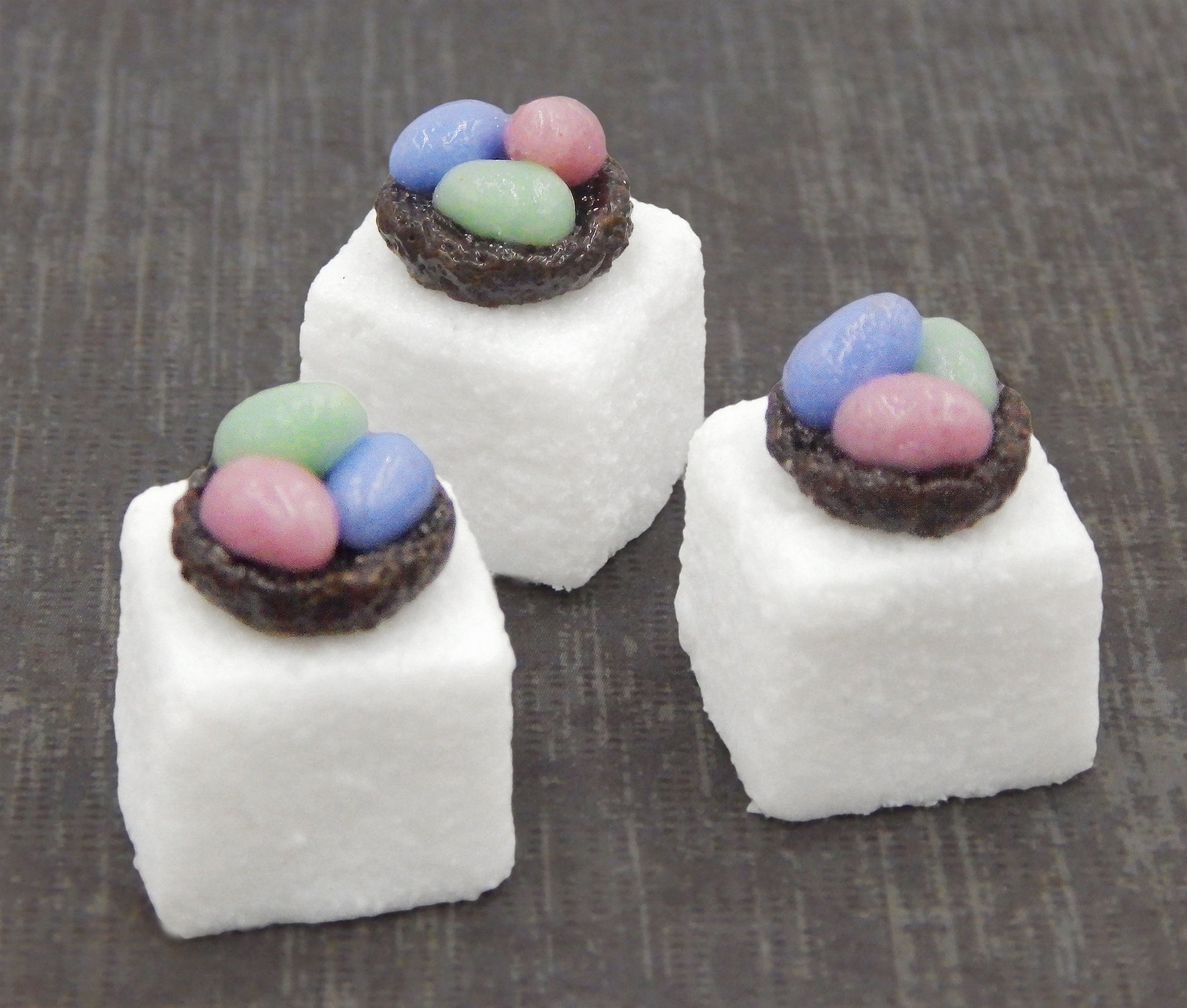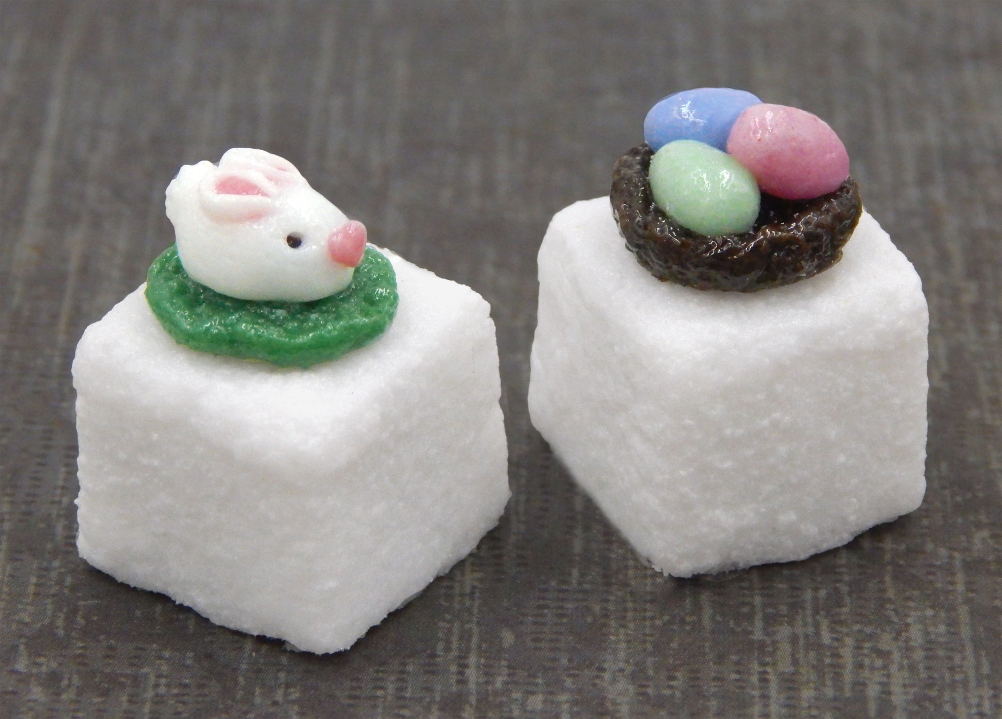 These handmade collectible solid glass sugar cubes with little springtime treats on top are created from finely ground colored glass powders using variations of the centuries old technique of pate de verre. Meticulous attention to detail has gone into the construction of each of our pieces to enhance its appeal and collectibility.