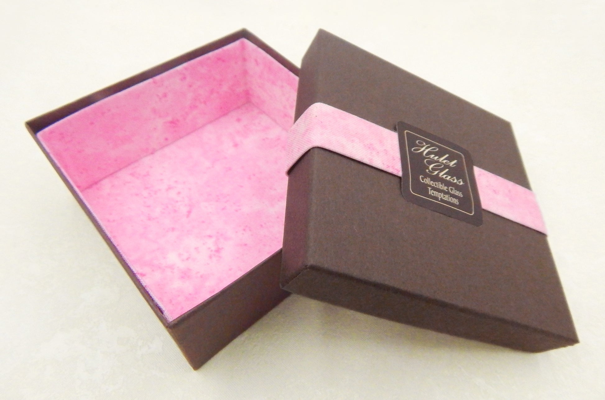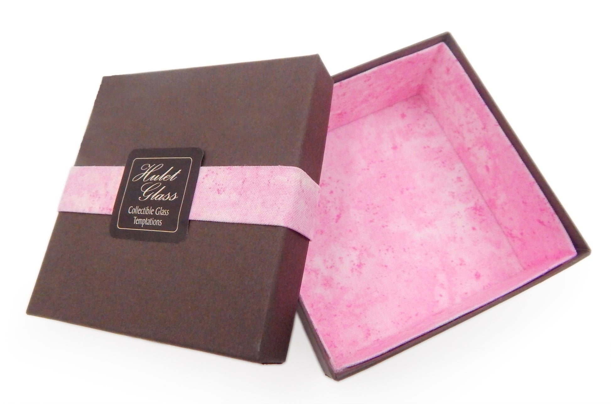 This small box holds 4 to 6 of our glass chocolates and measures 3.75" x 3.75" x 1.5". It is constructed of deep brown rigid double-wall paperboard with a matte finish. It is lined with 100% cotton fabric that is pink in color.