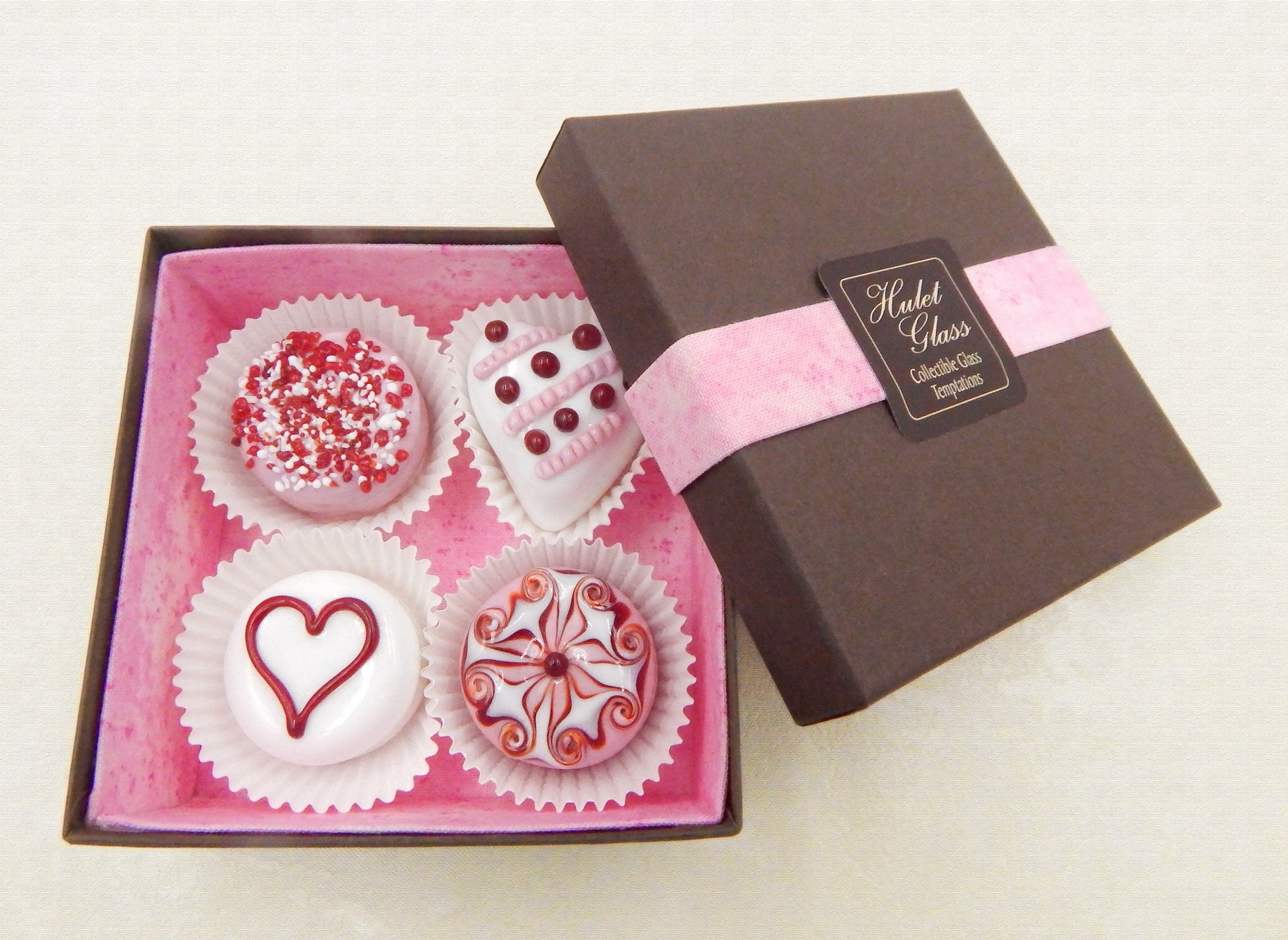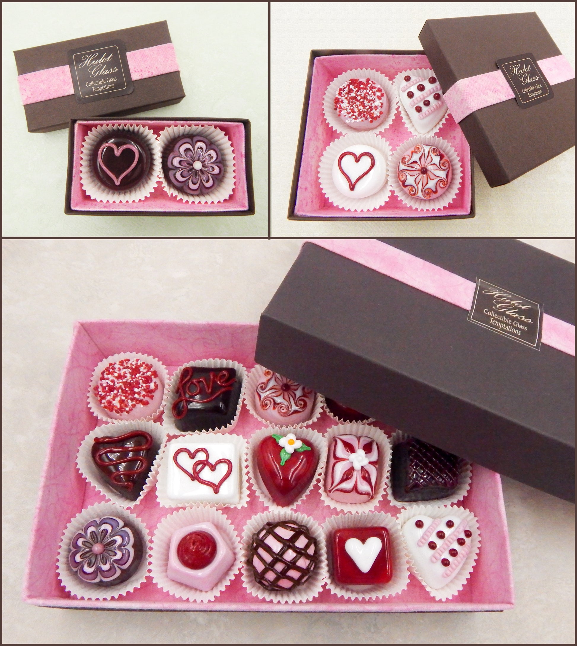 These boxes are created by the Hulet sisters to frame the glass chocolates and securely protect them for years to come. Meticulous attention to detail has gone into the construction of each of our creations to enhance its appeal and collectibility.