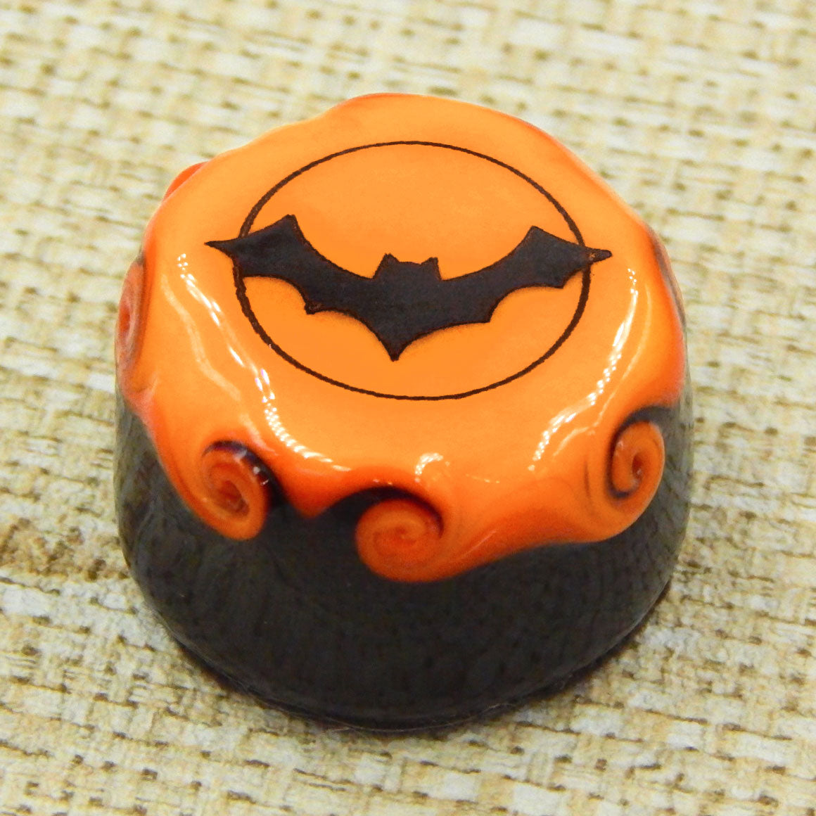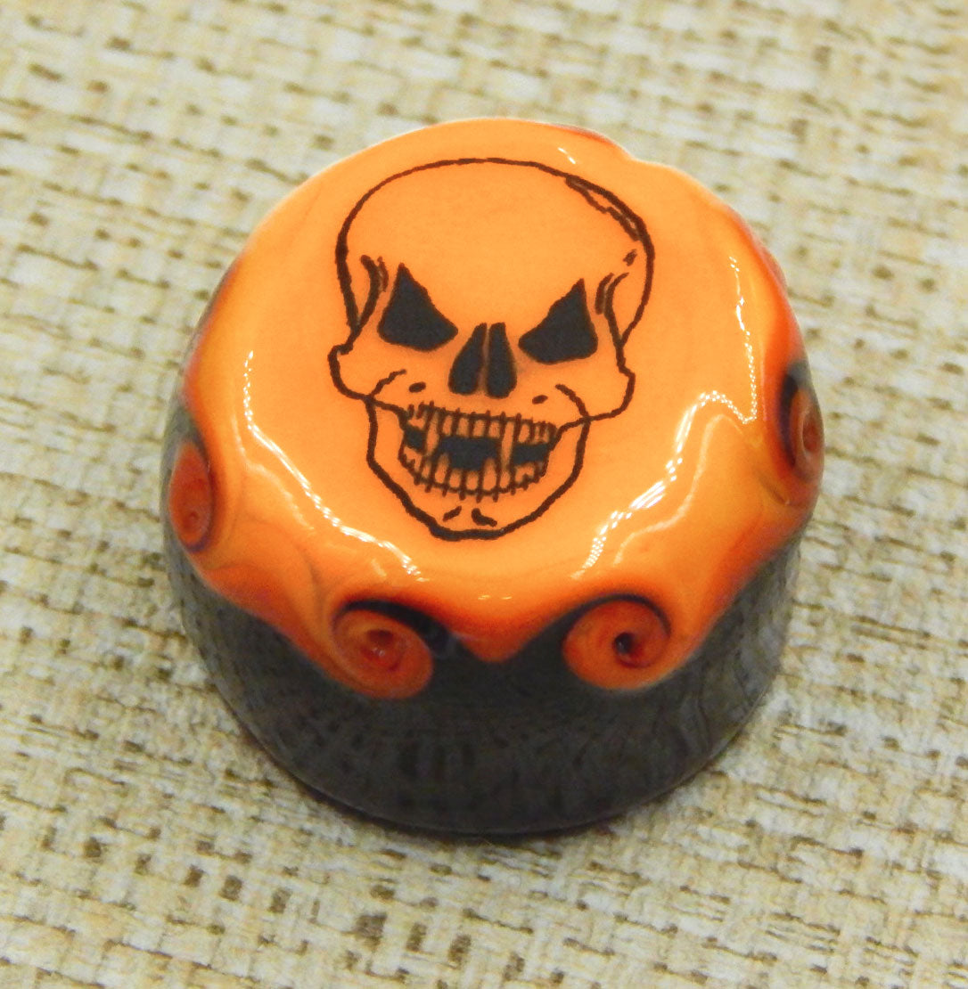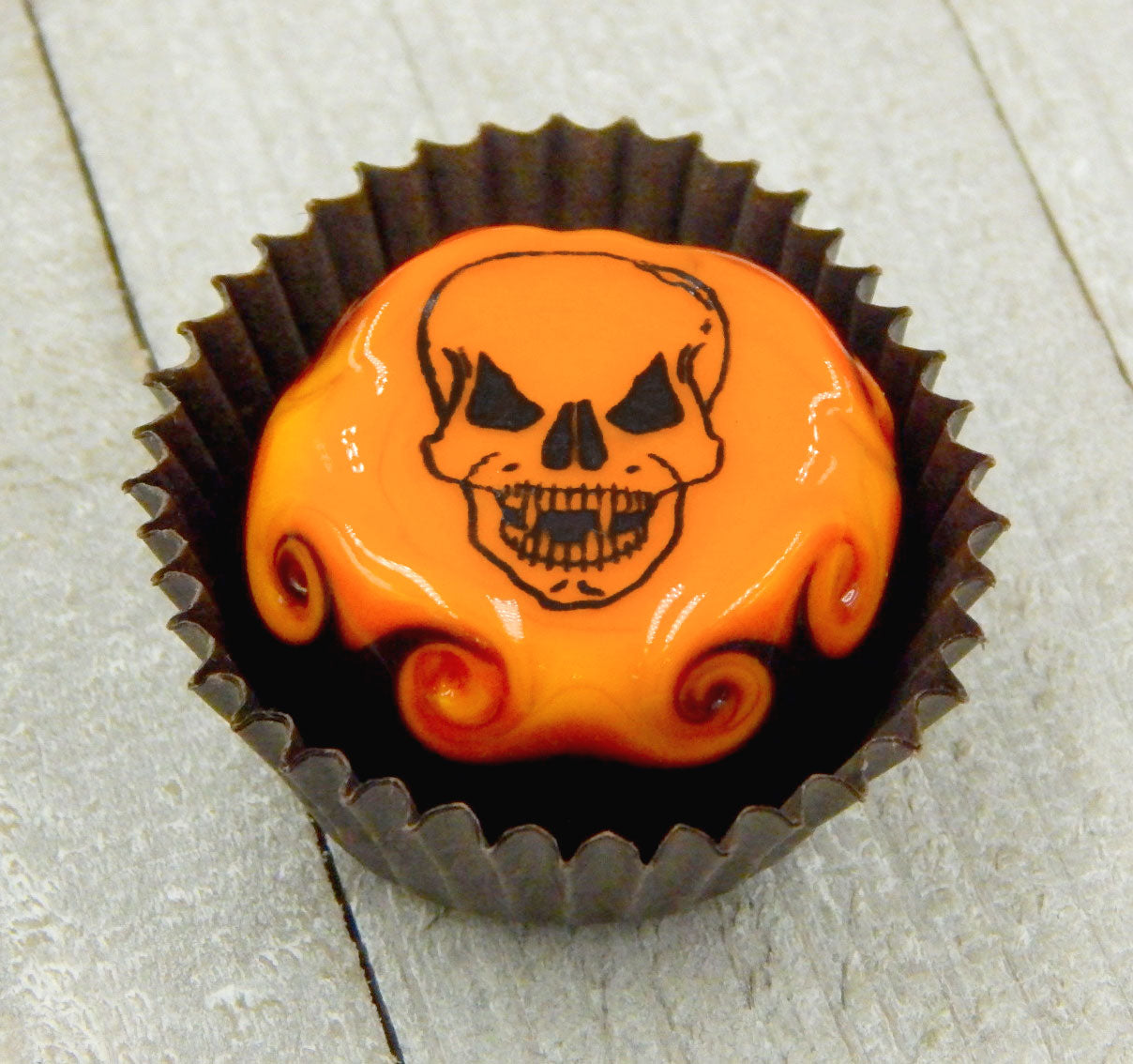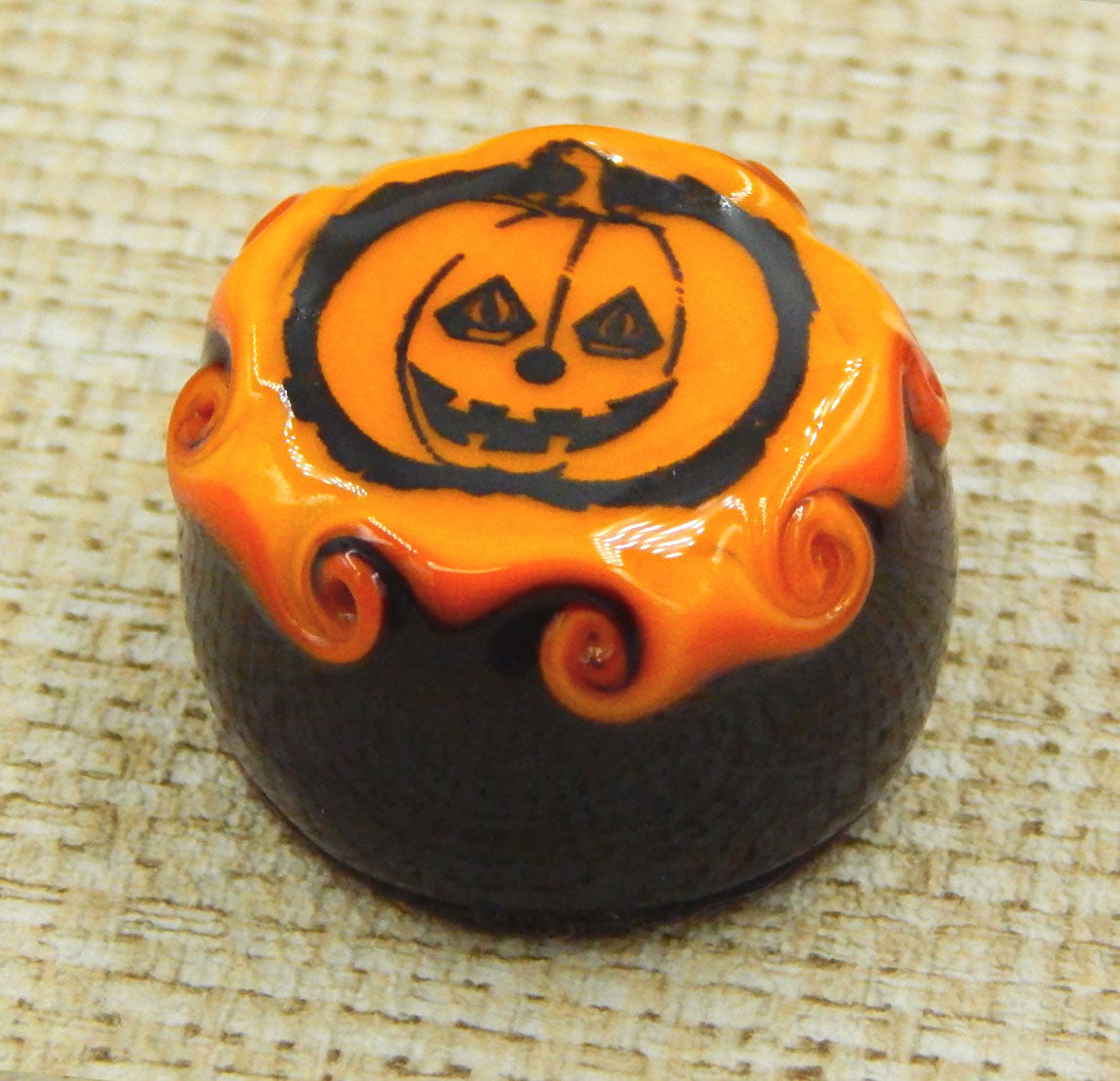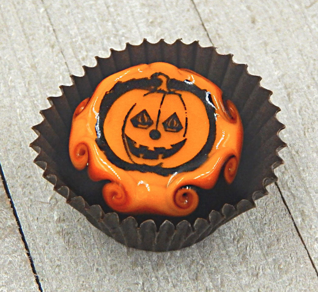 A handmade collectible solid glass chocolate topped with a layer of mango and a scary Halloween silhouette. This glass chocolate is created from colorful glass utilizing flameworking techniques. Meticulous attention to detail has gone into the construction of each of our pieces to enhance its appeal and collectibility.