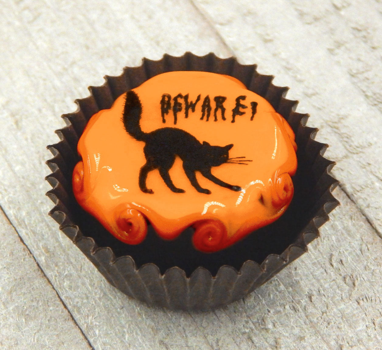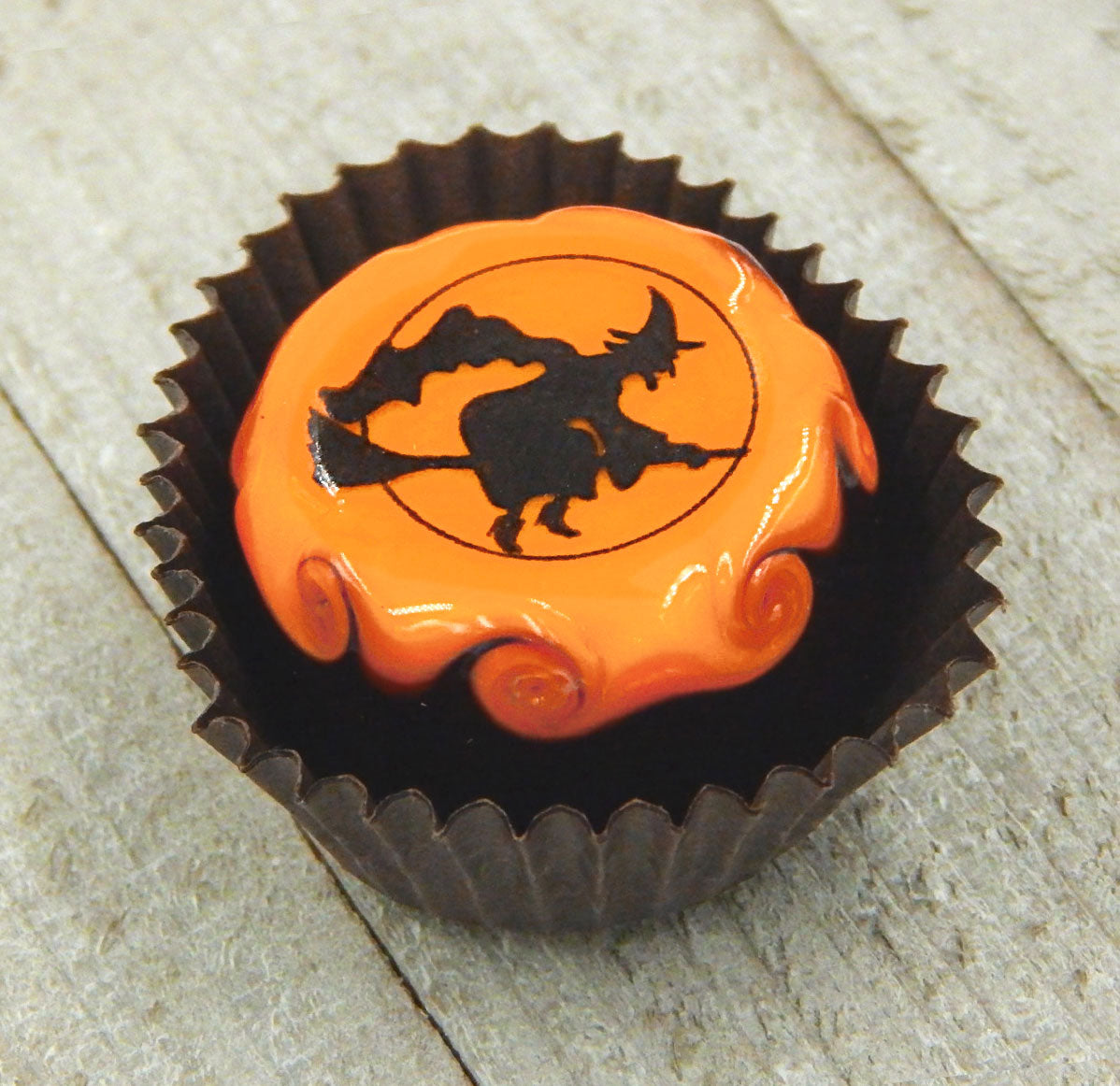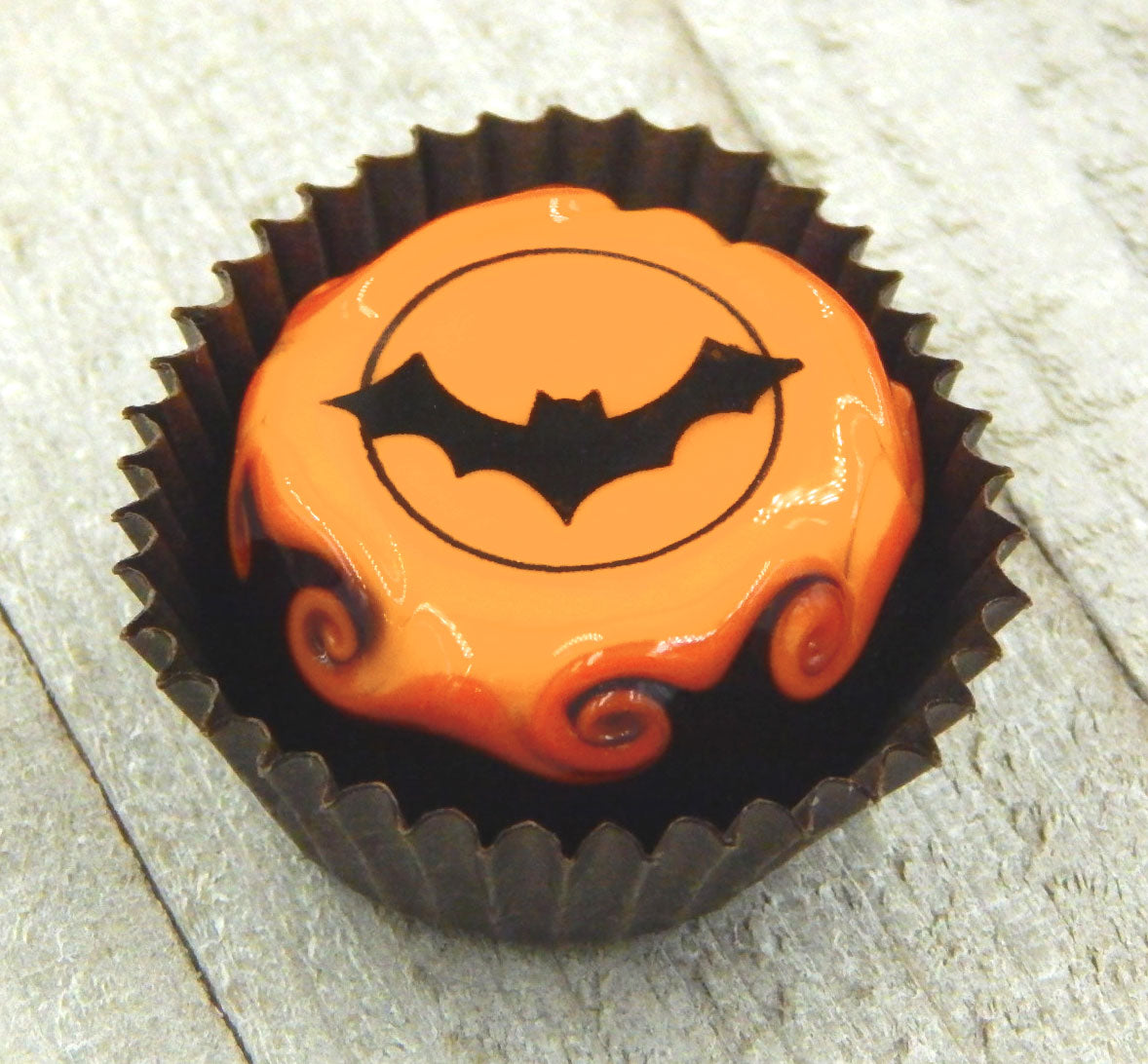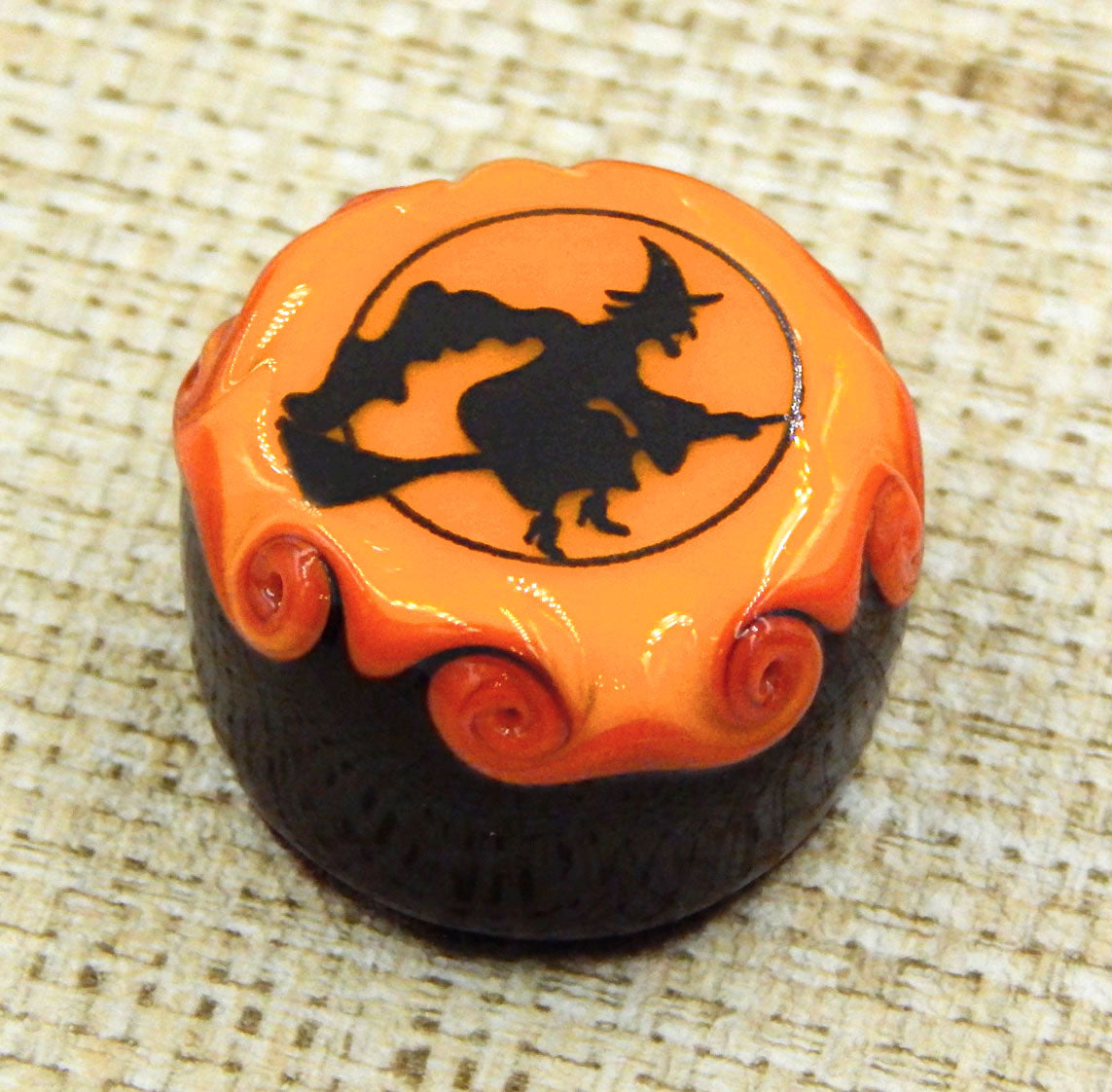 A handmade collectible solid glass chocolate topped with a layer of mango and a scary Halloween silhouette. This glass chocolate is created from colorful glass utilizing flameworking techniques. Meticulous attention to detail has gone into the construction of each of our pieces to enhance its appeal and collectibility.