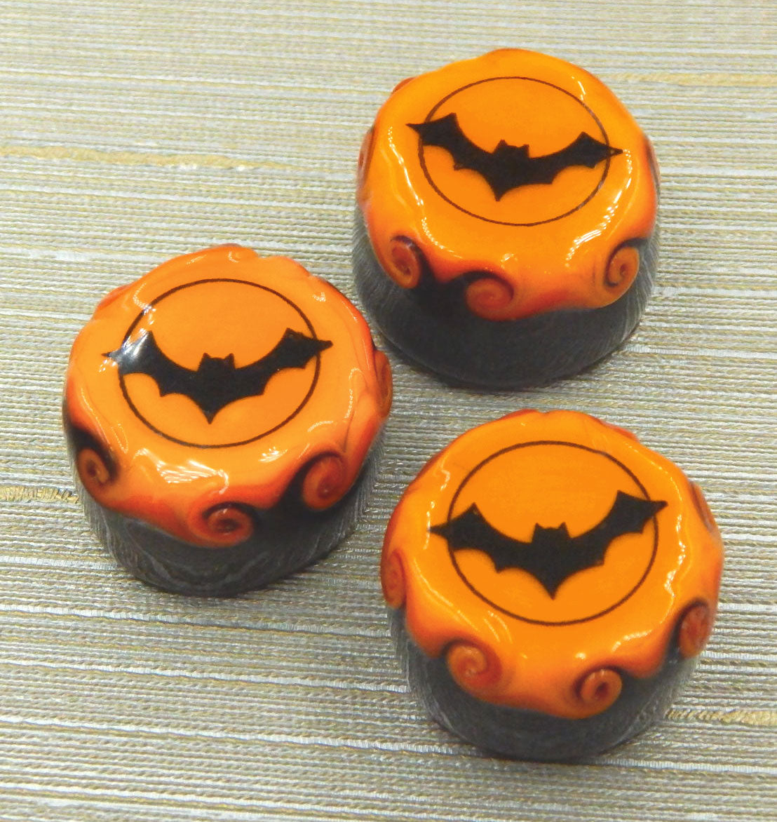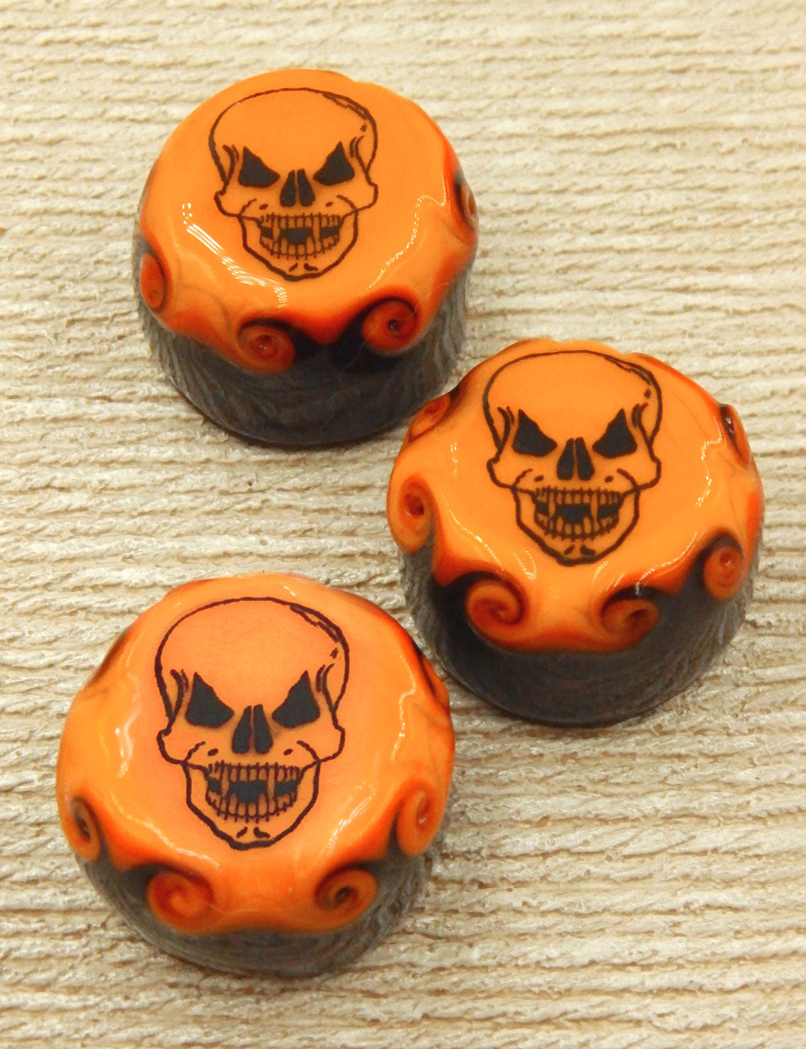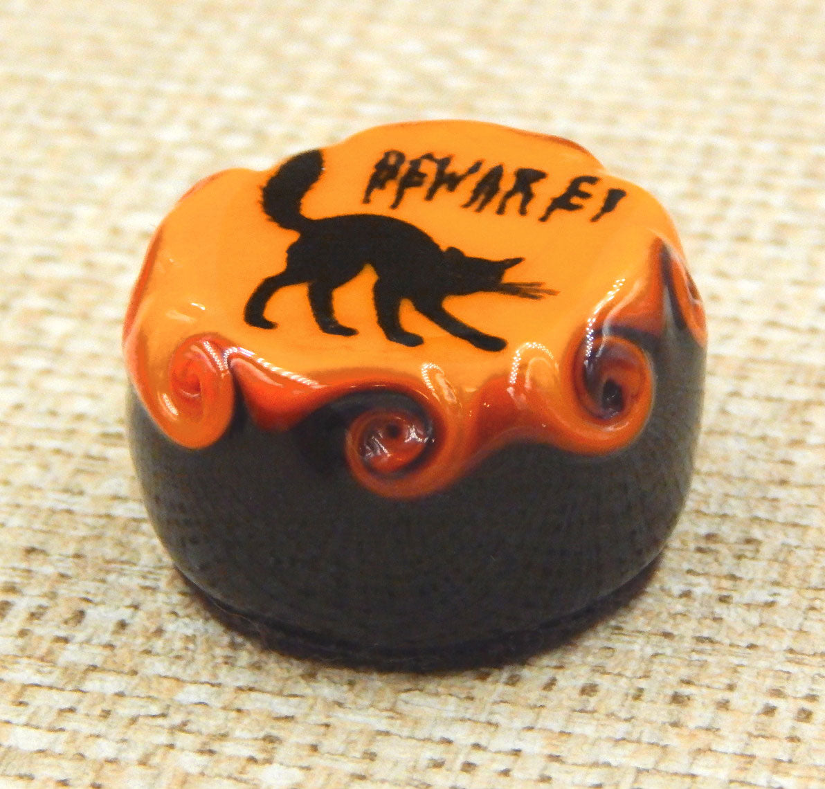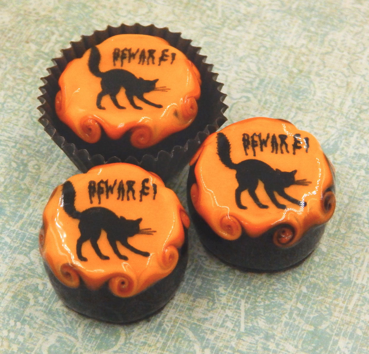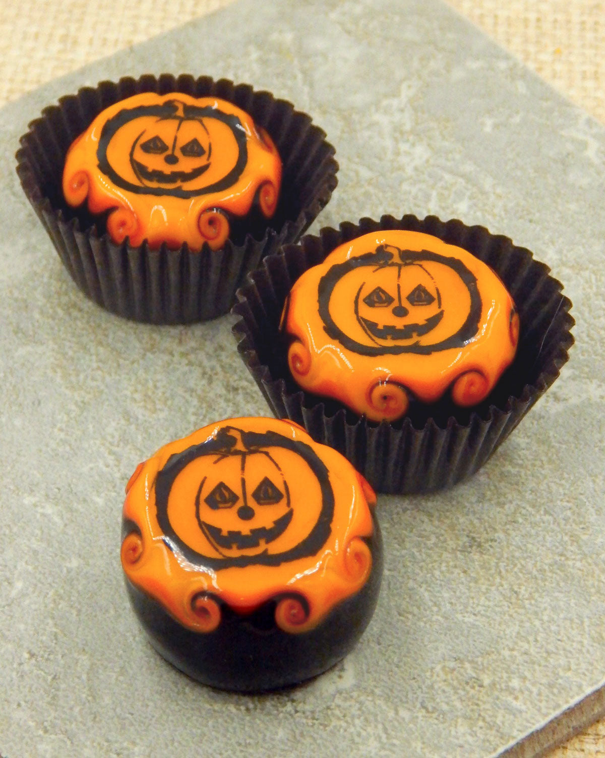 A handmade collectible solid glass chocolate topped with a layer of mango and a scary Halloween silhouette. This glass chocolate is created from colorful glass utilizing flameworking techniques. Meticulous attention to detail has gone into the construction of each of our pieces to enhance its appeal and collectibility.