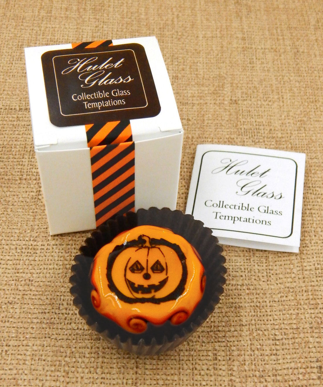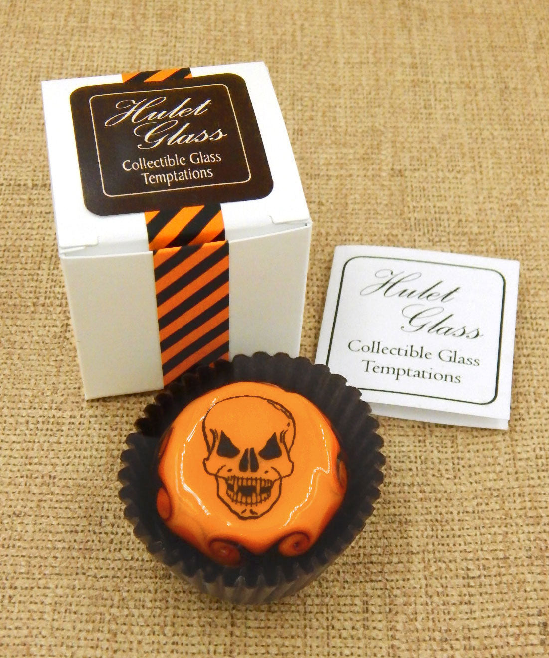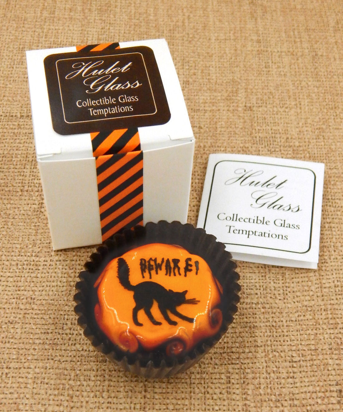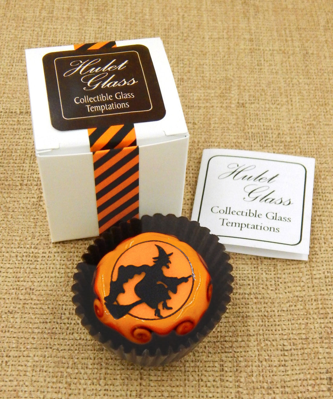 The glass chocolate measures approx. 1.25" x 1.25" (slightly larger than an actual chocolate candy) and sits in a fluted glassine paper candy cup. The bottom of the chocolate is covered in felt to protect the surface it will sit upon. Each beautiful glass chocolate is signed (Hulet), dated and comes to you in a colorful gift box with an enclosure card telling a bit about the piece.