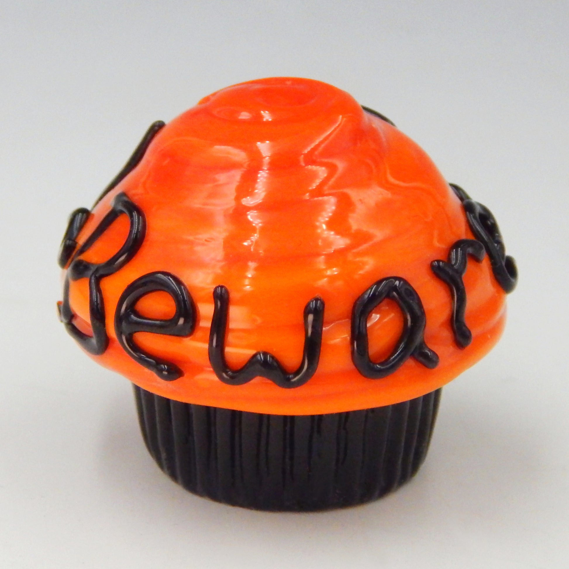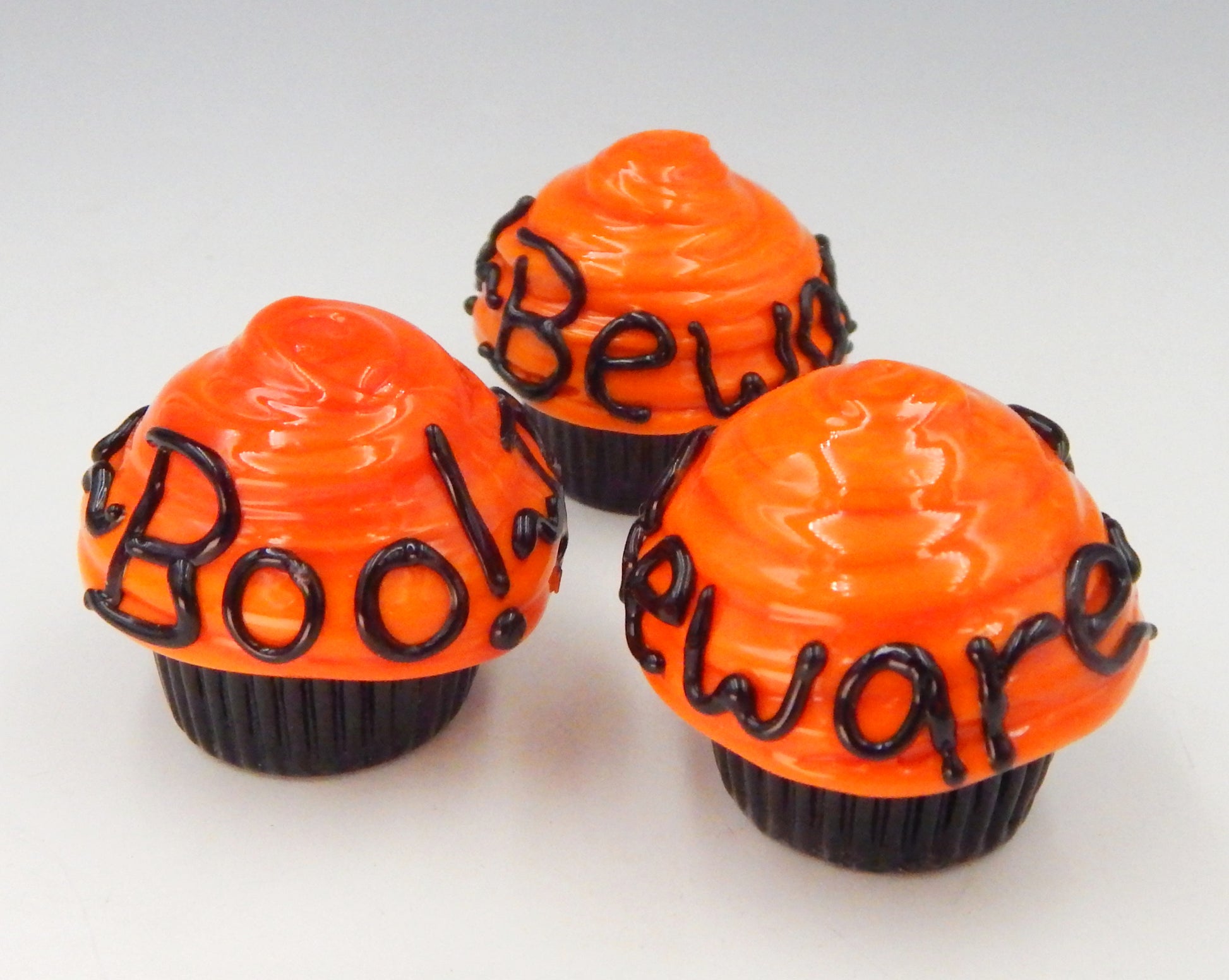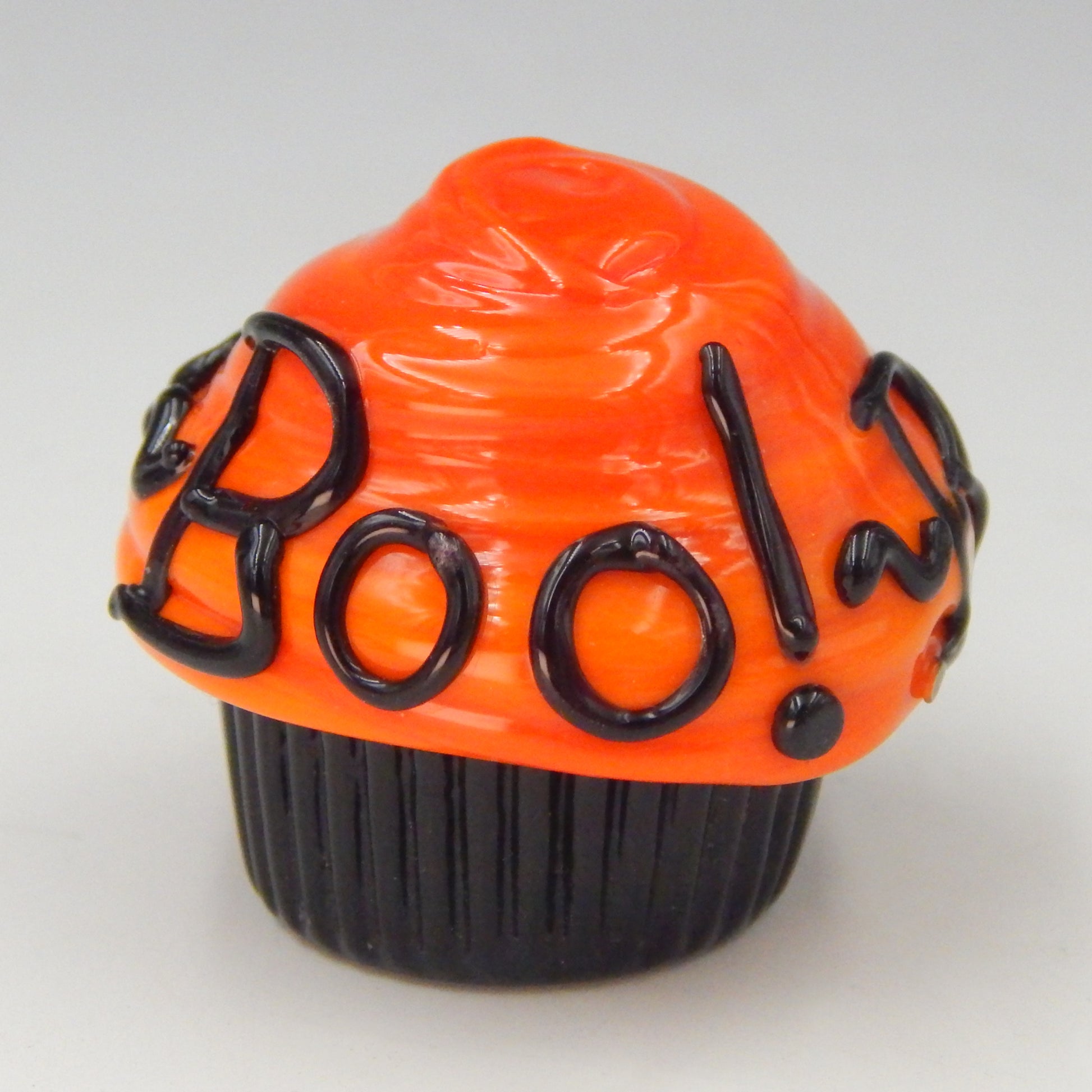 A handmade collectible solid glass Mini Halloween Boo!~Beware Cupcake Truffle created from colorful glass utilizing flameworking techniques. Meticulous attention to detail has gone into the construction of each of our pieces to enhance its appeal and collectability.