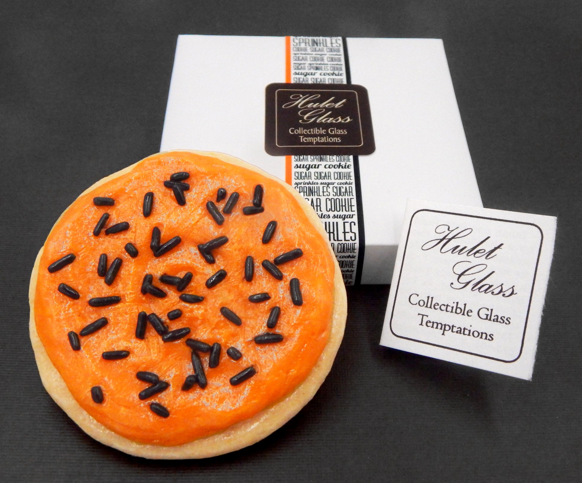 A handmade collectible solid glass Halloween sugar cookie with orange icing and licorice sprinkles crafted from colorful glass utilizing ancient pate de verre and flameworking techniques. Meticulous attention to detail has gone into the construction of each of our pieces to enhance its appeal and collectibility.