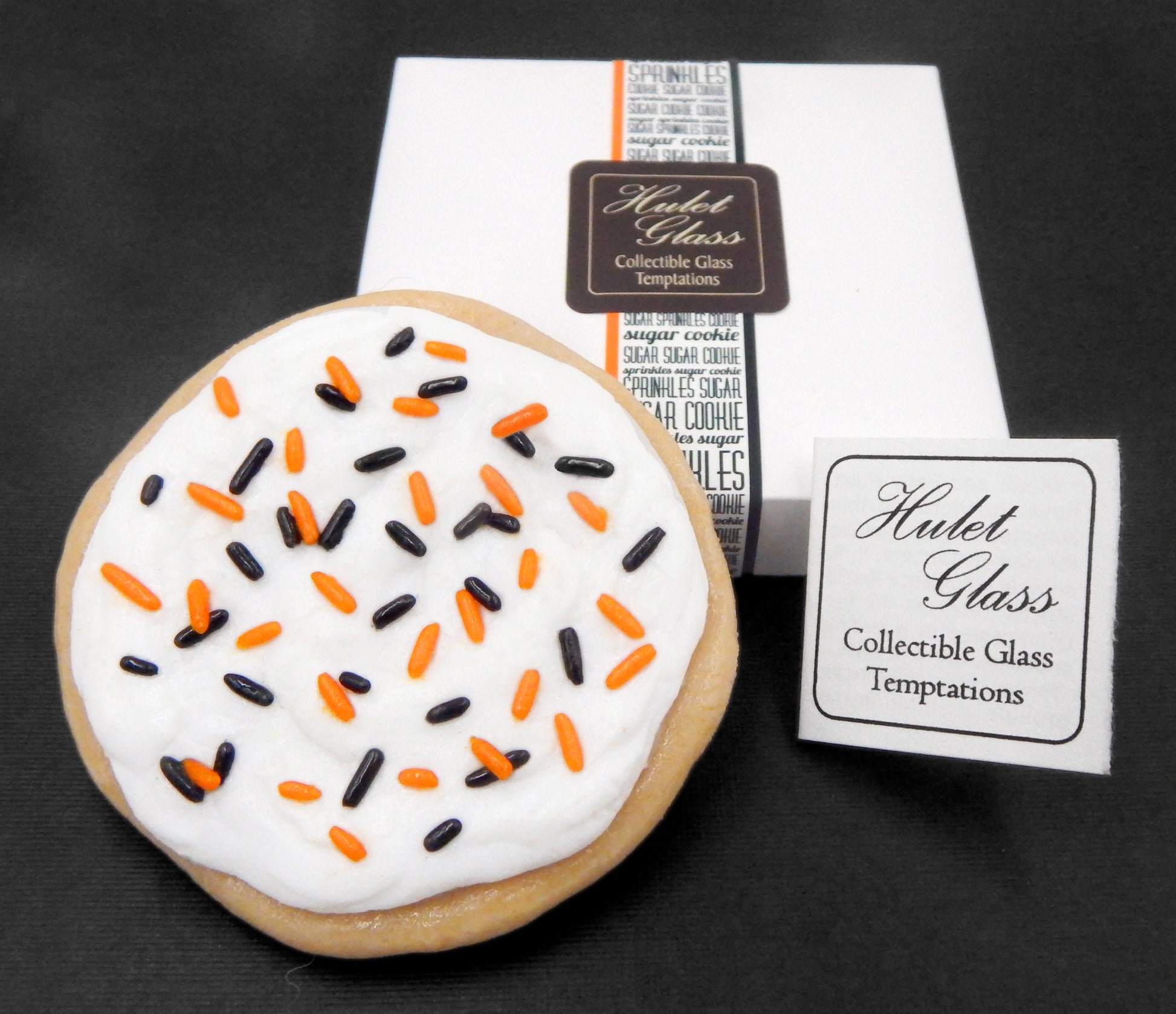 A handmade collectible solid glass Halloween sugar cookie with white icing topped with licorice and orange sprinkles and crafted from colorful glass utilizing ancient pate de verre and flameworking techniques. Meticulous attention to detail has gone into the construction of each of our pieces to enhance its appeal and collectibility.