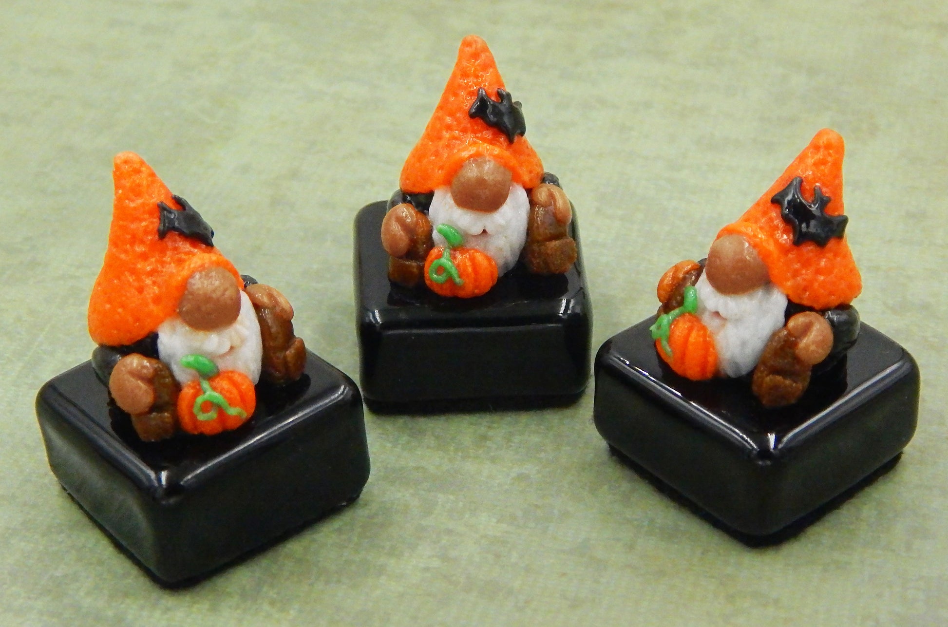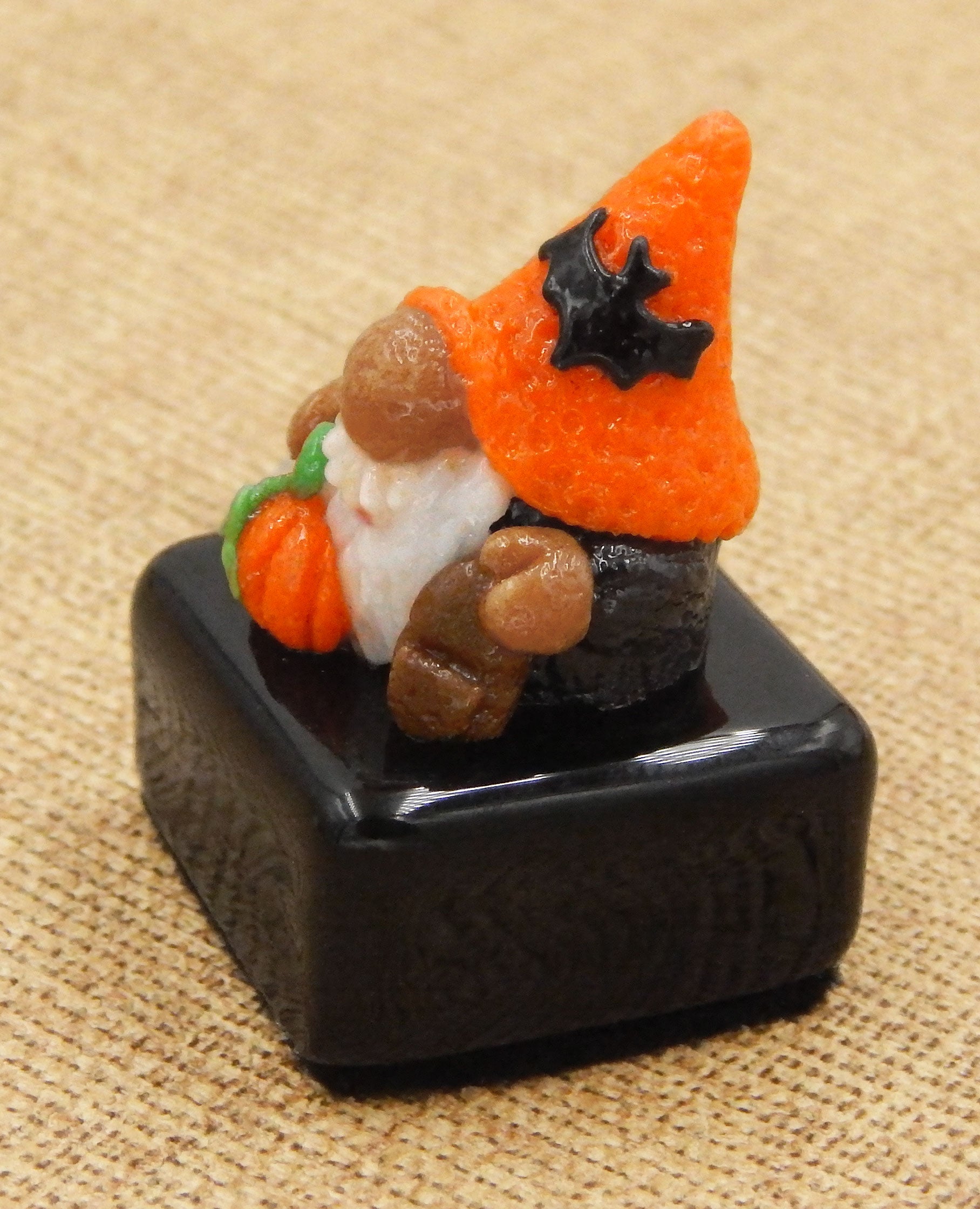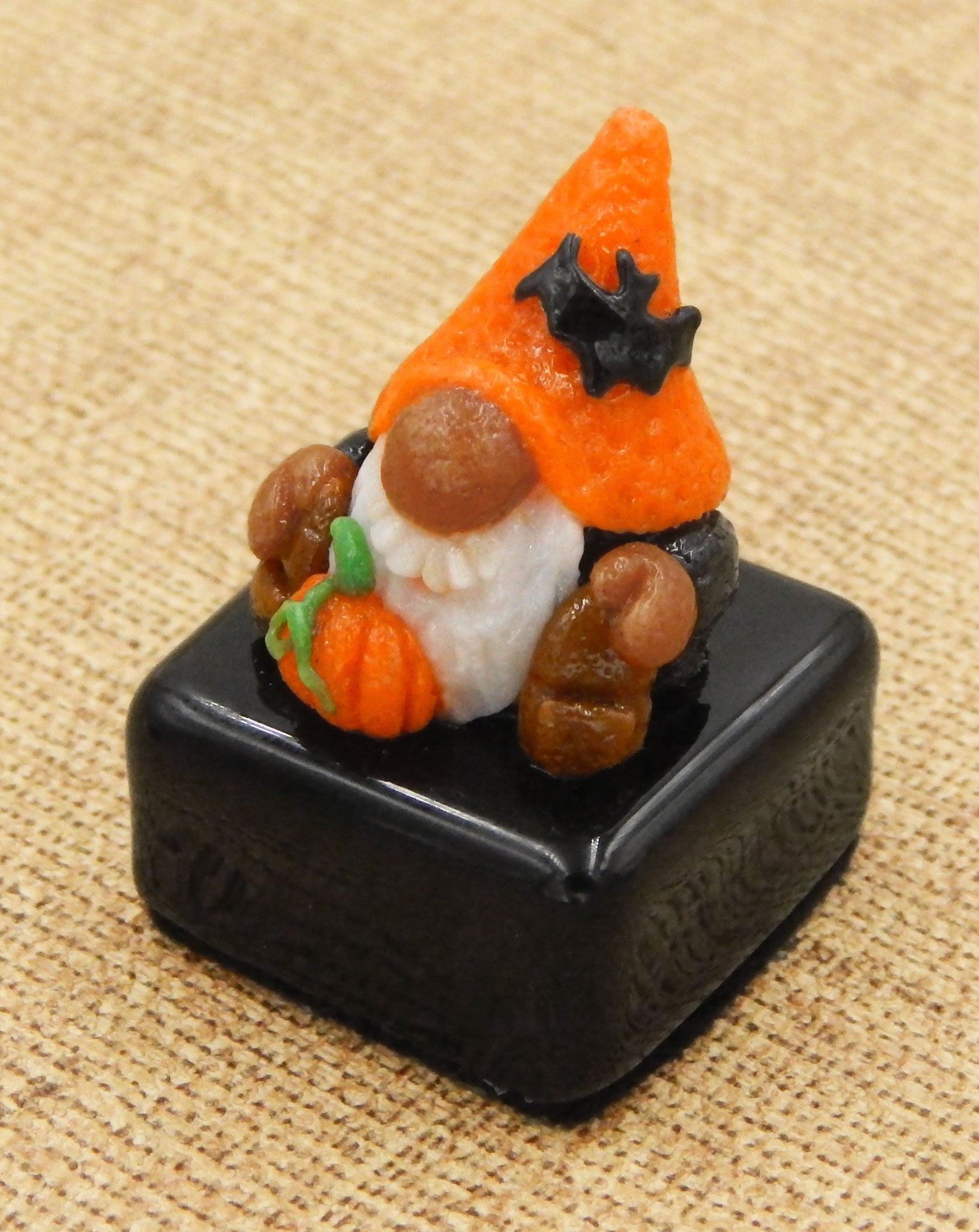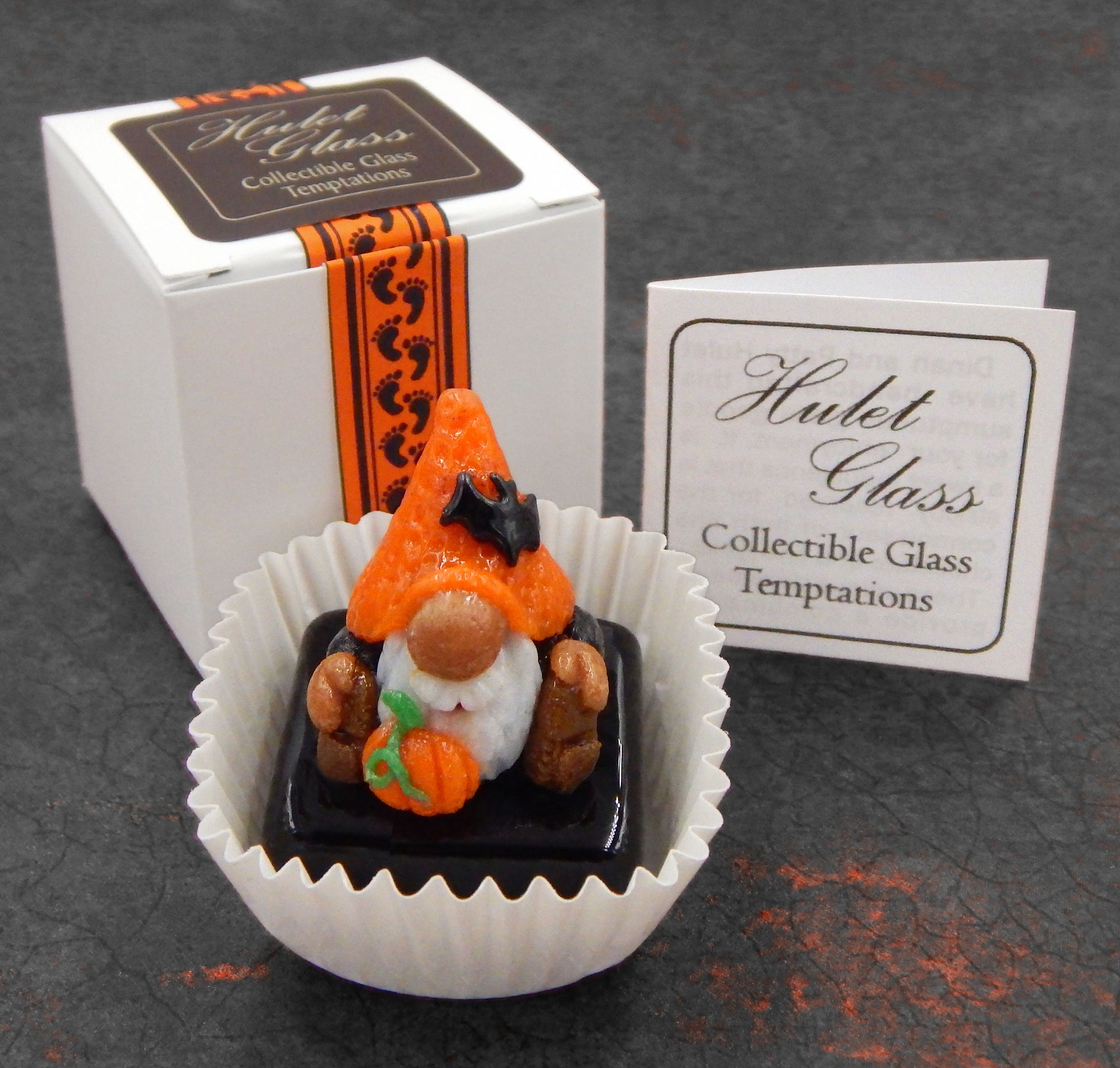 A handmade collectible solid glass Halloween petit four chocolate with a cute little gnome wearing his bat hat created from colorful glass utilizing ancient pate de verre and lampworking techniques. Meticulous attention to detail has gone into the construction of each of our pieces to enhance its appeal and collectibility.