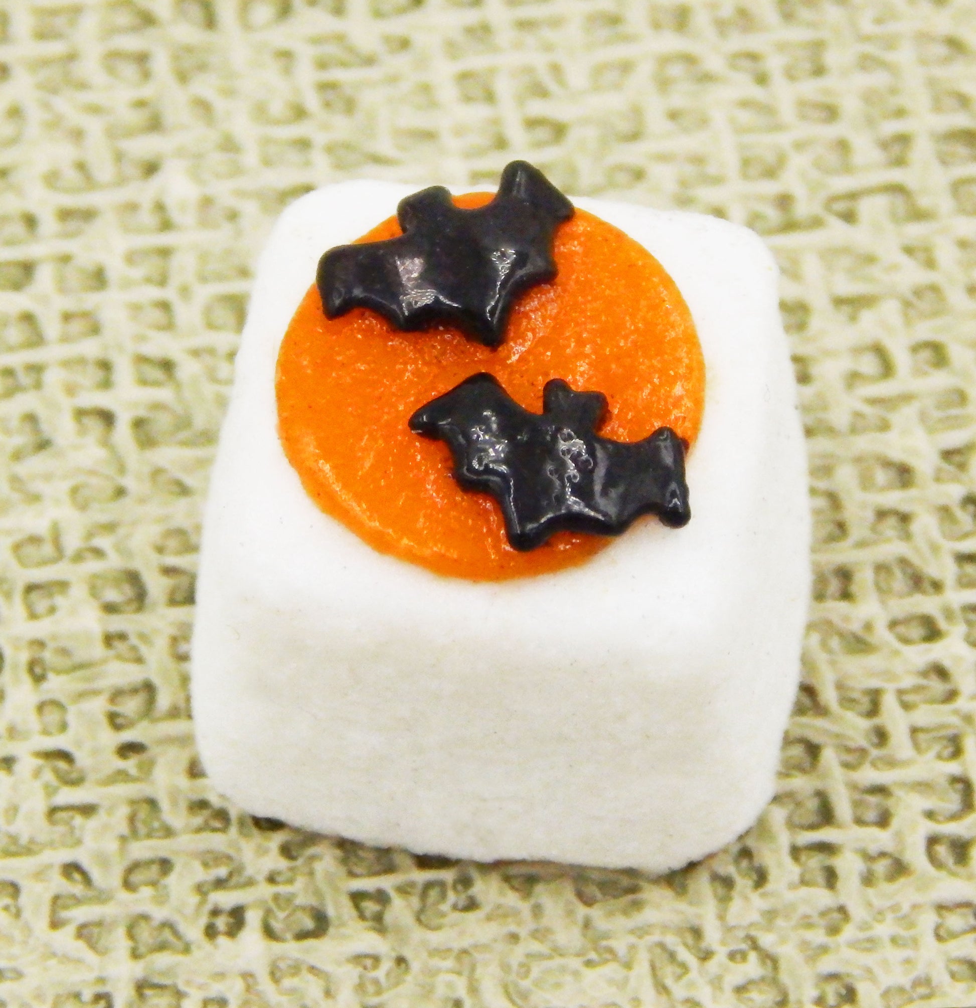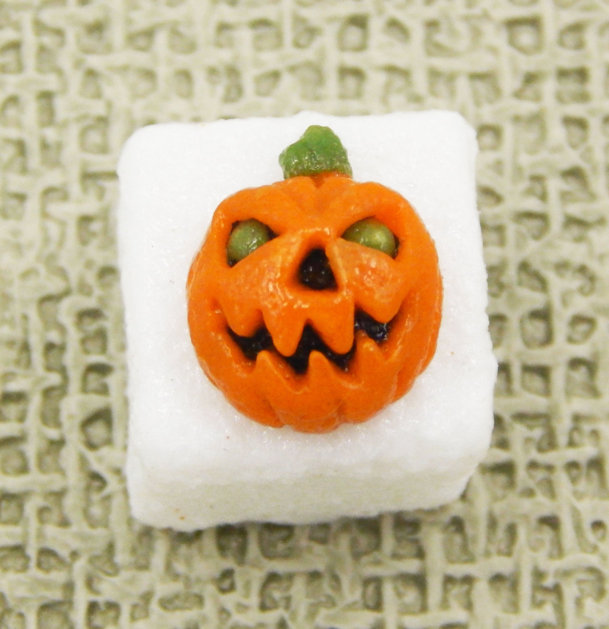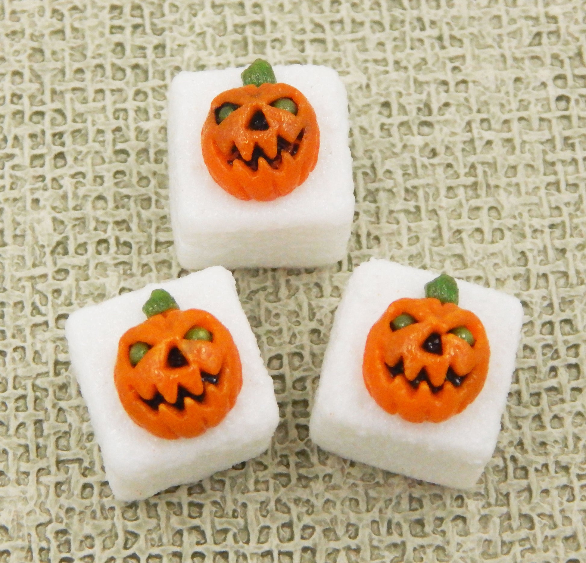 These handmade collectible solid glass sugar cubes with little Halloween treats on top are created from finely ground colored glass powders using variations of the centuries old technique of pate de verre. Meticulous attention to detail has gone into the construction of each of our pieces to enhance its appeal and collectibility.