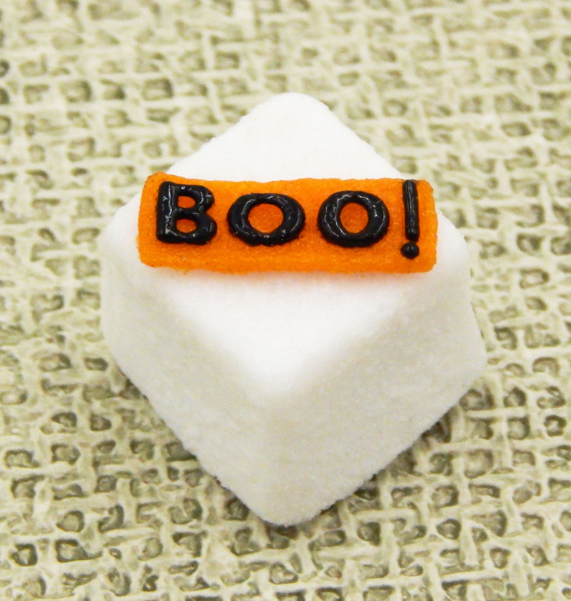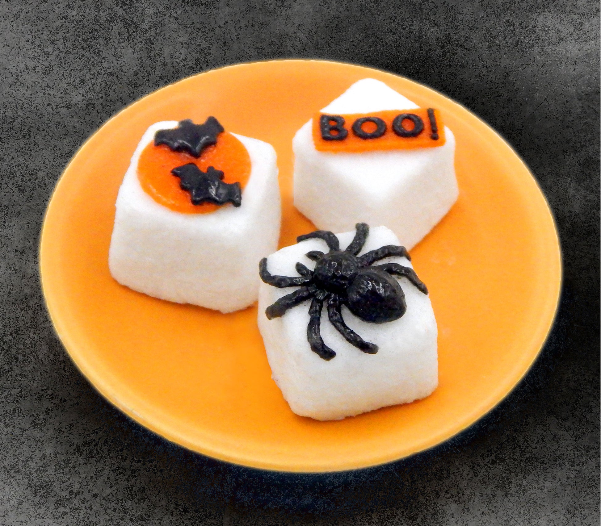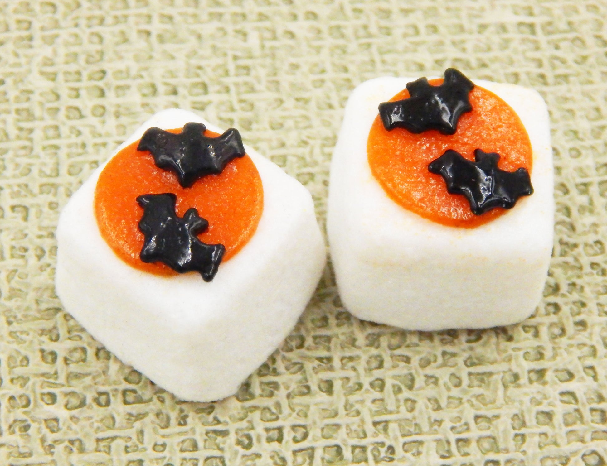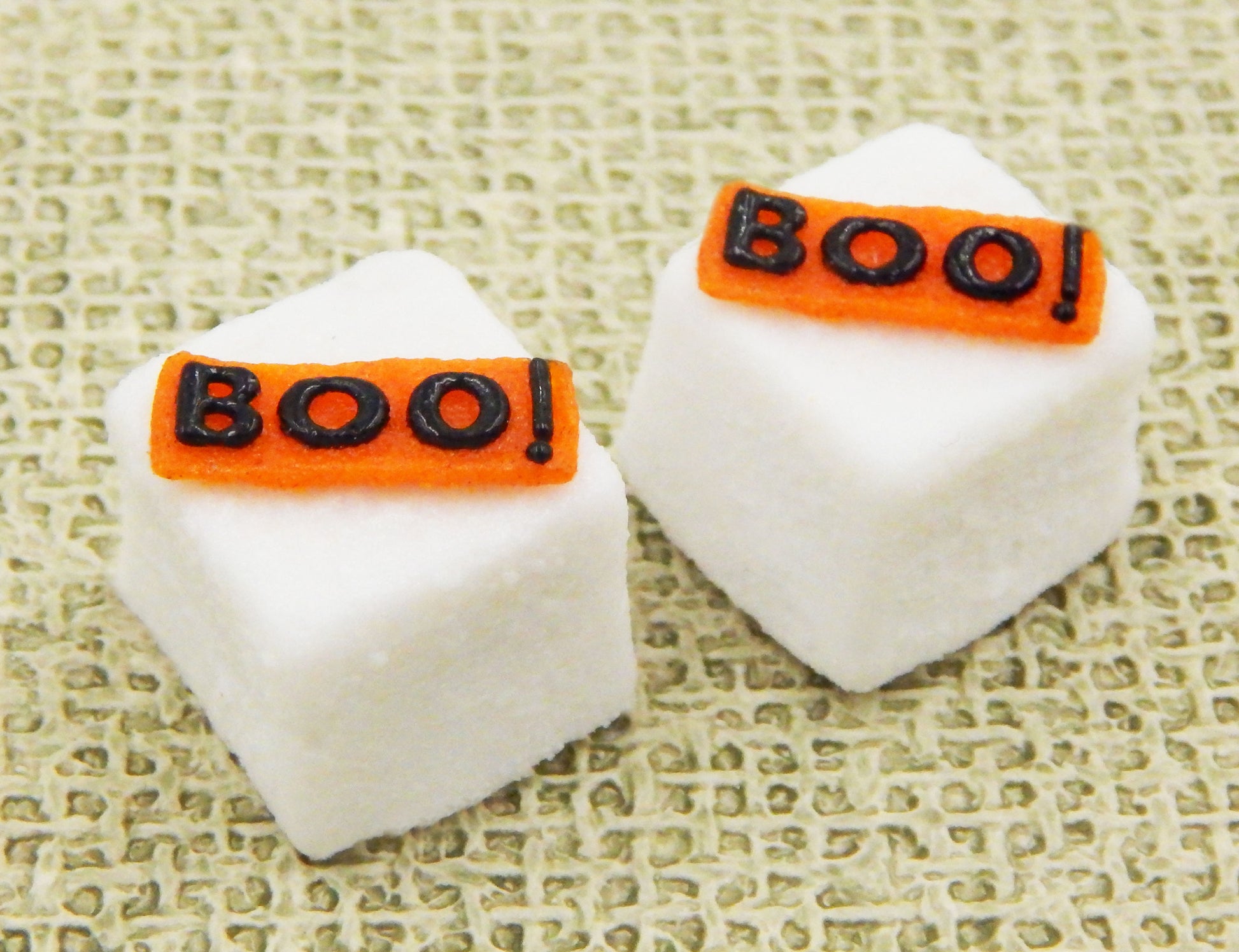 These handmade collectible solid glass sugar cubes with little Halloween treats on top are created from finely ground colored glass powders using variations of the centuries old technique of pate de verre. Meticulous attention to detail has gone into the construction of each of our pieces to enhance its appeal and collectibility.