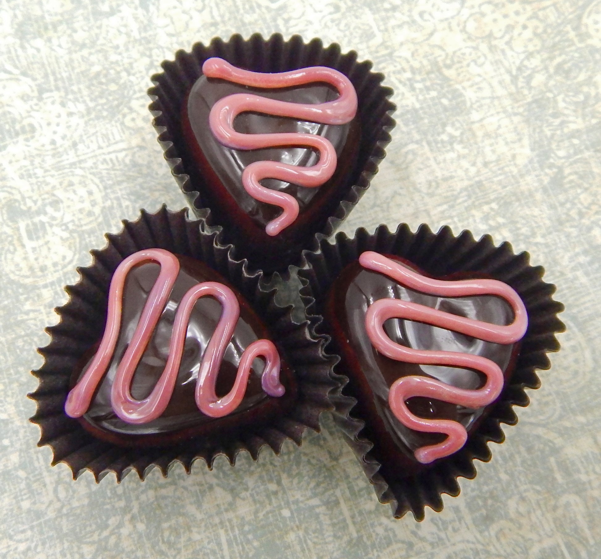 These inedible chocolates are from our 'Hearts & Flowers Collection' and are among our many chocolate treats. We design our art glass delicacies to evoke memories of innocence, love and happy times. These pieces are created to tease, seduce, tempt and delight. Use them to create a unique display in a favorite heirloom dish or cabinet for your home or office. They are also perfect and thoughtful gifts for yourself or your friends.
