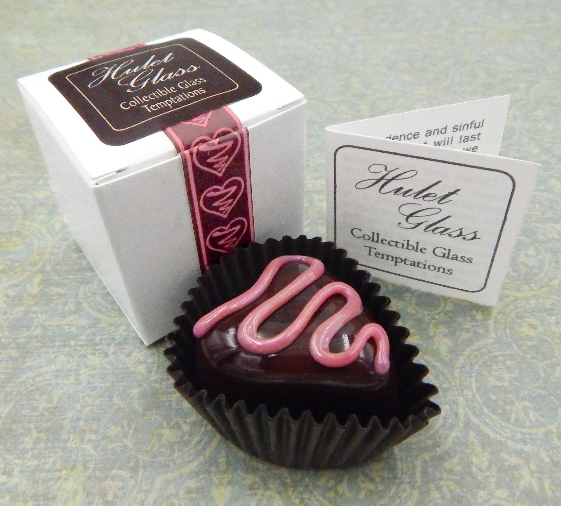 The glass chocolate measures approximately 1.25" diameter x 1" tall (slightly larger than an actual chocolate candy) and sits in a fluted glassine paper candy cup. The bottom of the chocolate is covered in felt to protect the surface it will sit upon. Each beautiful glass chocolate is signed (Hulet), dated and comes to you in a colorful gift box with an enclosure card telling a bit about the piece.