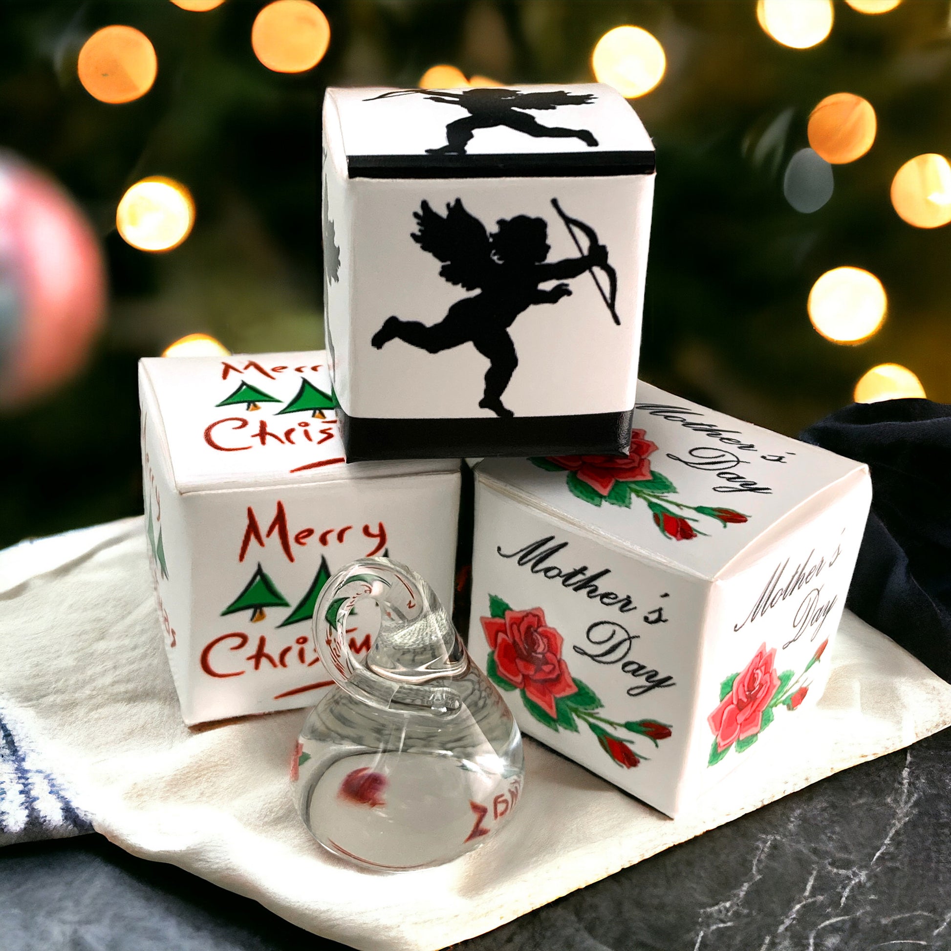 A collectible signed & dated solid glass chocolate drop, elegantly packaged in a holiday gift box of your choice, crafted from transparent glass using flameworking techniques. Each chocolate drop includes a top loop, allowing for the attachment of a vibrant ribbon or necklace chain.