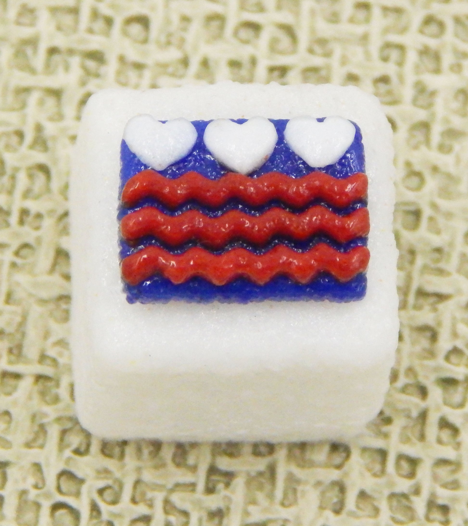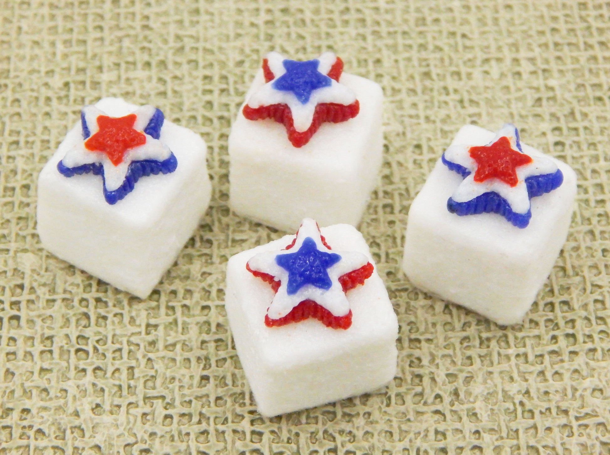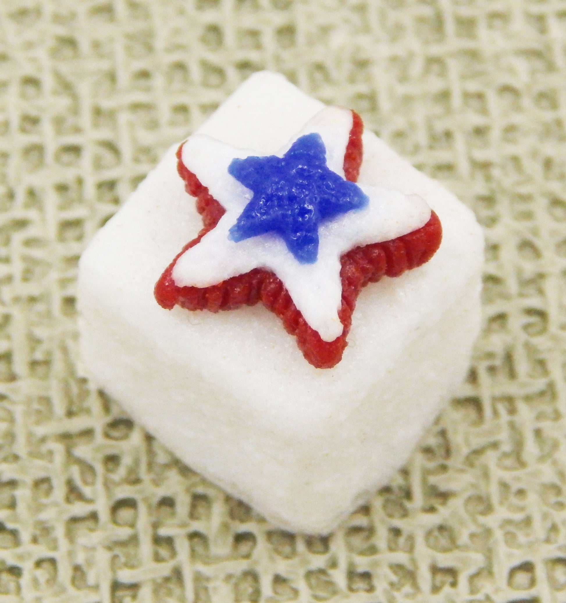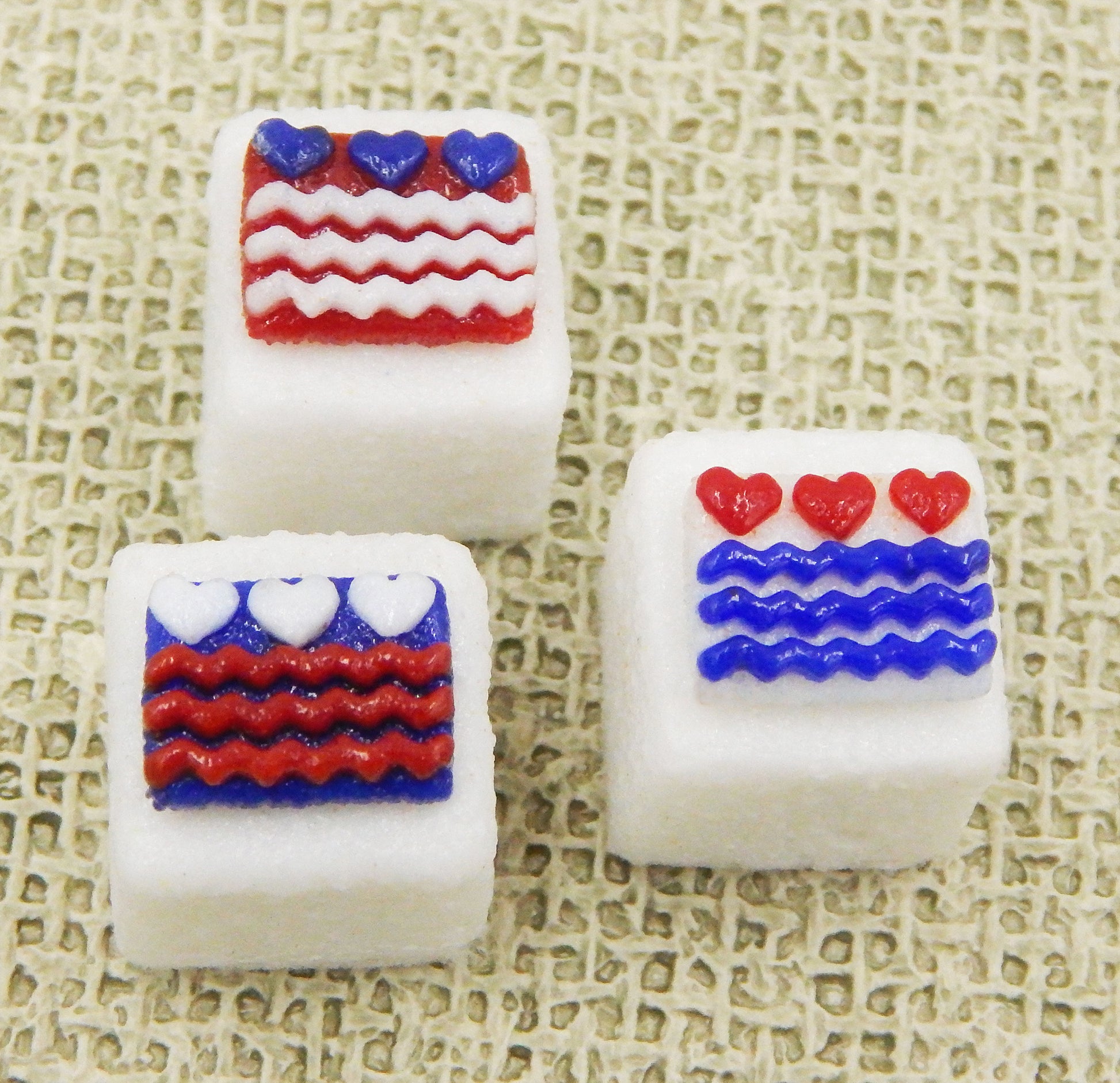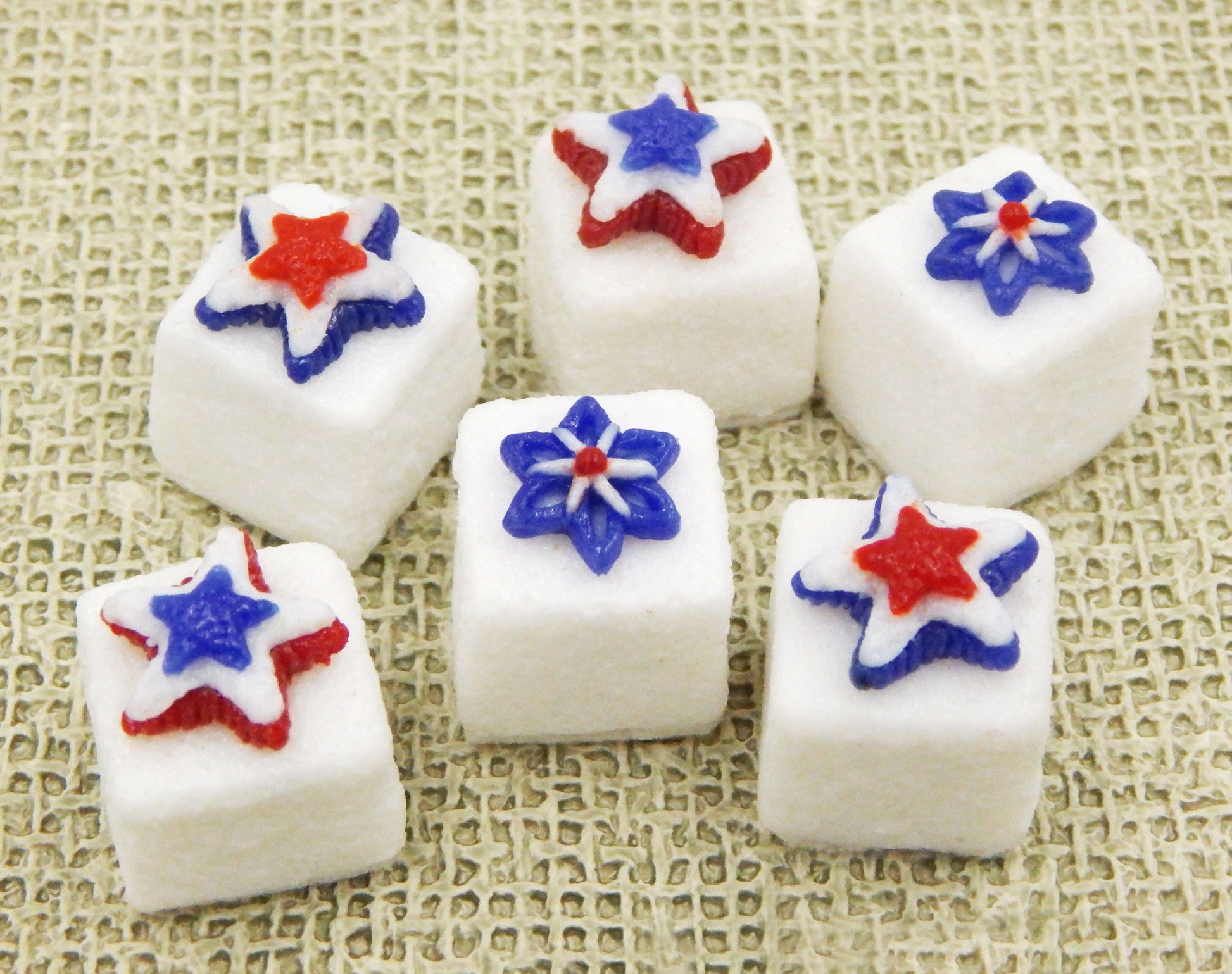 These handmade collectible solid glass sugar cubes, each with a design in bold patriotic colors on top, are created from finely ground colored glass powders using variations of the centuries old technique of pate de verre. Meticulous attention to detail has gone into the construction of each of our pieces to enhance its appeal and collectibility.