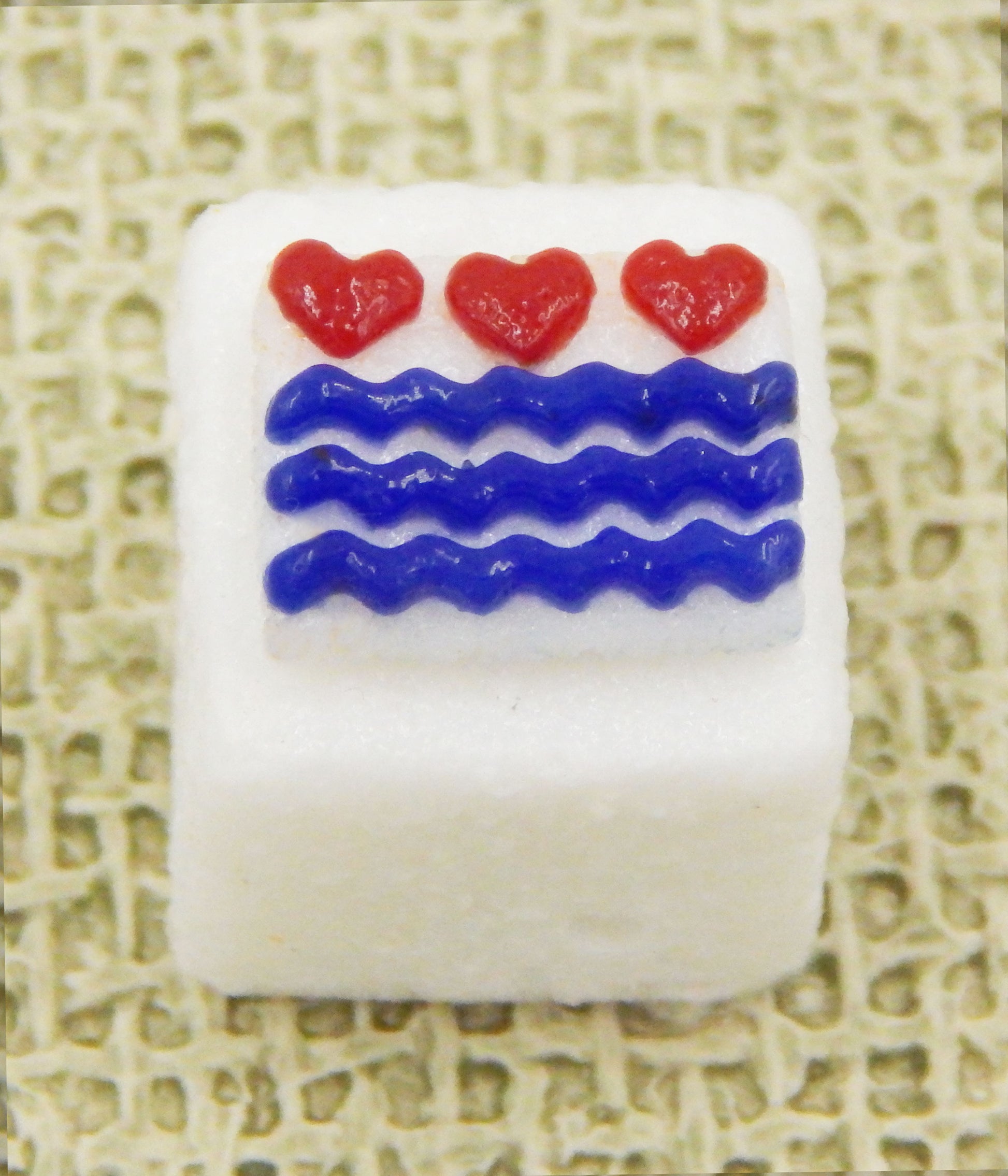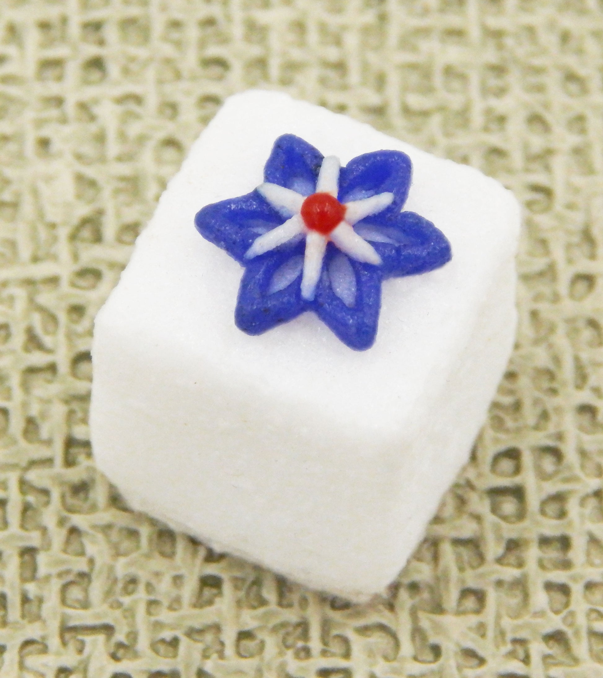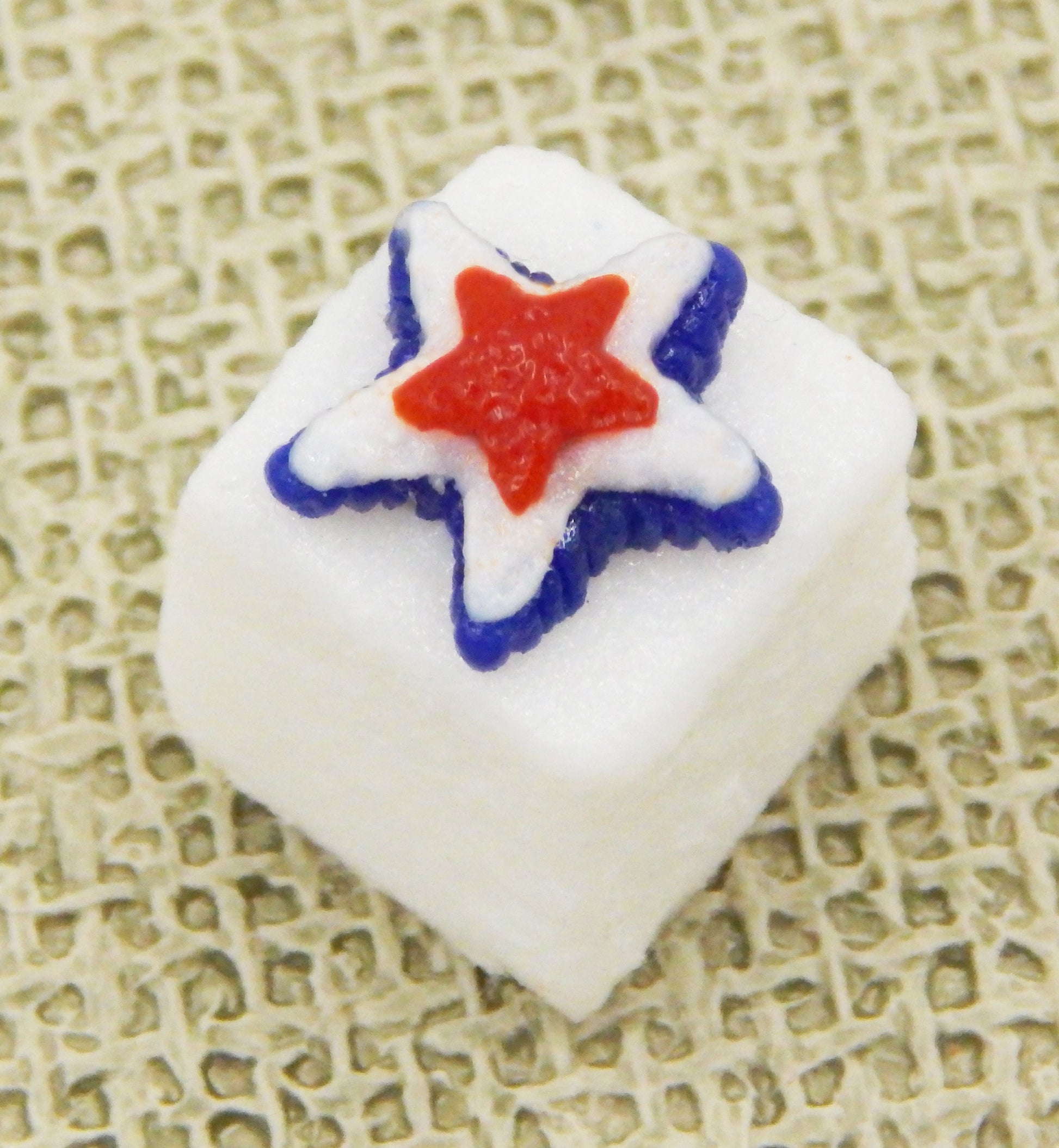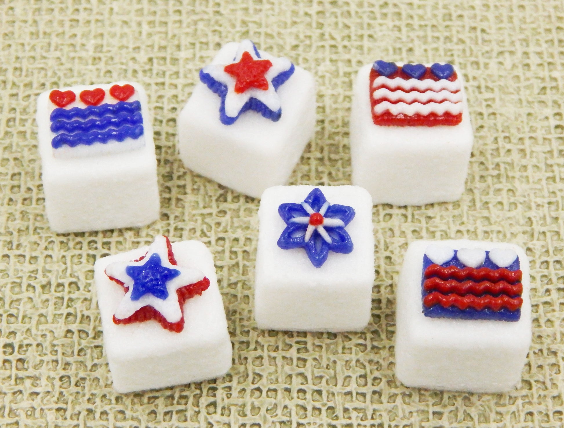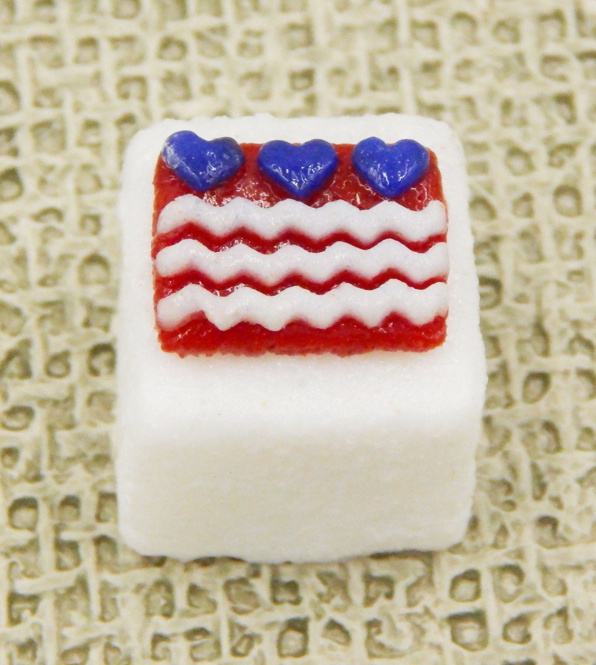 These handmade collectible solid glass sugar cubes, each with a design in bold patriotic colors on top, are created from finely ground colored glass powders using variations of the centuries old technique of pate de verre. Meticulous attention to detail has gone into the construction of each of our pieces to enhance its appeal and collectibility.