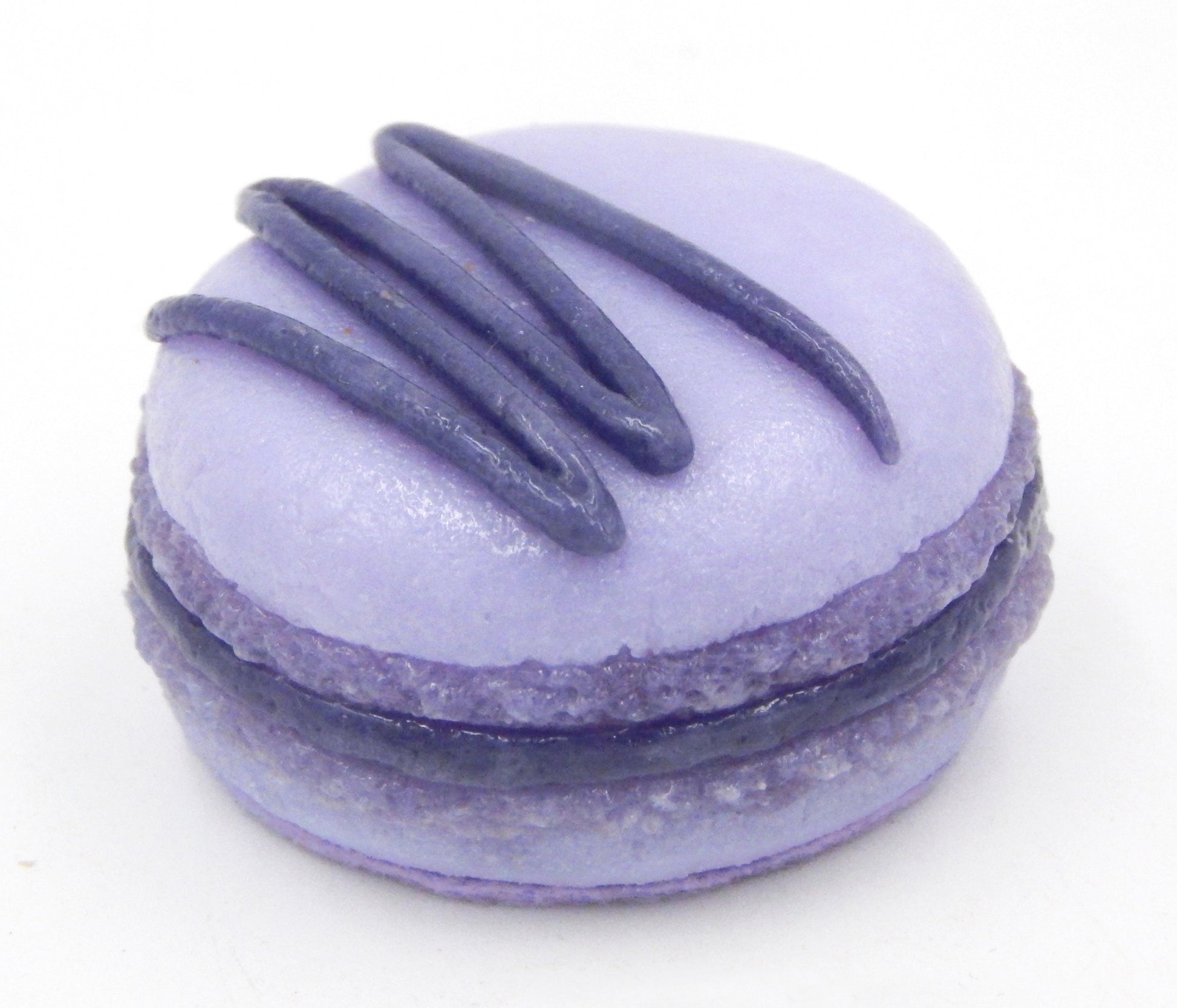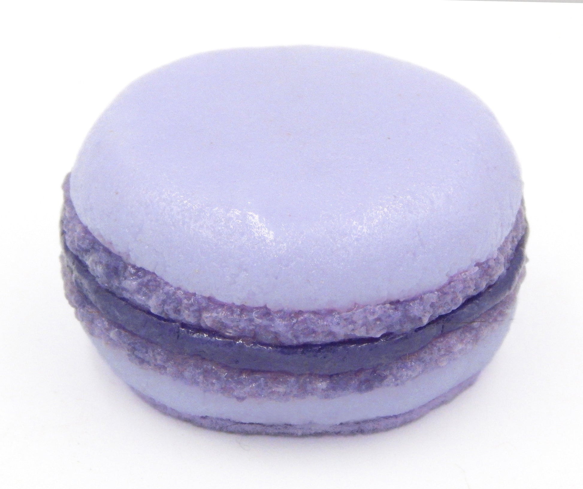 Collectible solid glass lavender macarons filled with creamy blueberry honey buttercream are created from finely ground colored glass powders using variations of the centuries old technique of pate de verre. Meticulous attention to detail has gone into the construction of each of our pieces to enhance its appeal and collectibility. We offer these macarons either plain or with a drizzle of the blueberry honey buttercream frosting on top.