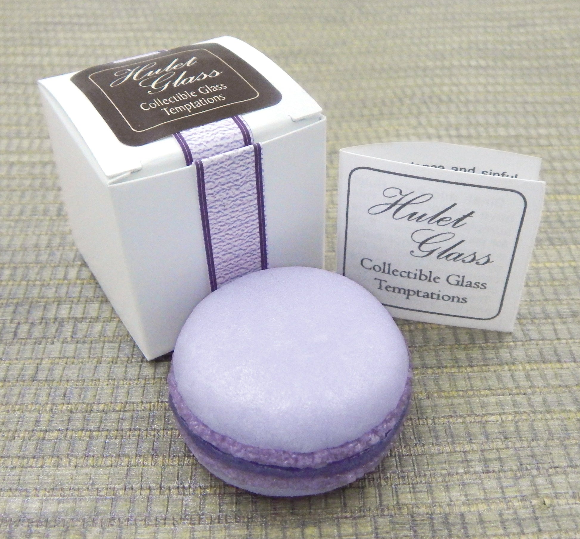 Each glass lavender macaron measures approx. 1.75" diameter x 1" high. The bottom of the macaron is covered in felt to protect the surface it will sit upon. All of our beautiful glass treats are signed (Hulet), dated and come to you in a small gift box with an enclosure card telling a bit about the piece.