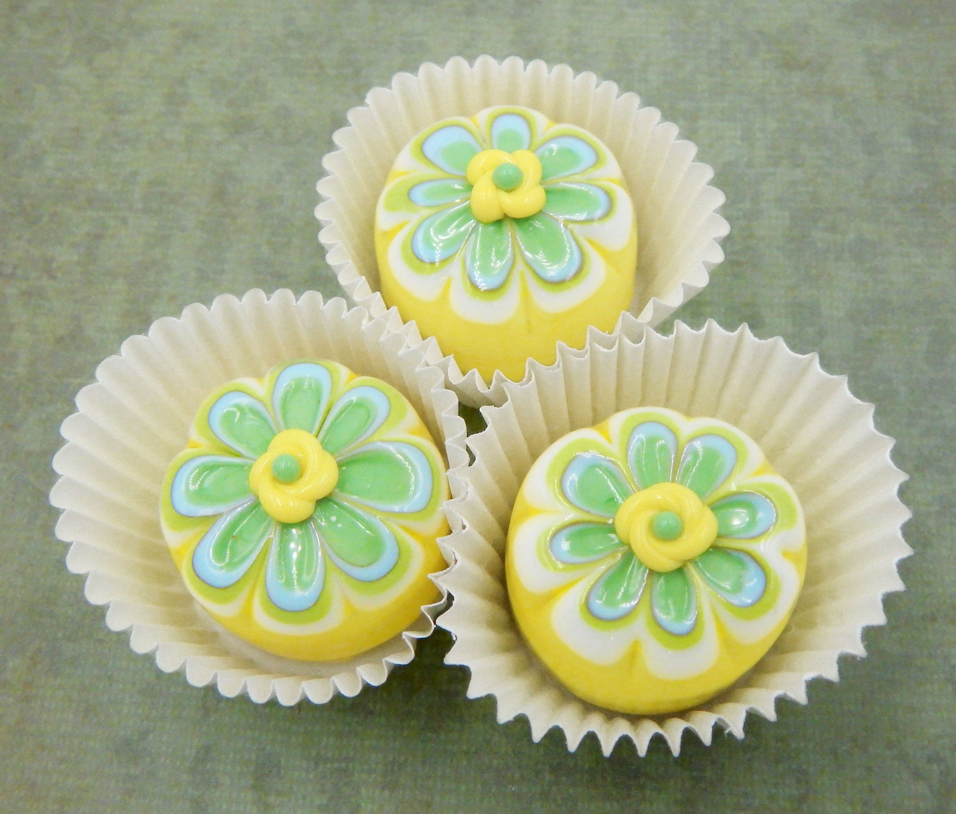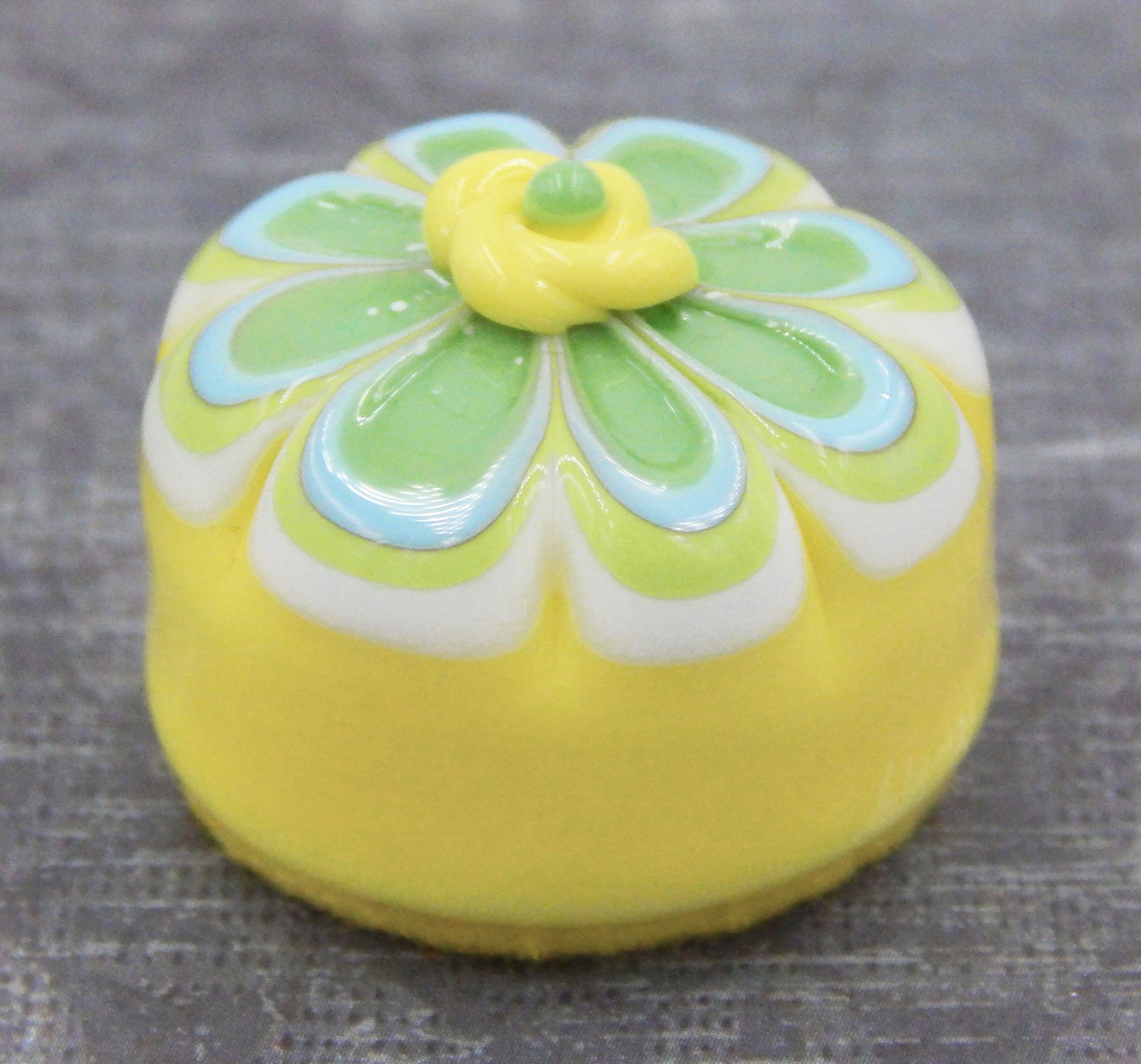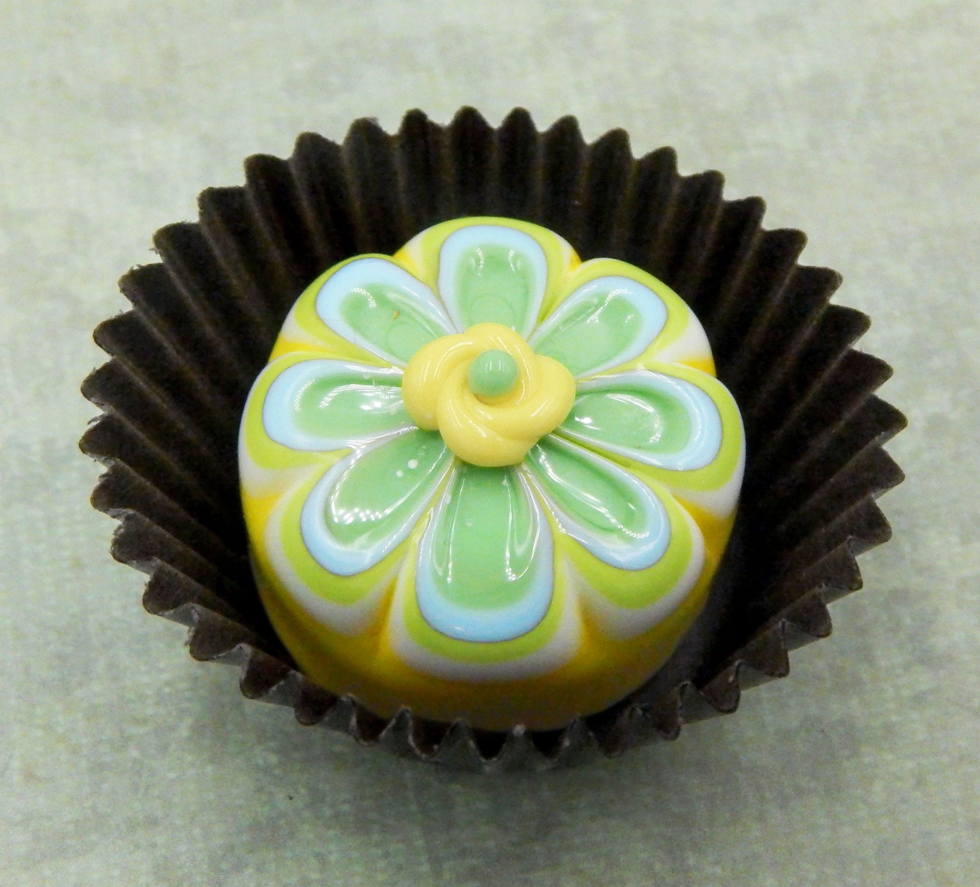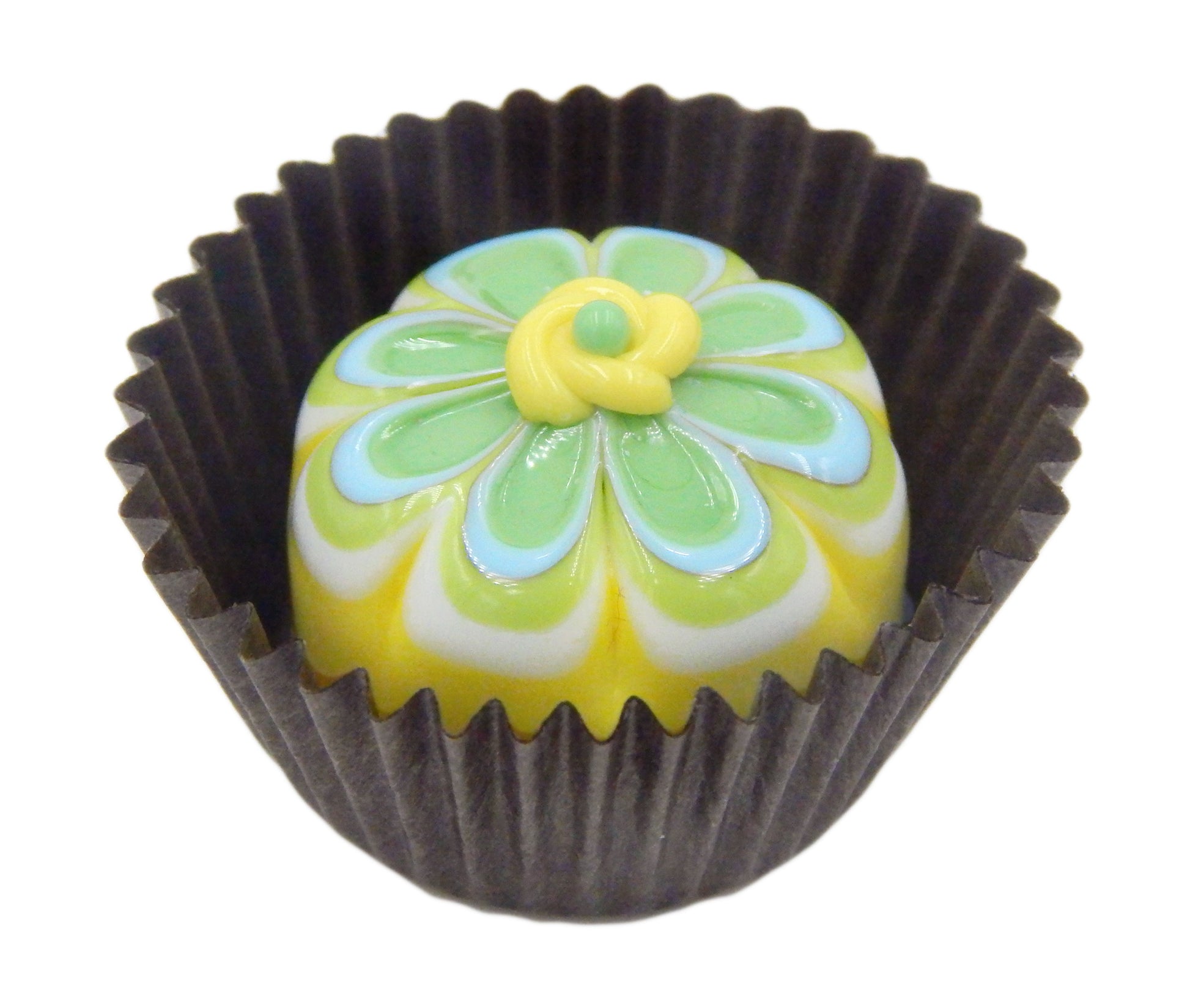 A handmade collectible solid glass lemon chocolate with a cosmos design of white chocolate & mint green created from colorful glass utilizing flameworking techniques. Meticulous attention to detail has gone into the construction of each of our pieces to enhance its appeal and collectibility.