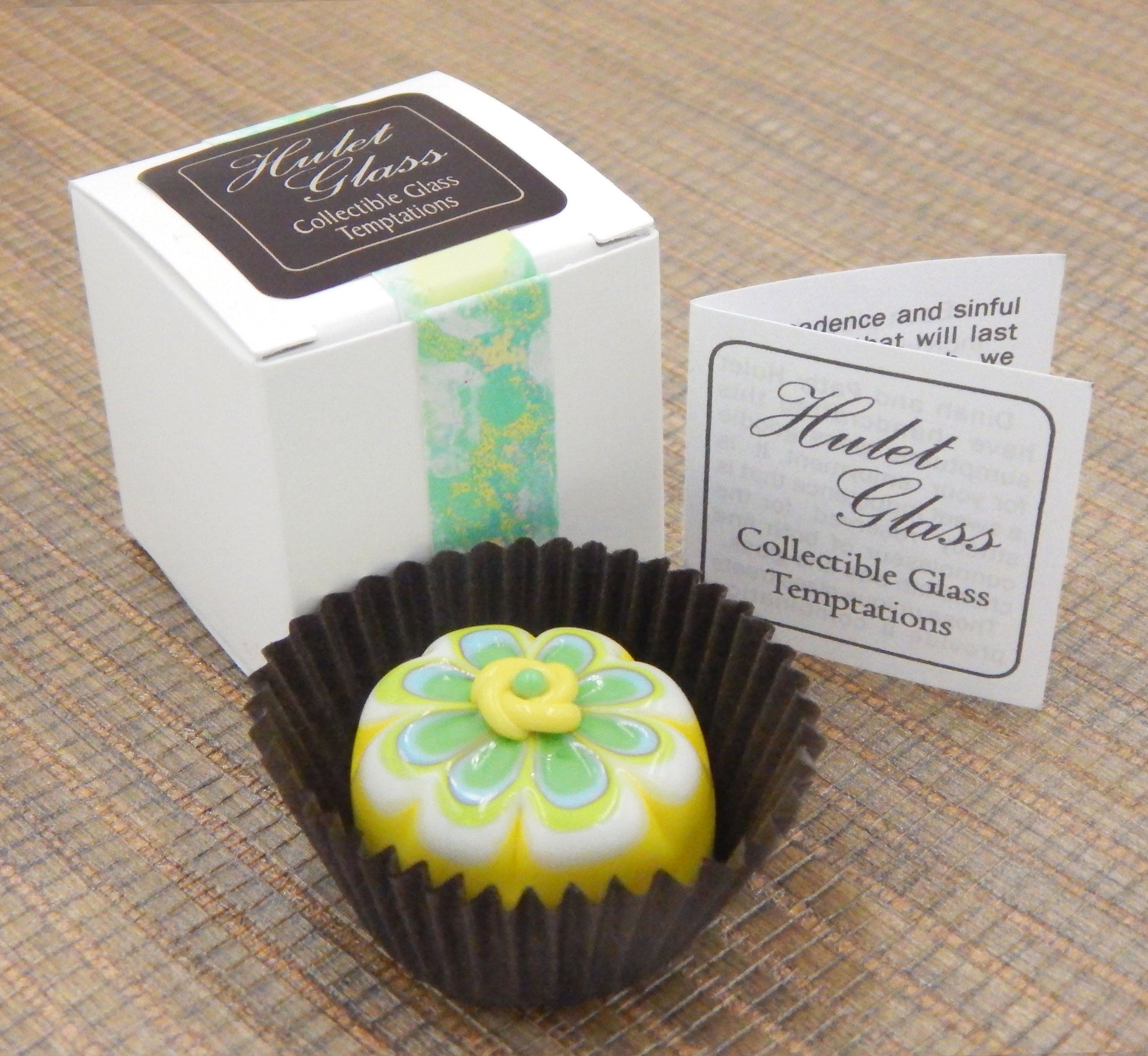 The glass chocolate measures approximately 1.25" x 1" (slightly larger than an actual chocolate candy) and sits in a fluted glassine paper candy cup. The bottom of the chocolate is covered in felt to protect the surface it will sit upon. Each beautiful glass chocolate is signed (Hulet), dated and comes to you in a colorful gift box with an enclosure card telling a bit about the piece.