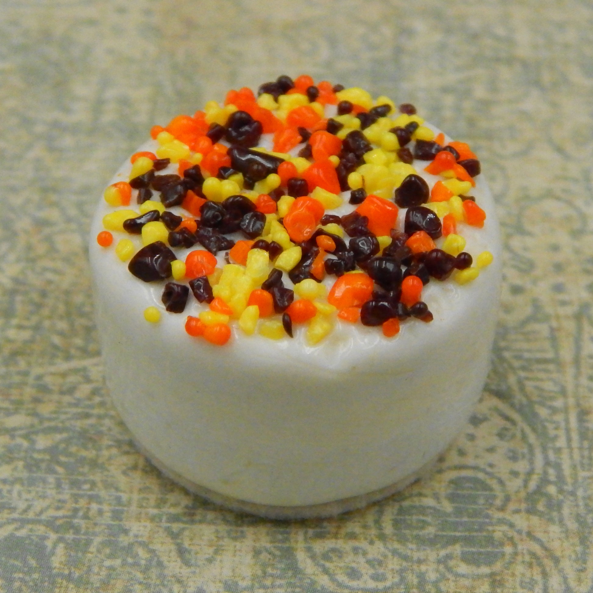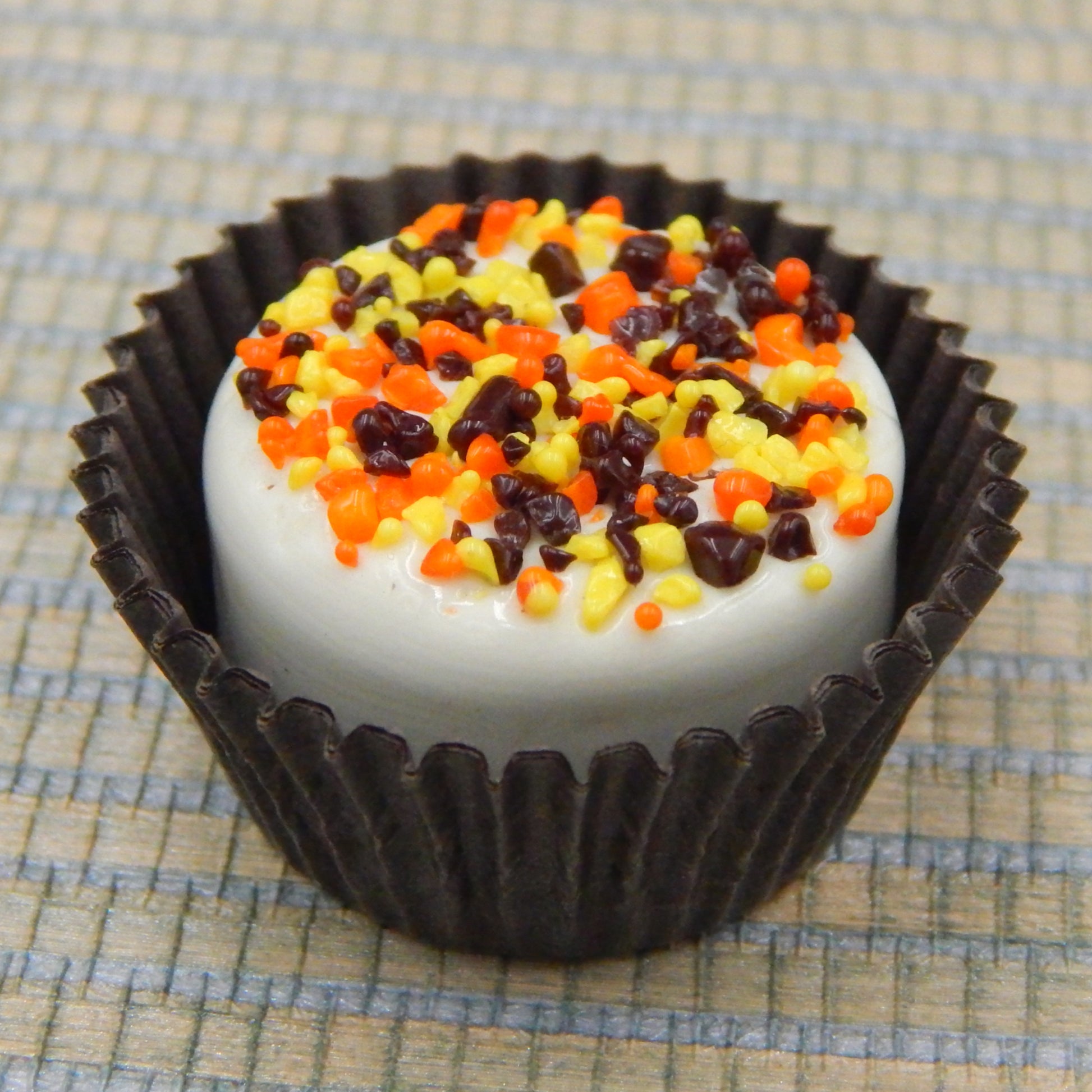 A handmade collectible solid glass vanilla chocolate with sprinkles of autumn hued candies on top created from colorful glass utilizing flameworking techniques. Meticulous attention to detail has gone into the construction of each of our pieces to enhance its appeal and collectibility.