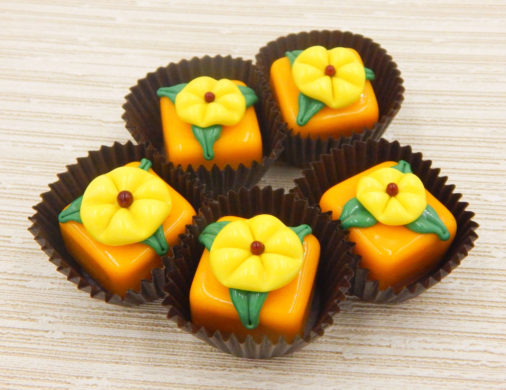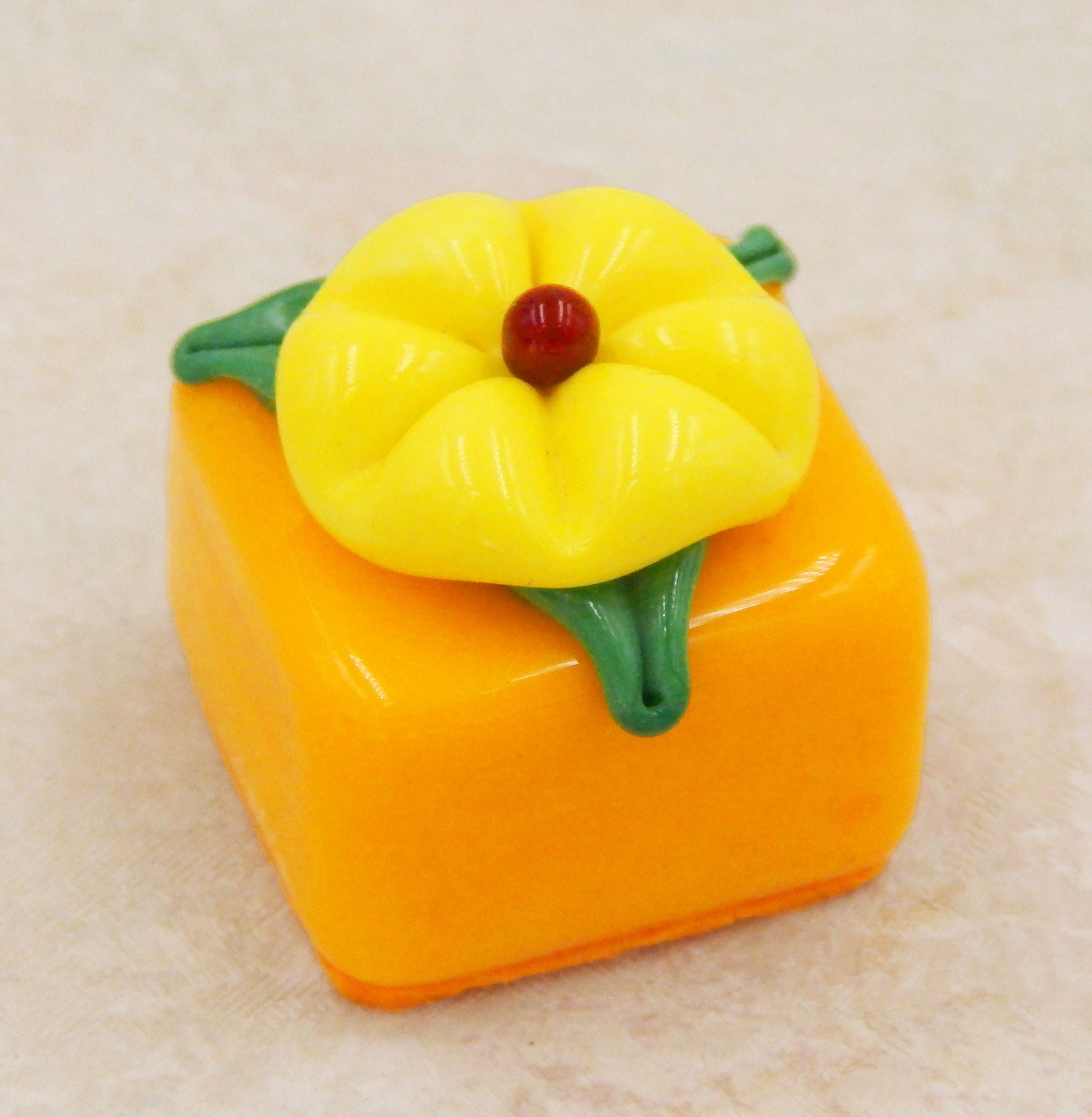A handmade collectible solid glass mango chocolate with a lemon yellow blossom on top created from colorful glass utilizing flameworking techniques. Meticulous attention to detail has gone into the construction of each of our pieces to enhance its appeal and collectibility.