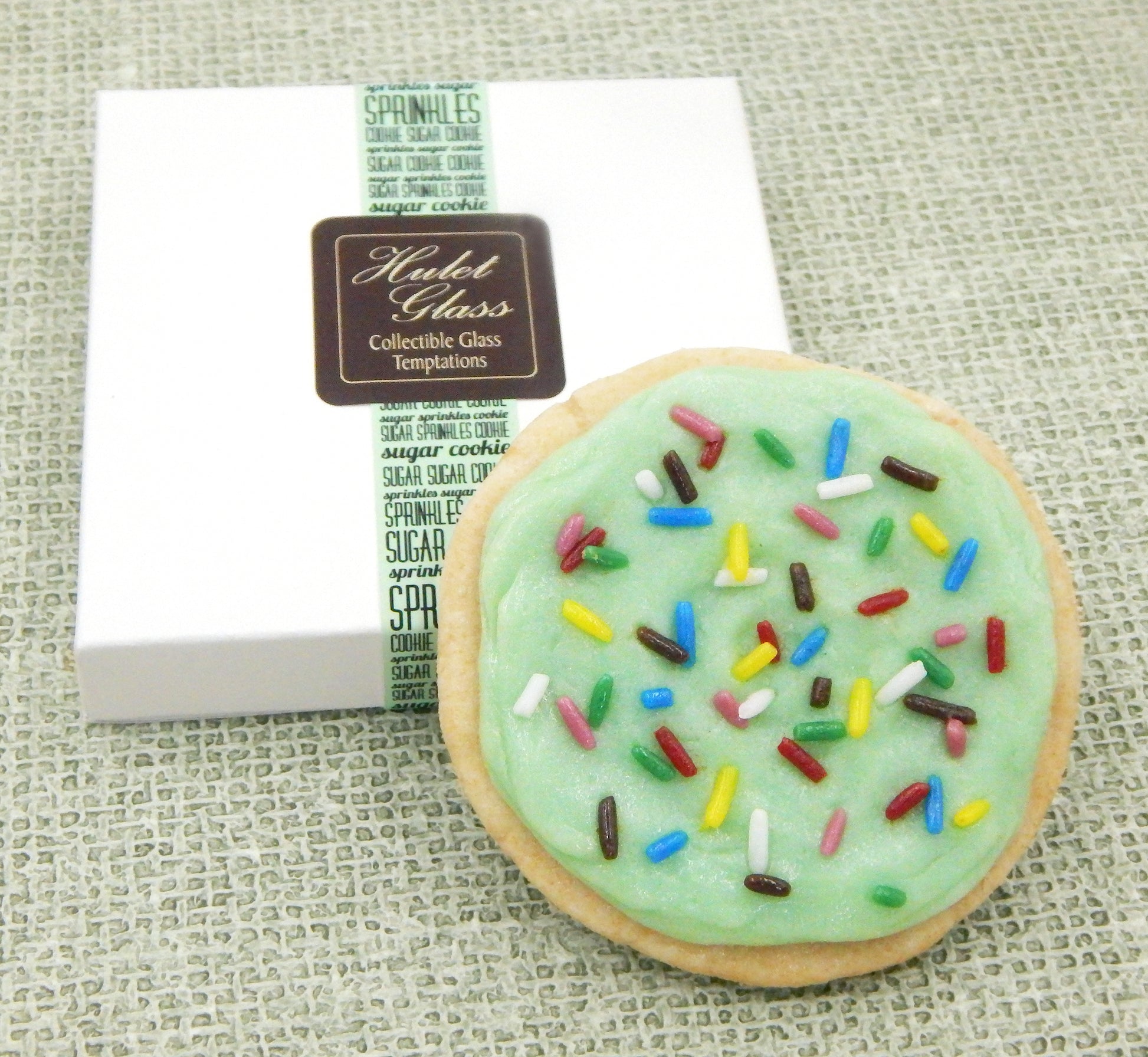 A handmade collectible solid glass mint green sugar cookie with sprinkles crafted from colorful glass utilizing ancient pate de verre and flameworking techniques. Meticulous attention to detail has gone into the construction of each of our pieces to enhance its appeal and collectibility.