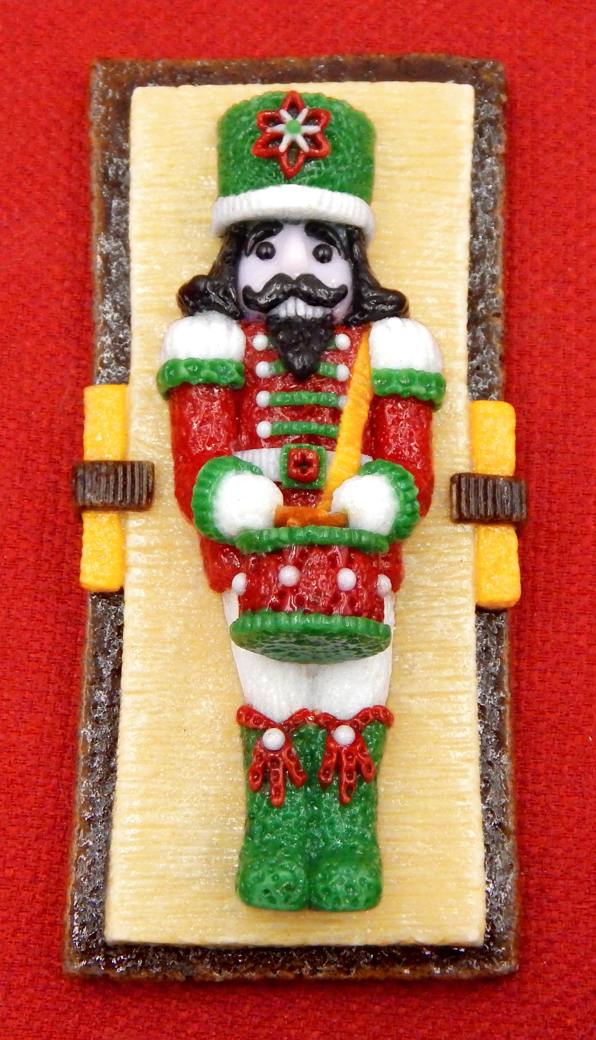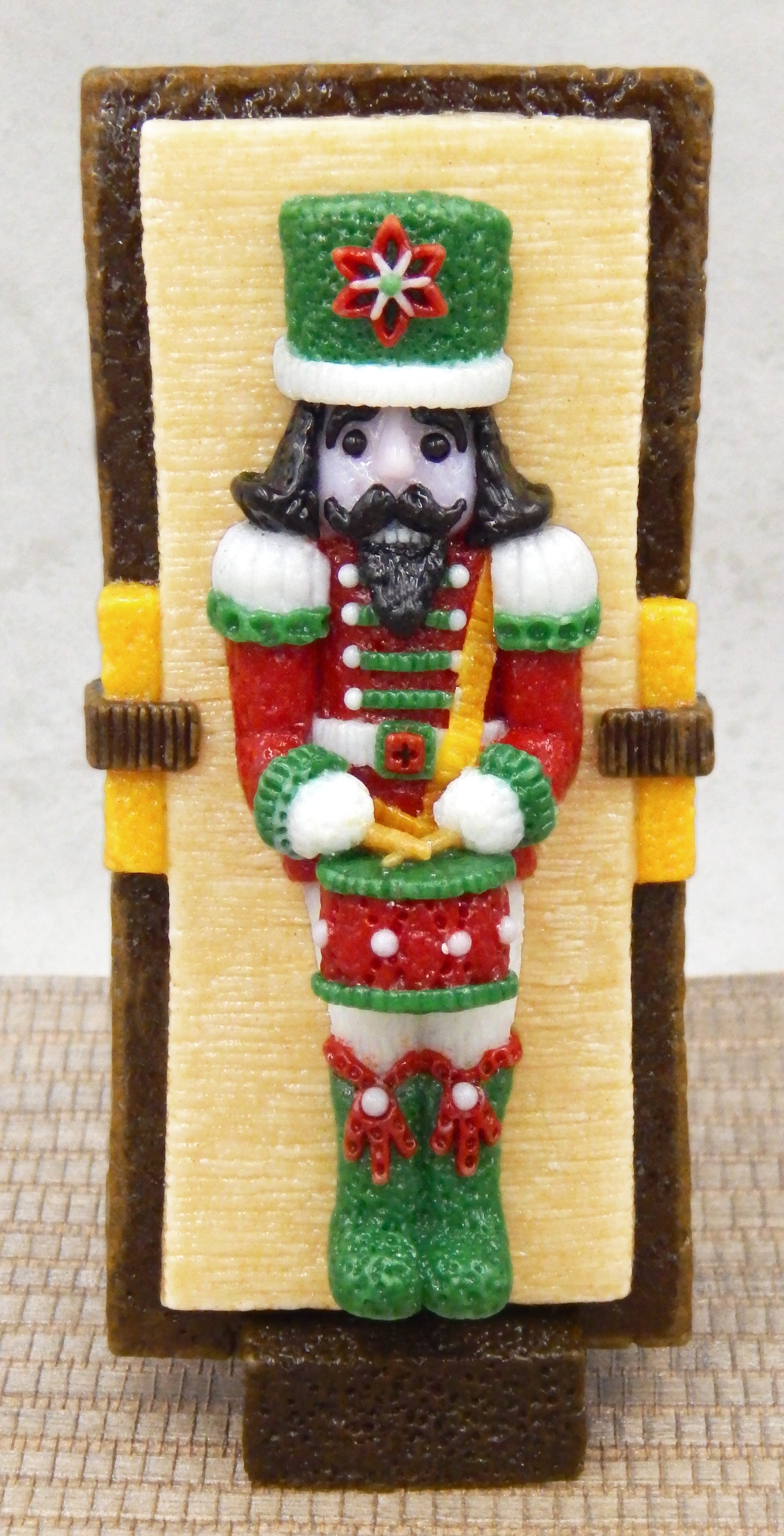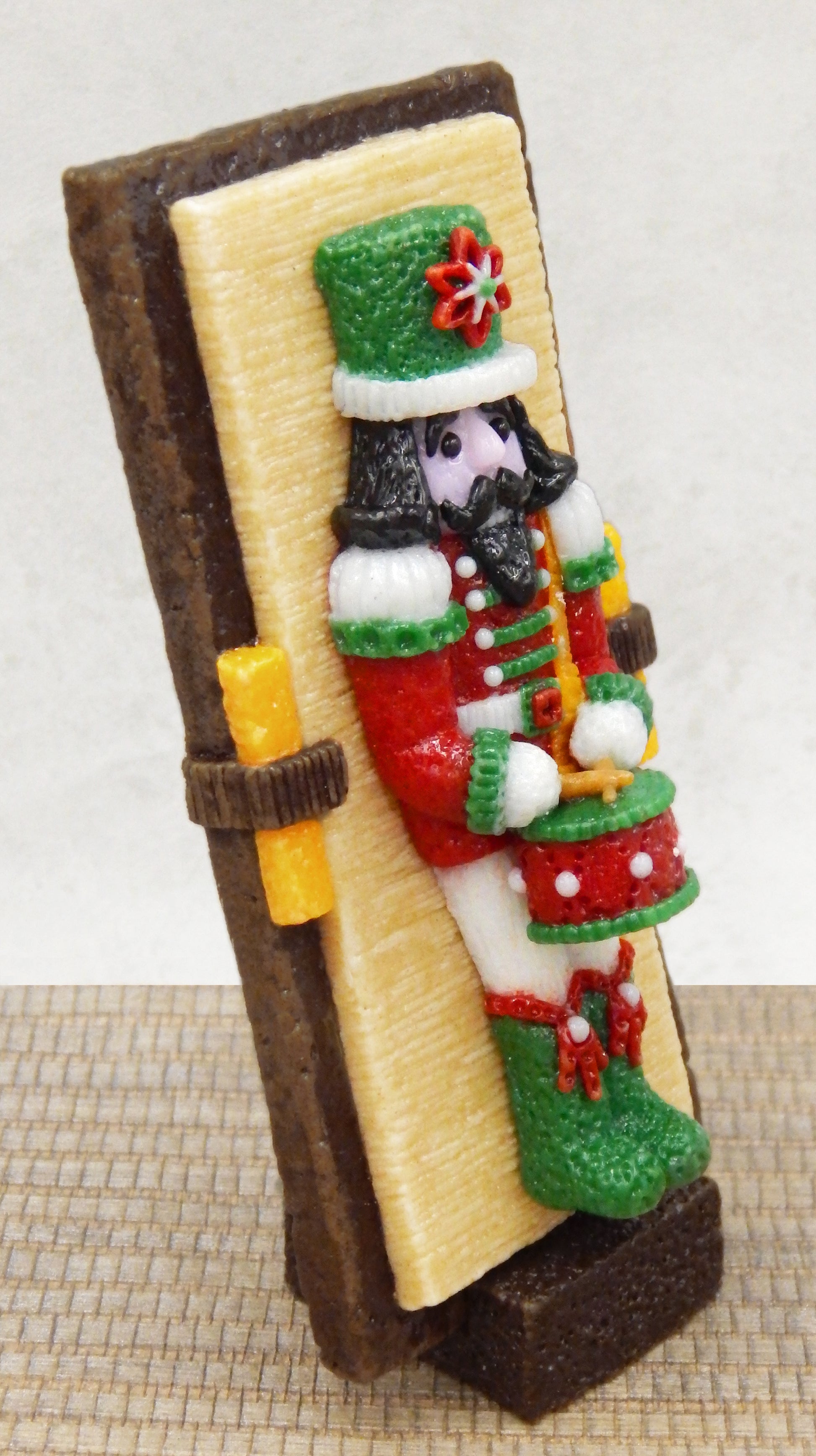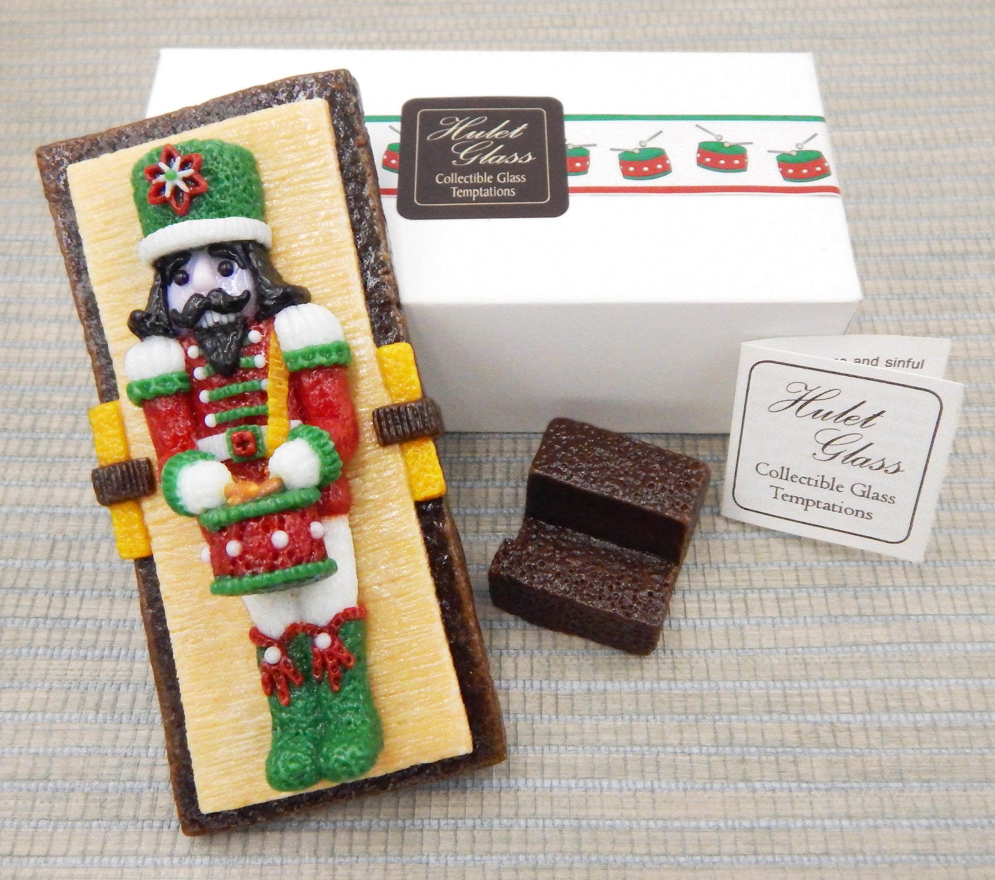 A handmade collectible solid glass Christmas cookie with a chocolate base topped by a festive Nutcracker Drummer crafted from colorful glass utilizing ancient pate de verre techniques. Meticulous attention to detail has gone into the construction of each of our pieces to enhance its appeal and collectibility.
