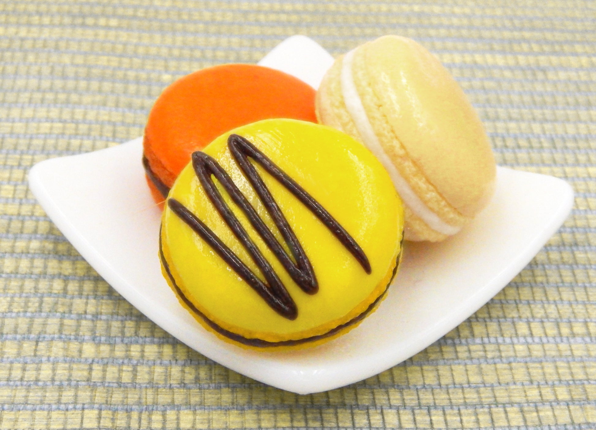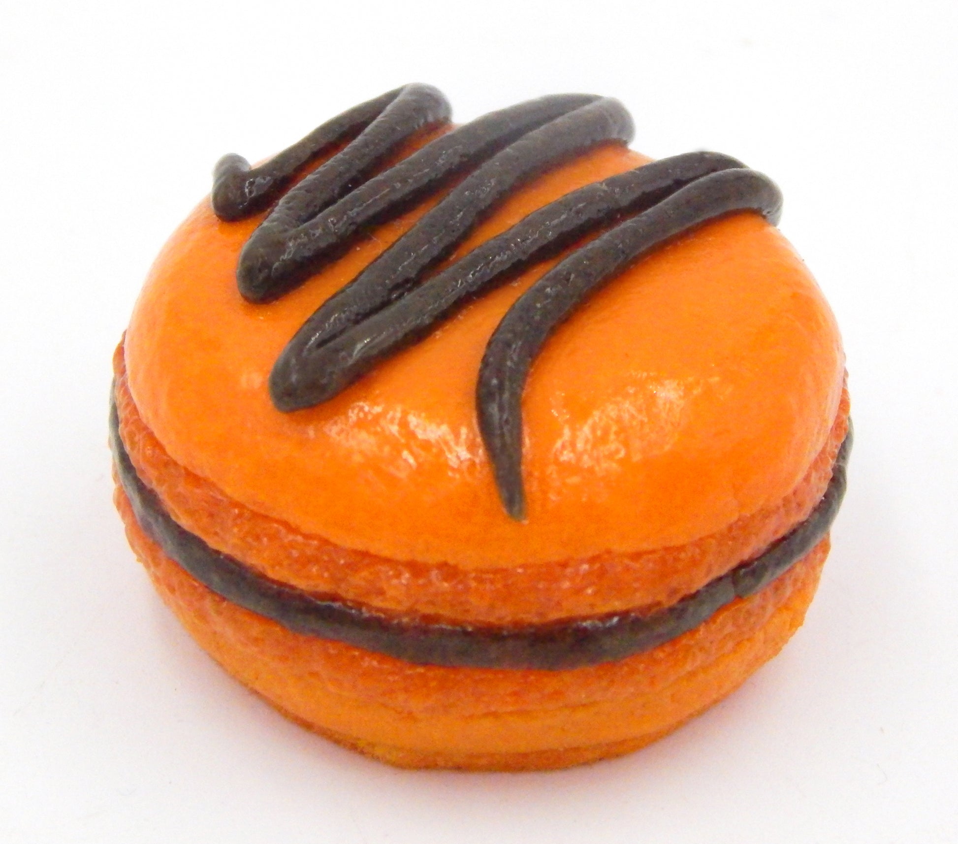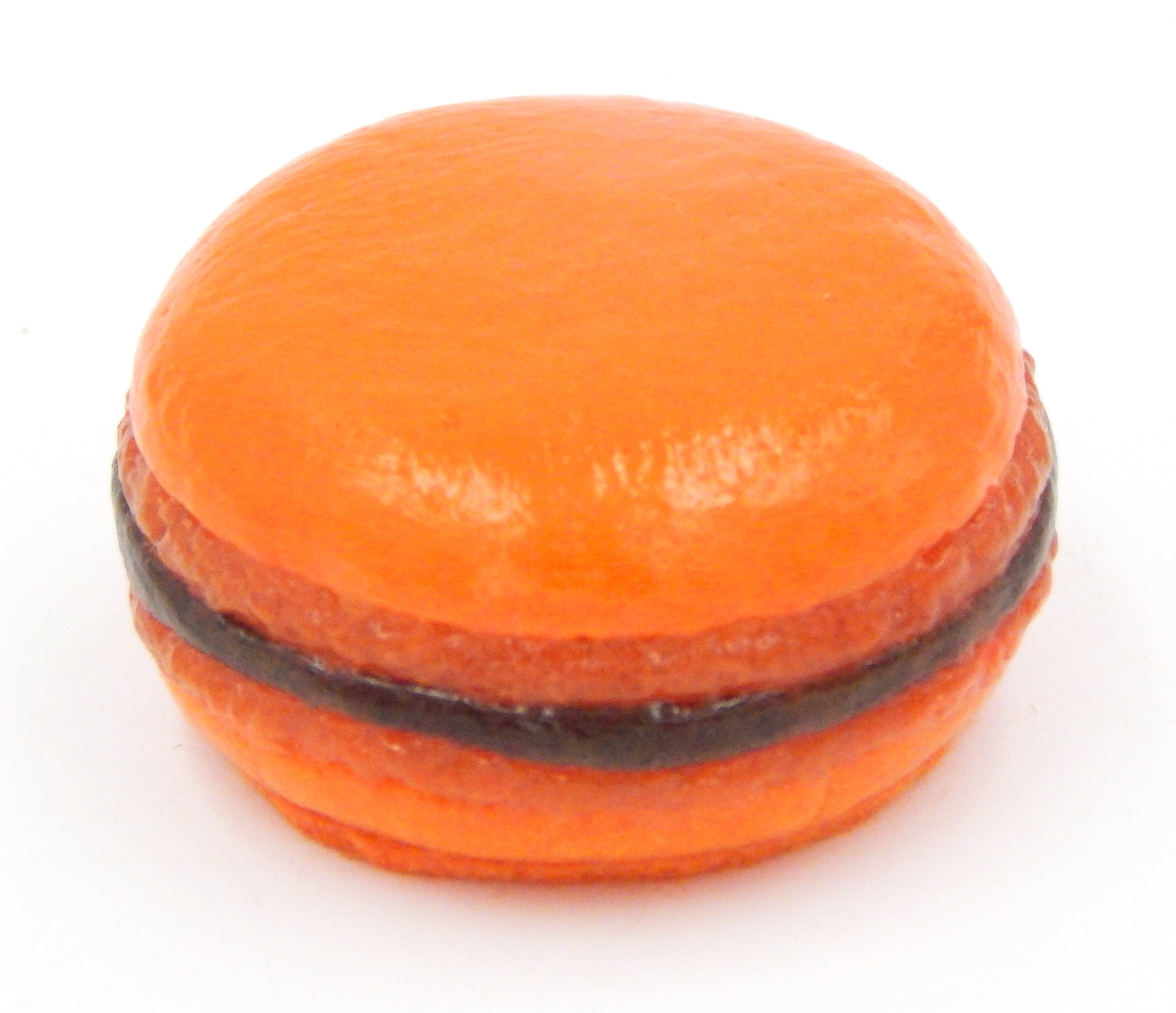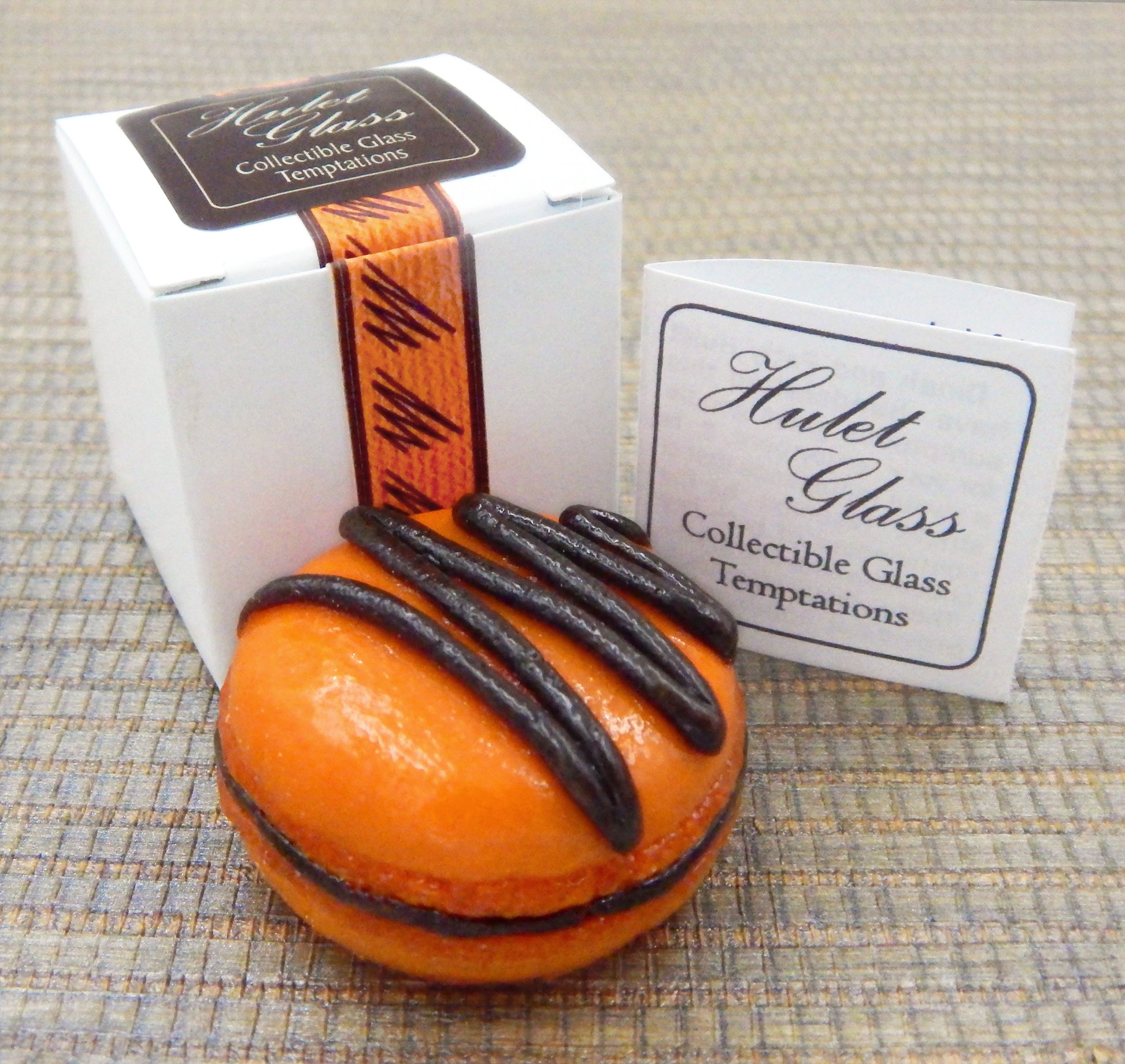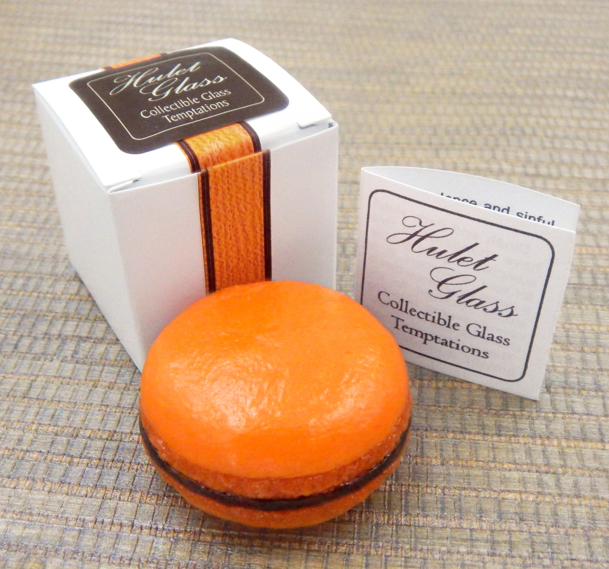 Collectible solid glass orange macarons filled with creamy chocolate bourbon buttercream are created from finely ground colored glass powders using variations of the centuries old technique of pate de verre. Meticulous attention to detail has gone into the construction of each of our pieces to enhance its appeal and collectibility. We offer these macarons either plain or with a drizzle of the chocolate bourbon buttercream frosting on top.