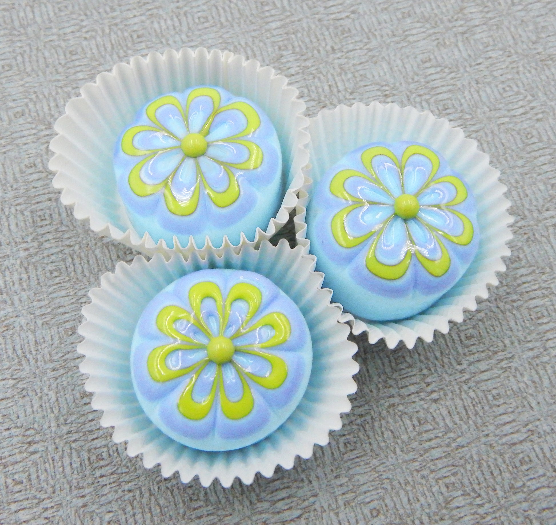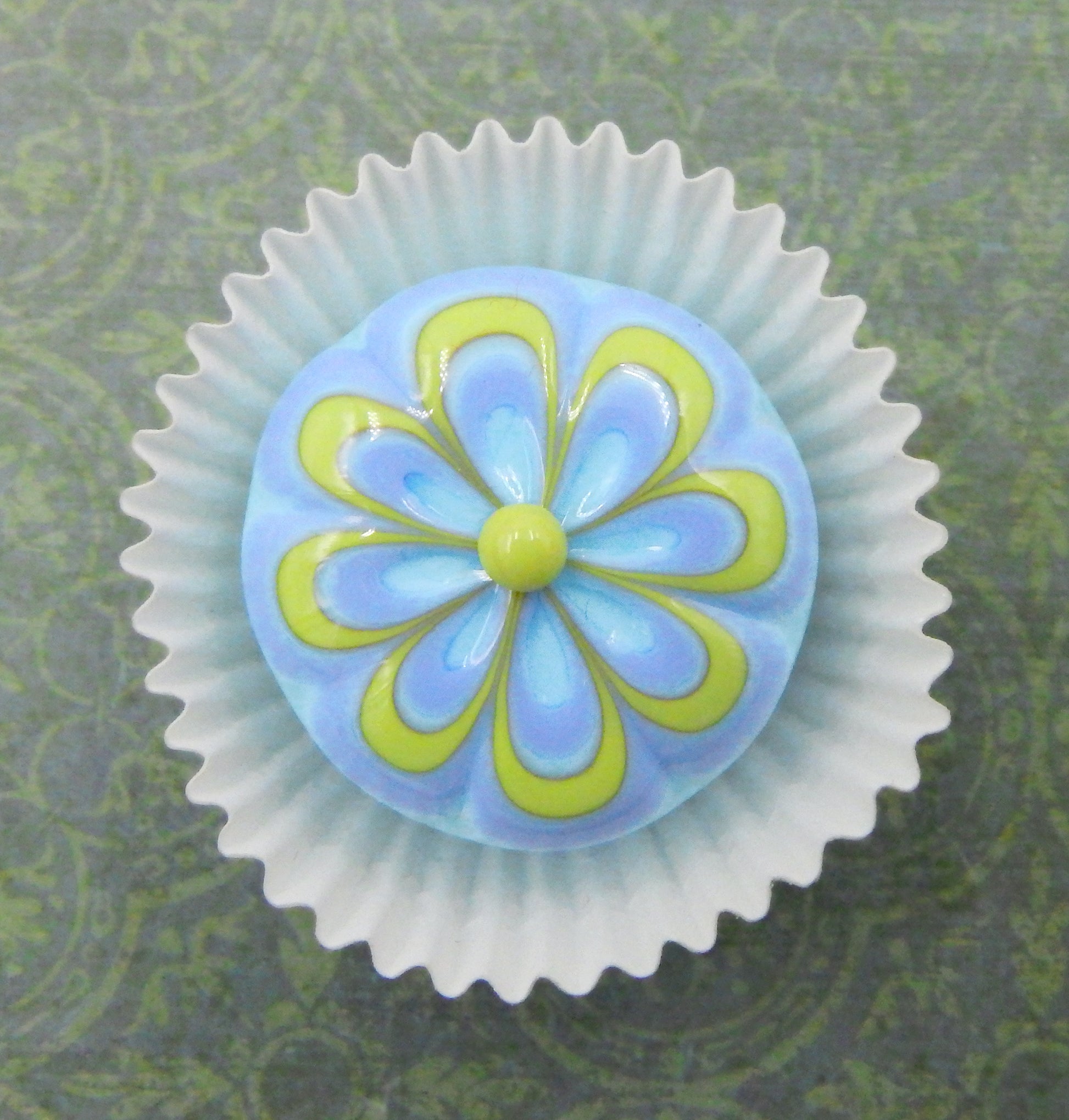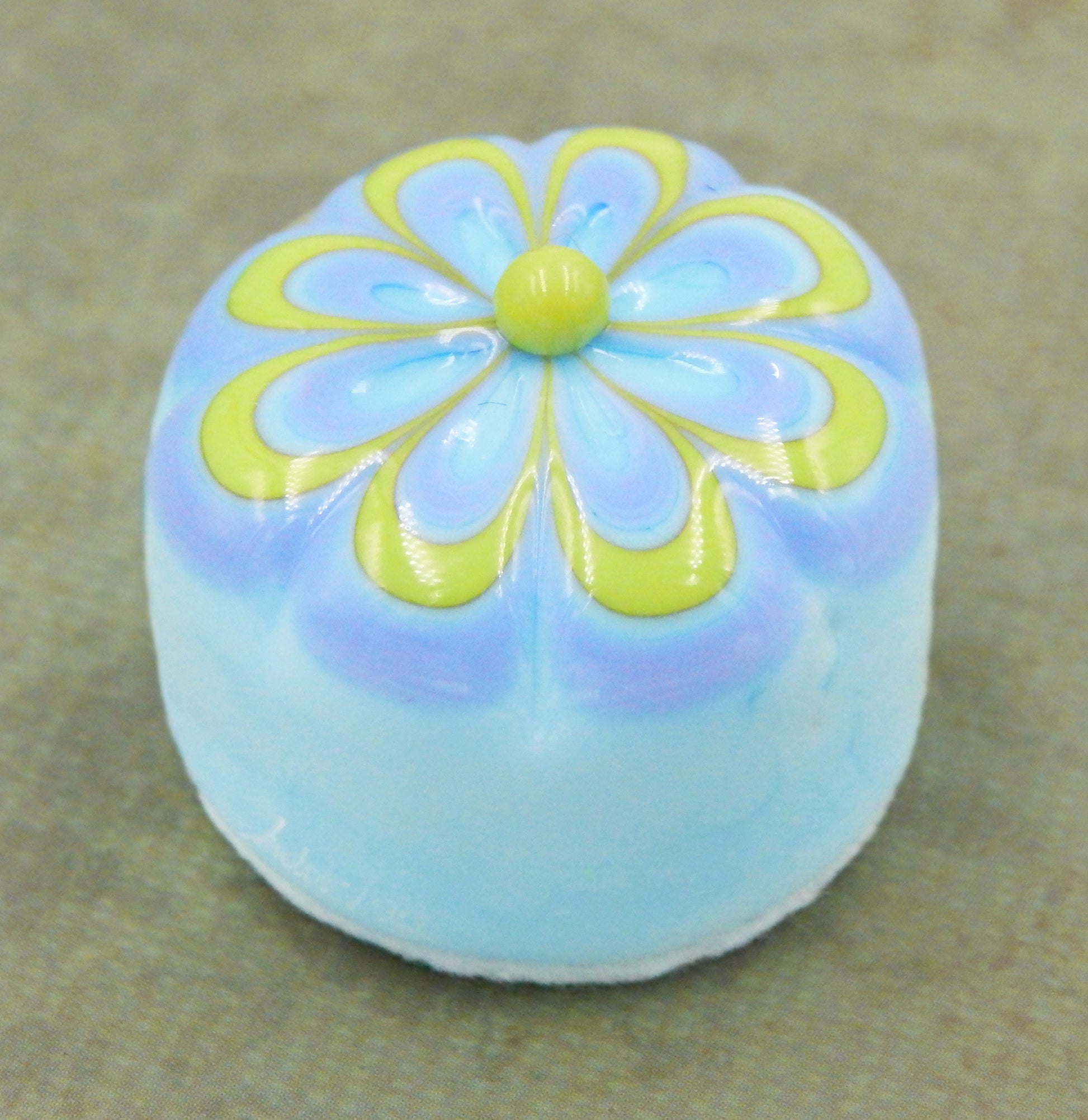 A handmade collectible solid glass berry blue chocolate with a scrumptious baby blue and pistachio green floral design on top created from colorful glass utilizing flameworking techniques. Meticulous attention to detail has gone into the construction of each of our pieces to enhance its appeal and collectibility.