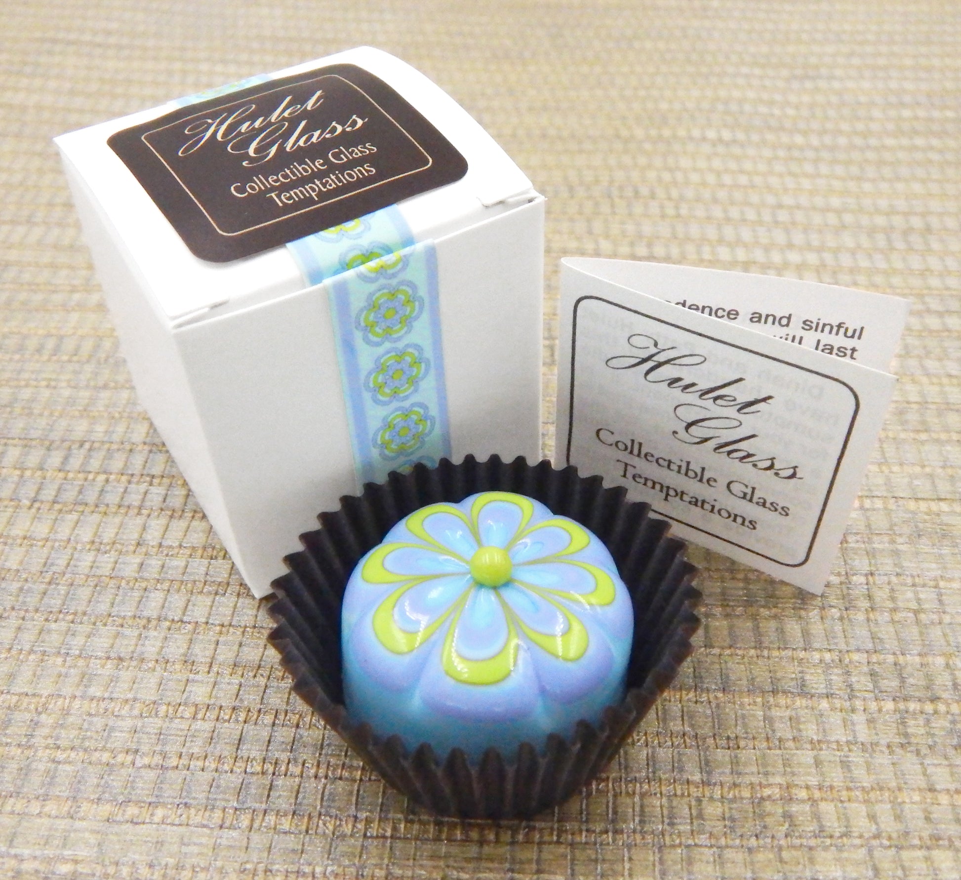 The glass chocolate measures approximately 1.25" x 1" (slightly larger than an actual chocolate candy) and sits in a fluted glassine paper candy cup. The bottom of the chocolate is covered in felt to protect the surface it will sit upon. Each beautiful glass chocolate is signed (Hulet), dated and comes to you in a colorful gift box with an enclosure card telling a bit about the piece.