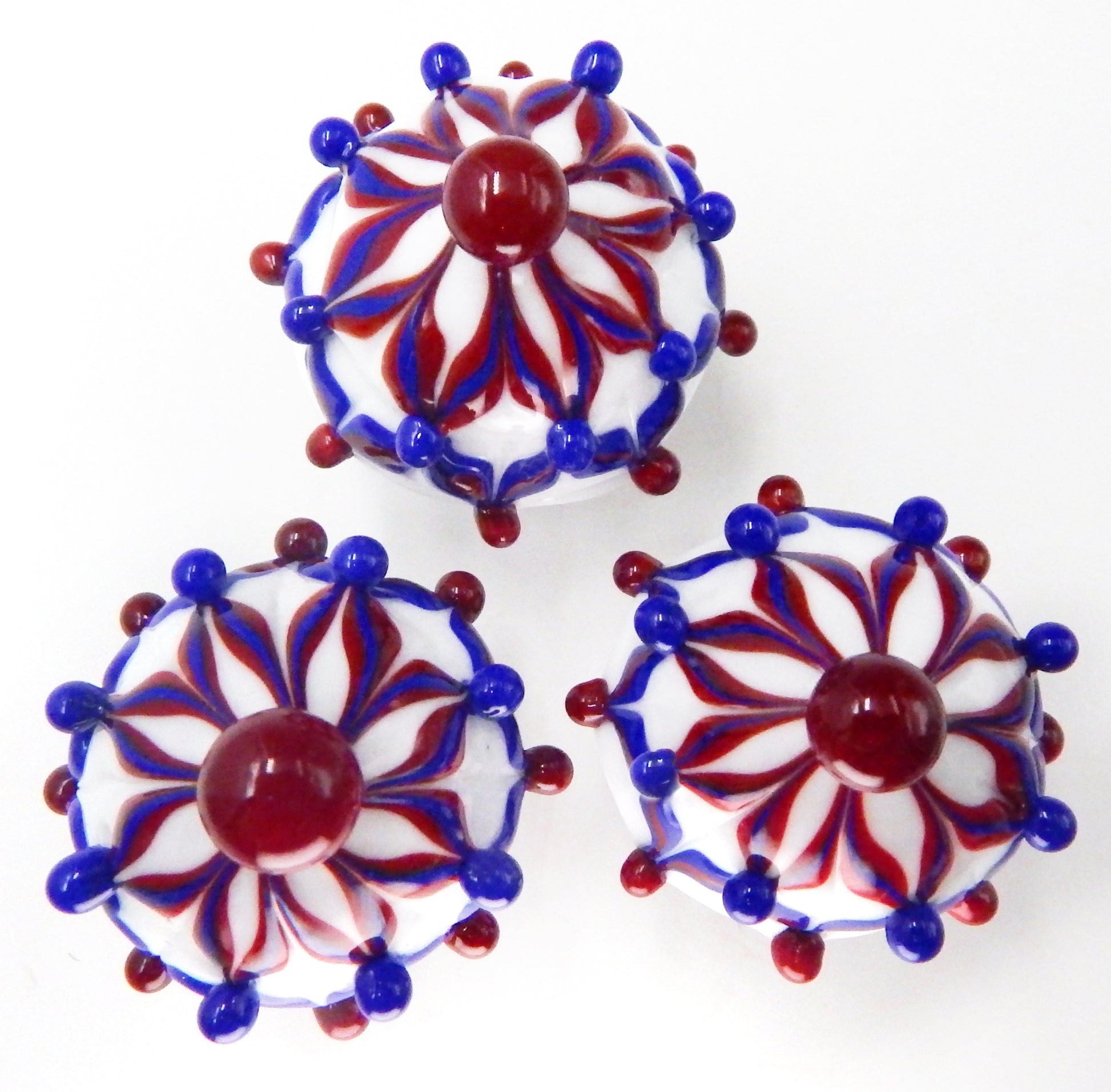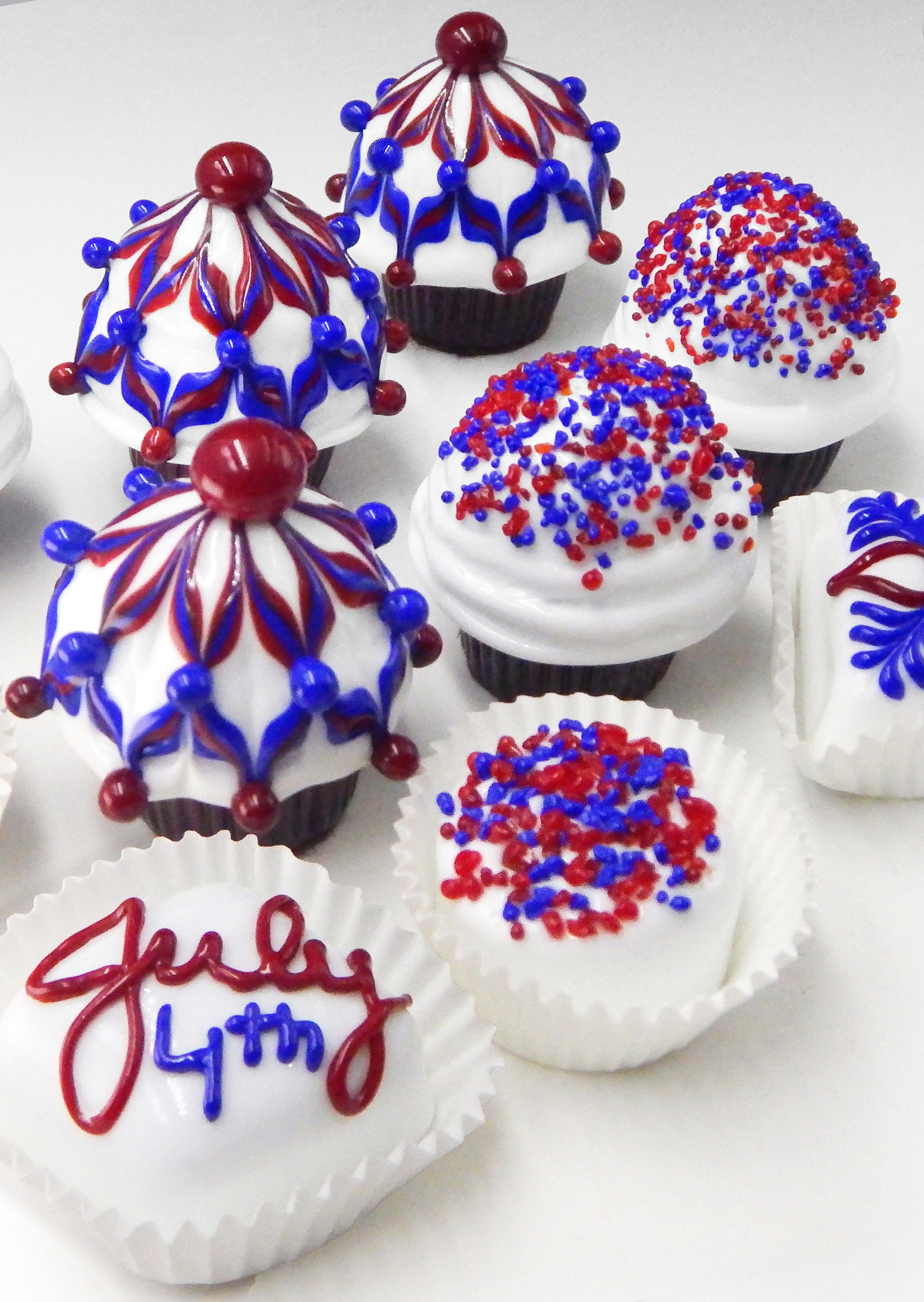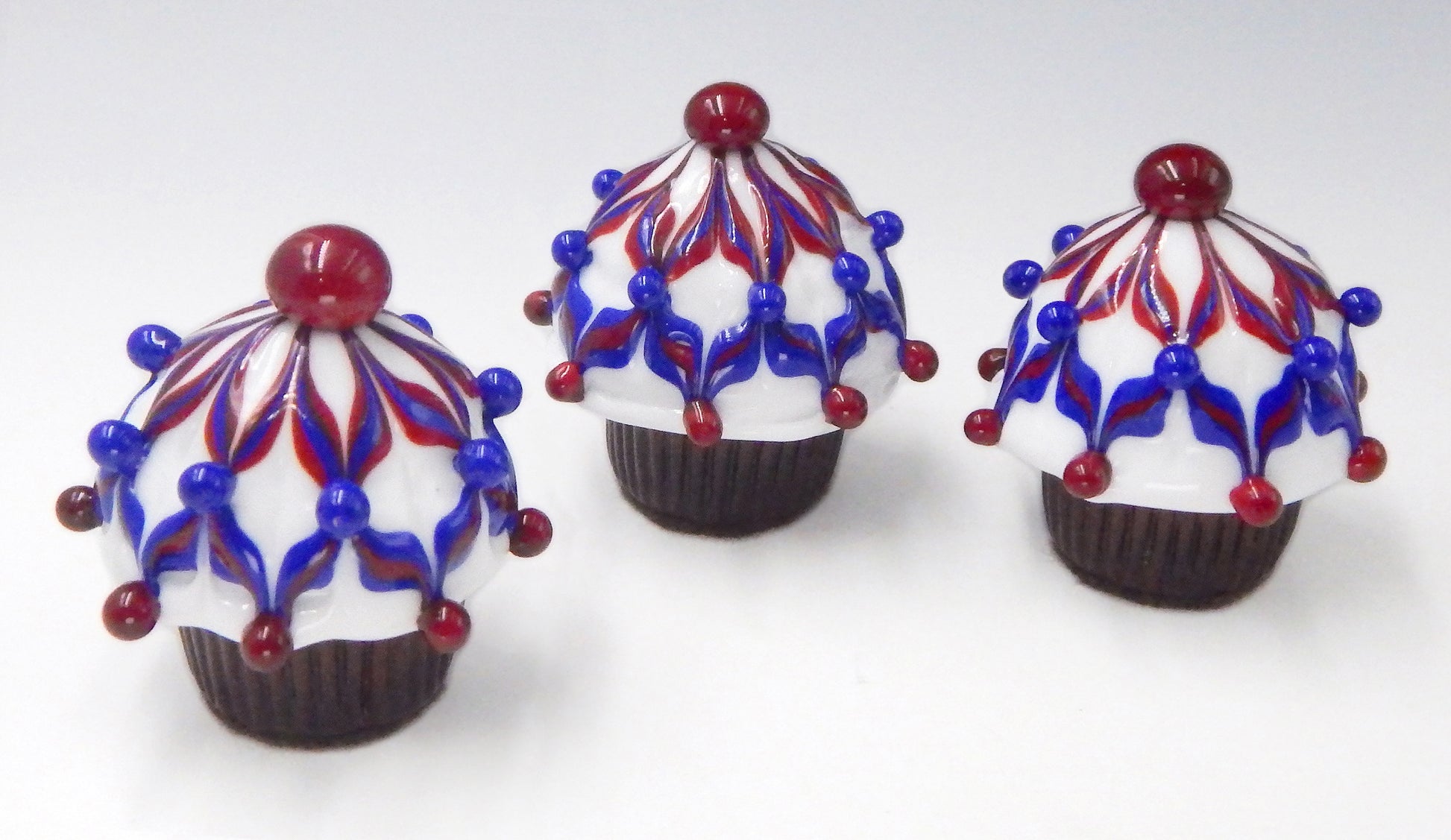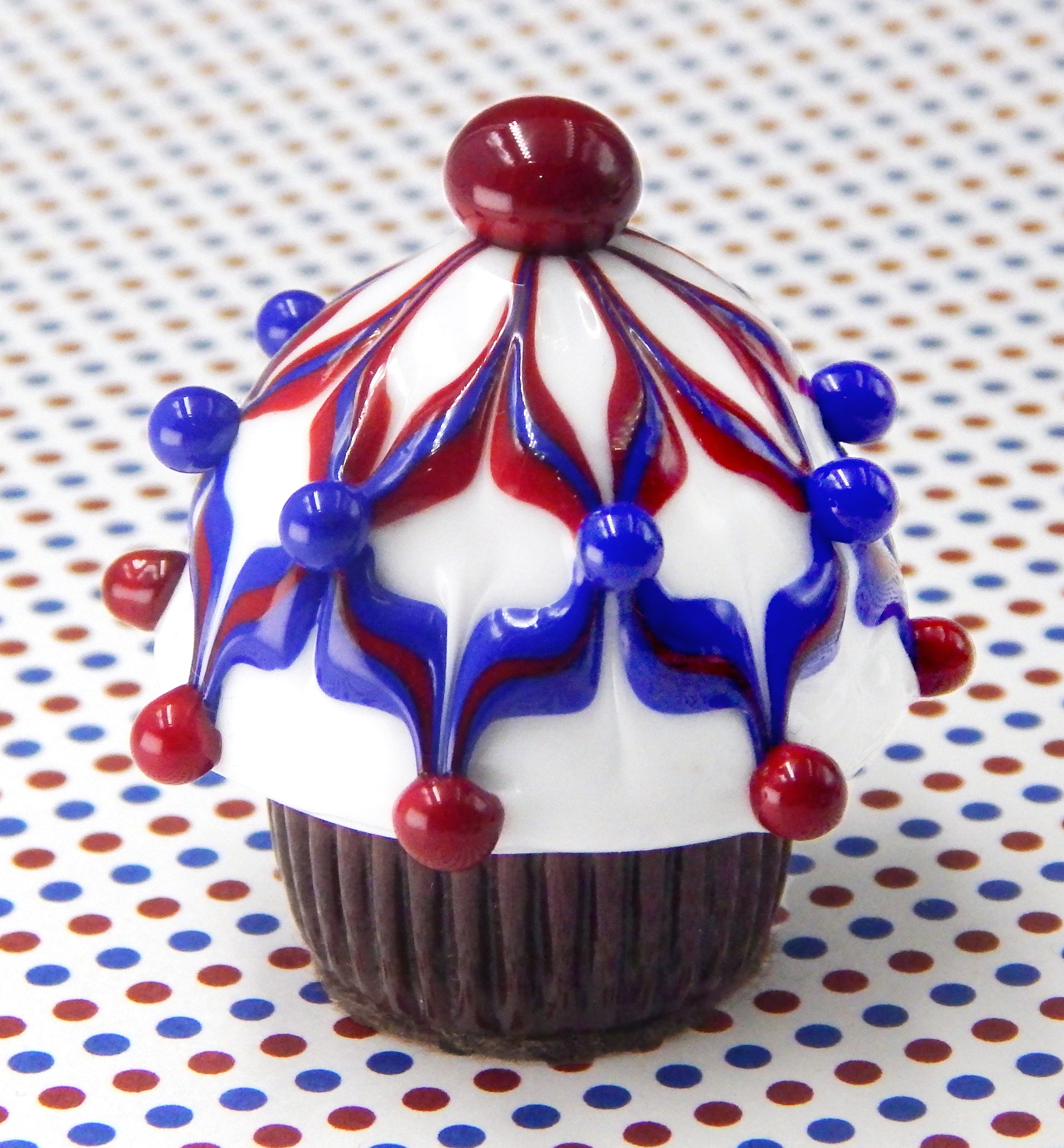 A handmade collectible solid glass Patriotic Mini Cupcake Truffle with patterns of red and blue on top created from colorful glass utilizing flameworking techniques. Meticulous attention to detail has gone into the construction of each of our pieces to enhance its appeal and collectibility.