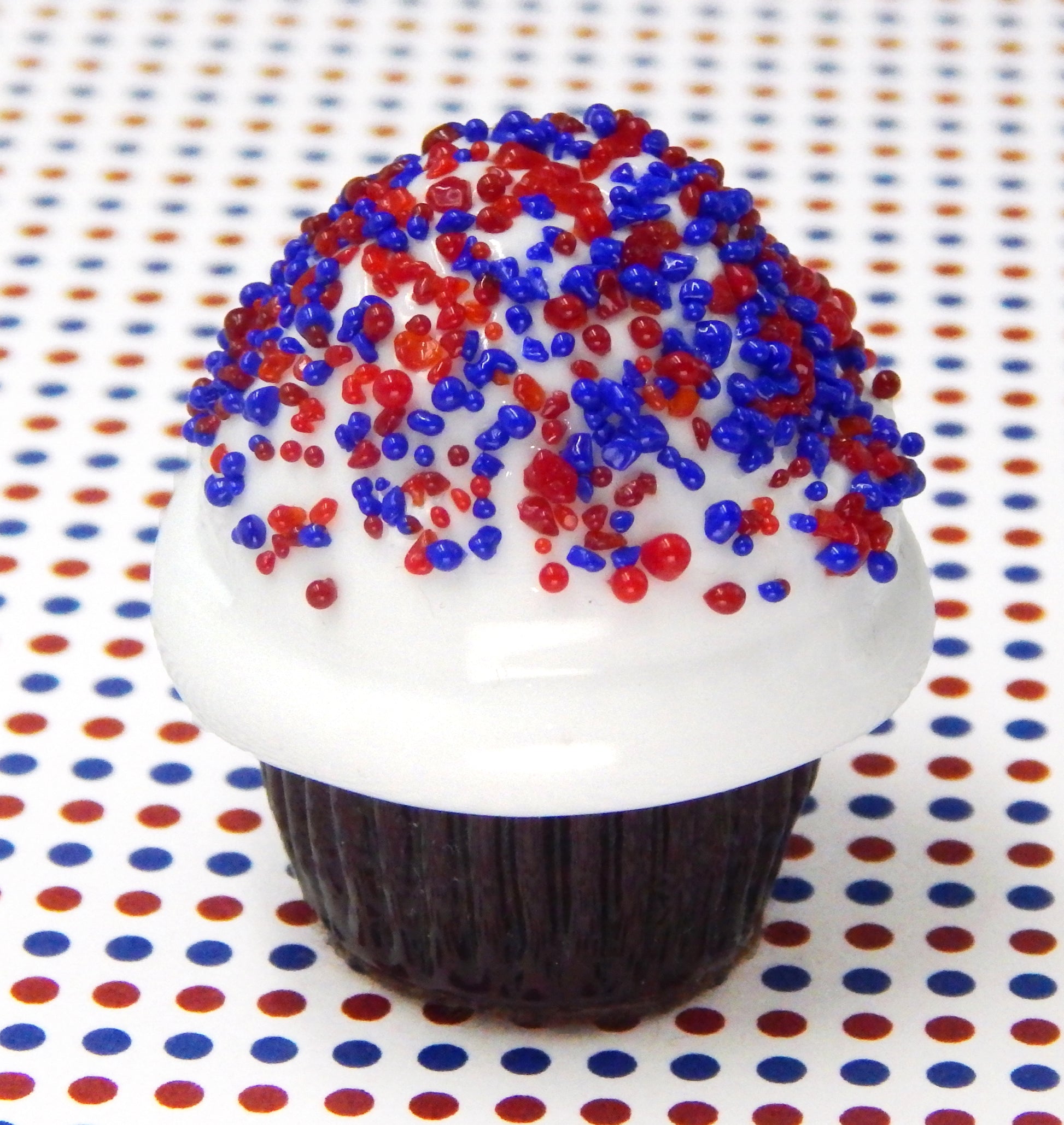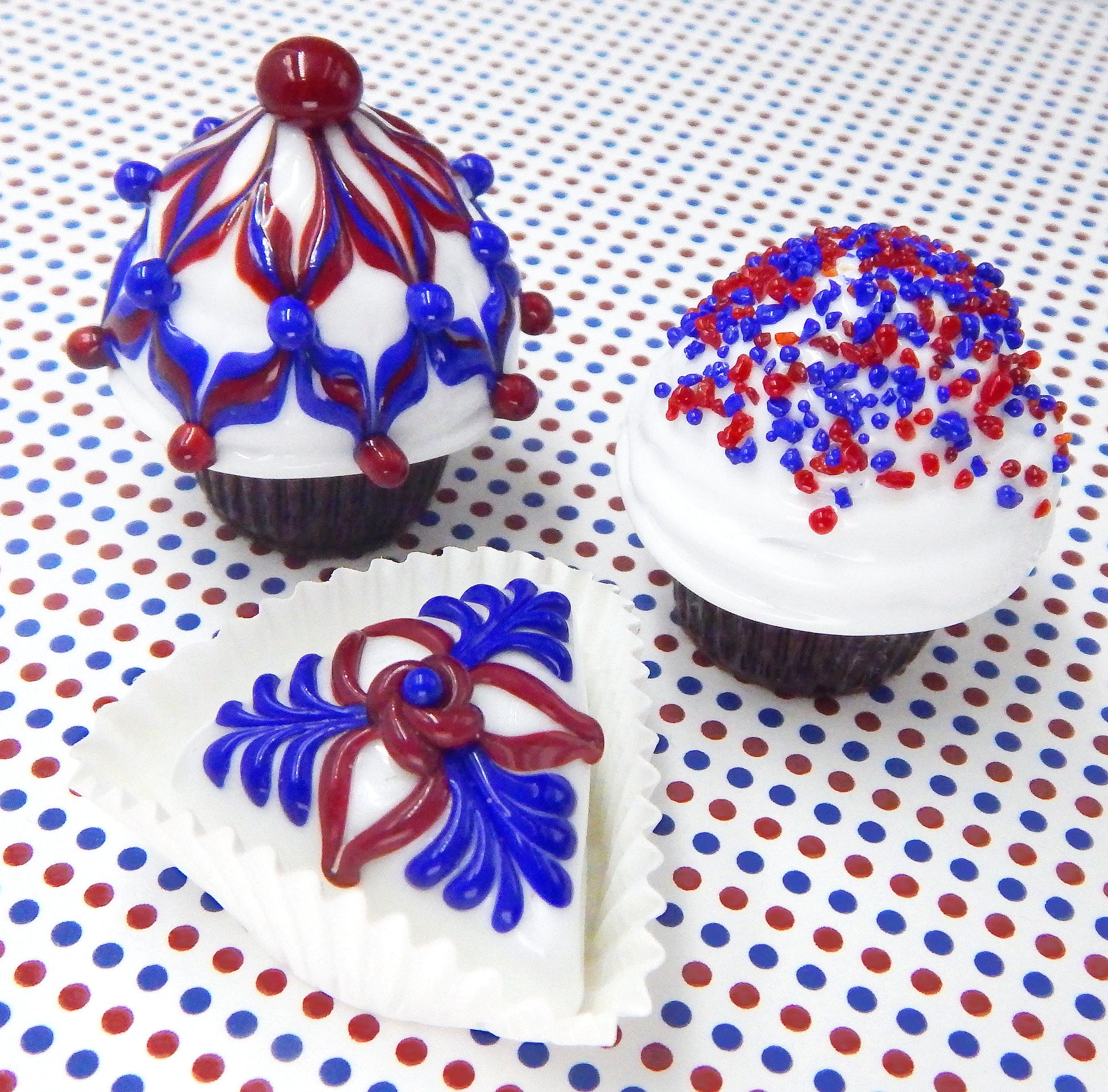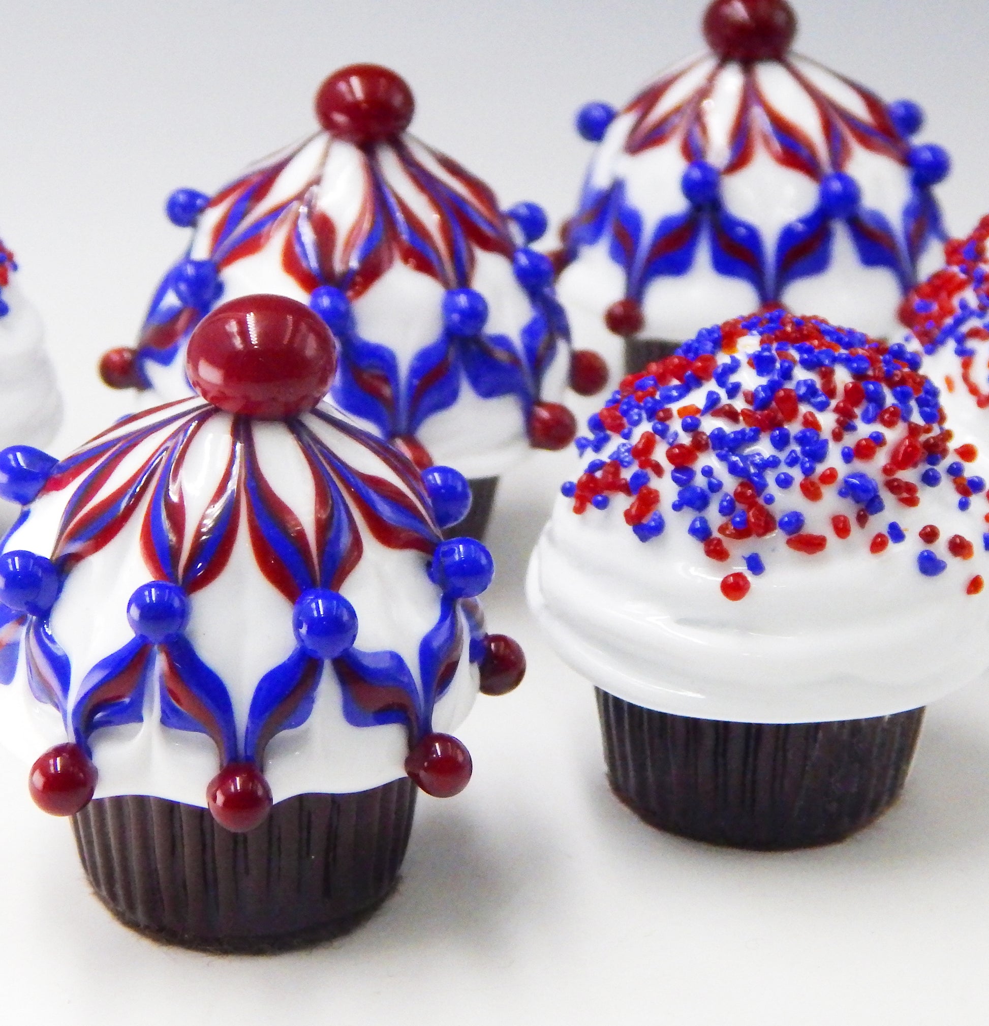 A handmade collectible solid glass Patriotic Mini Cupcake Truffle with sprinkes of red and blue on top created from colorful glass utilizing flameworking techniques. Meticulous attention to detail has gone into the construction of each of our pieces to enhance its appeal and collectibility.