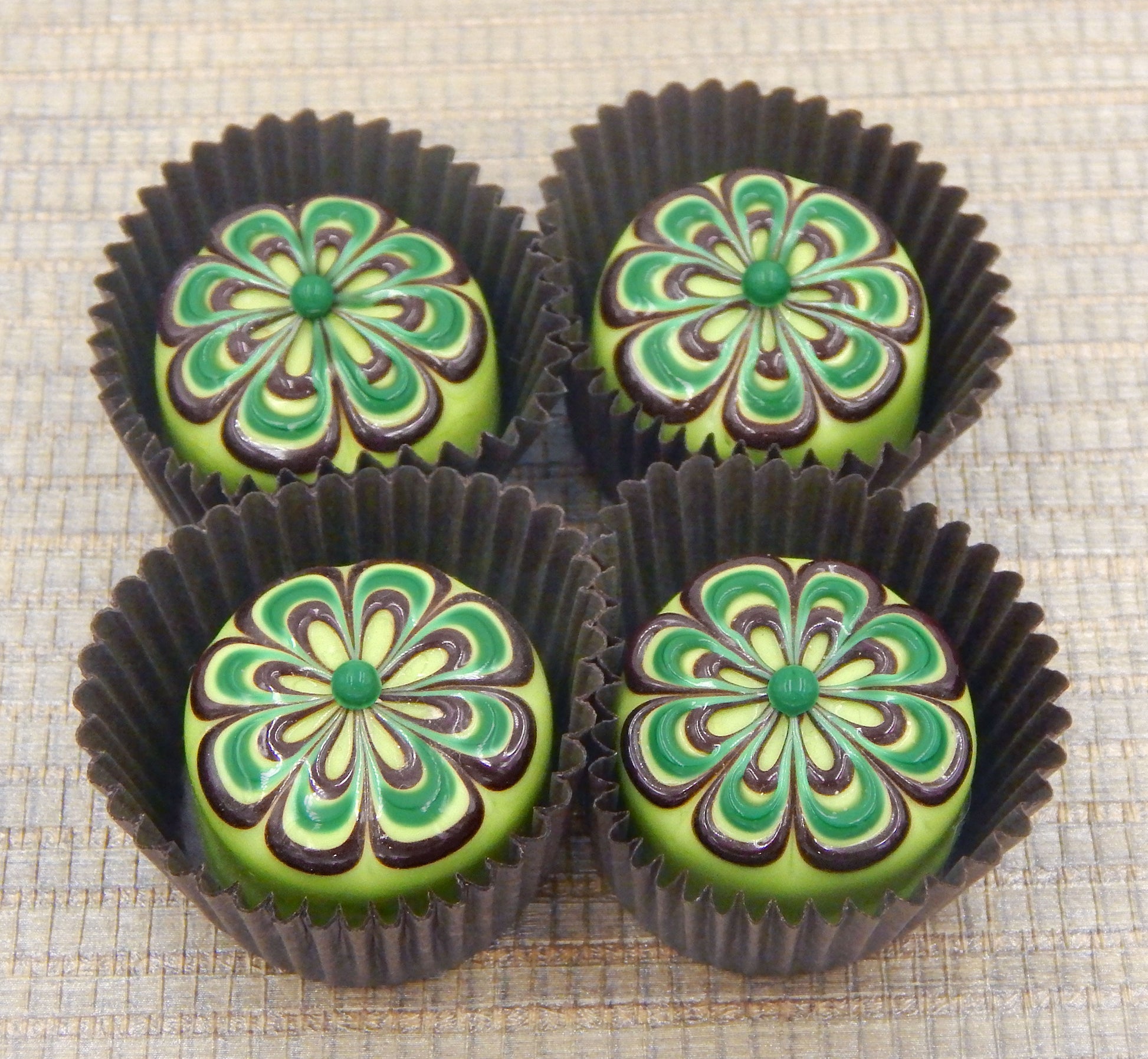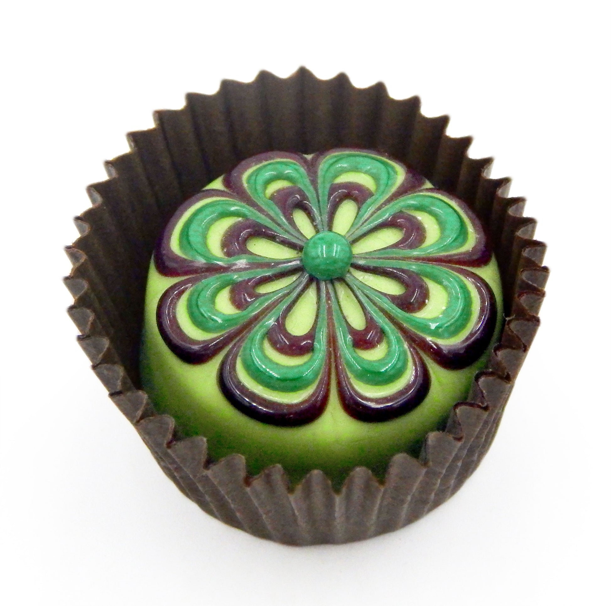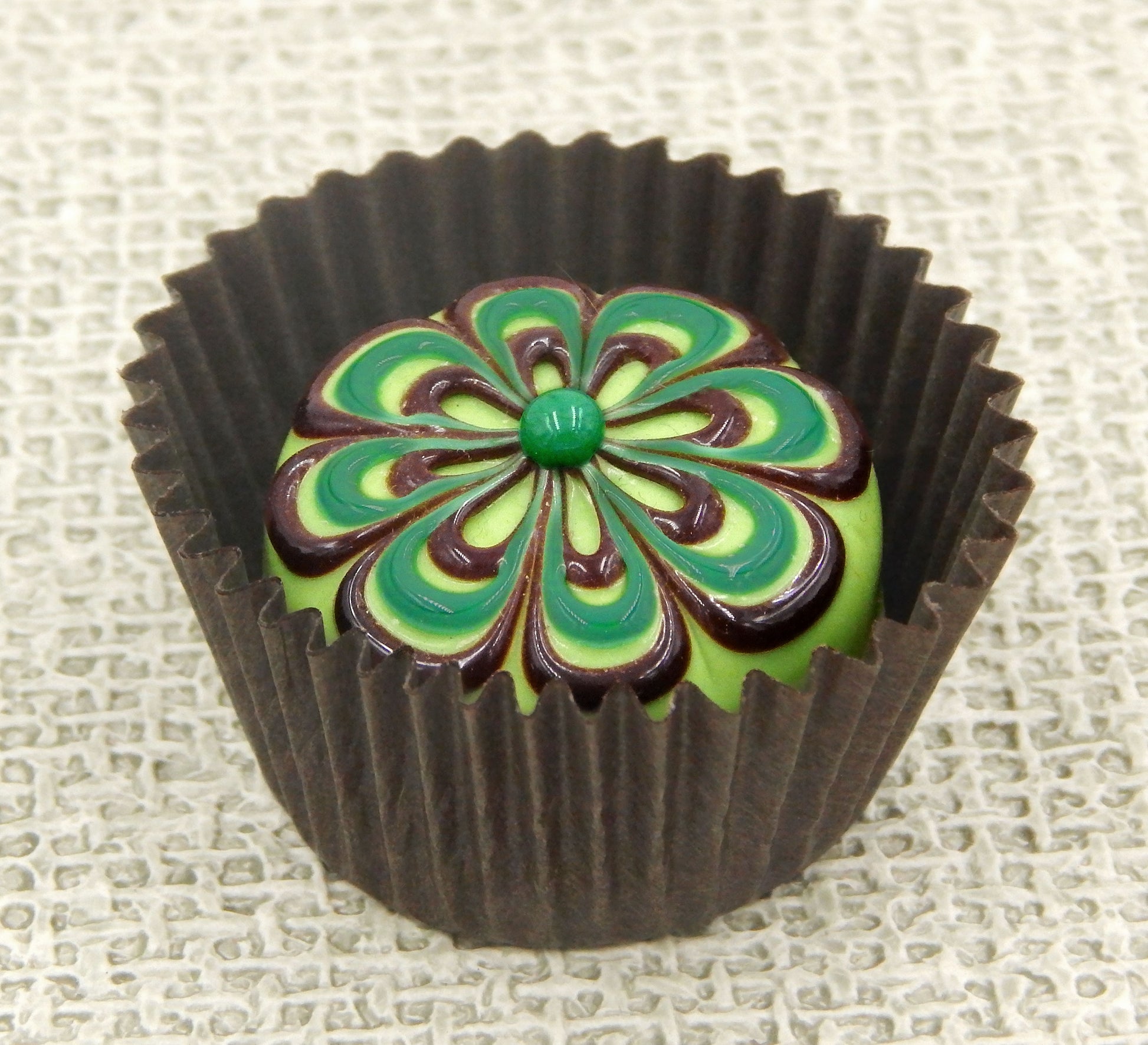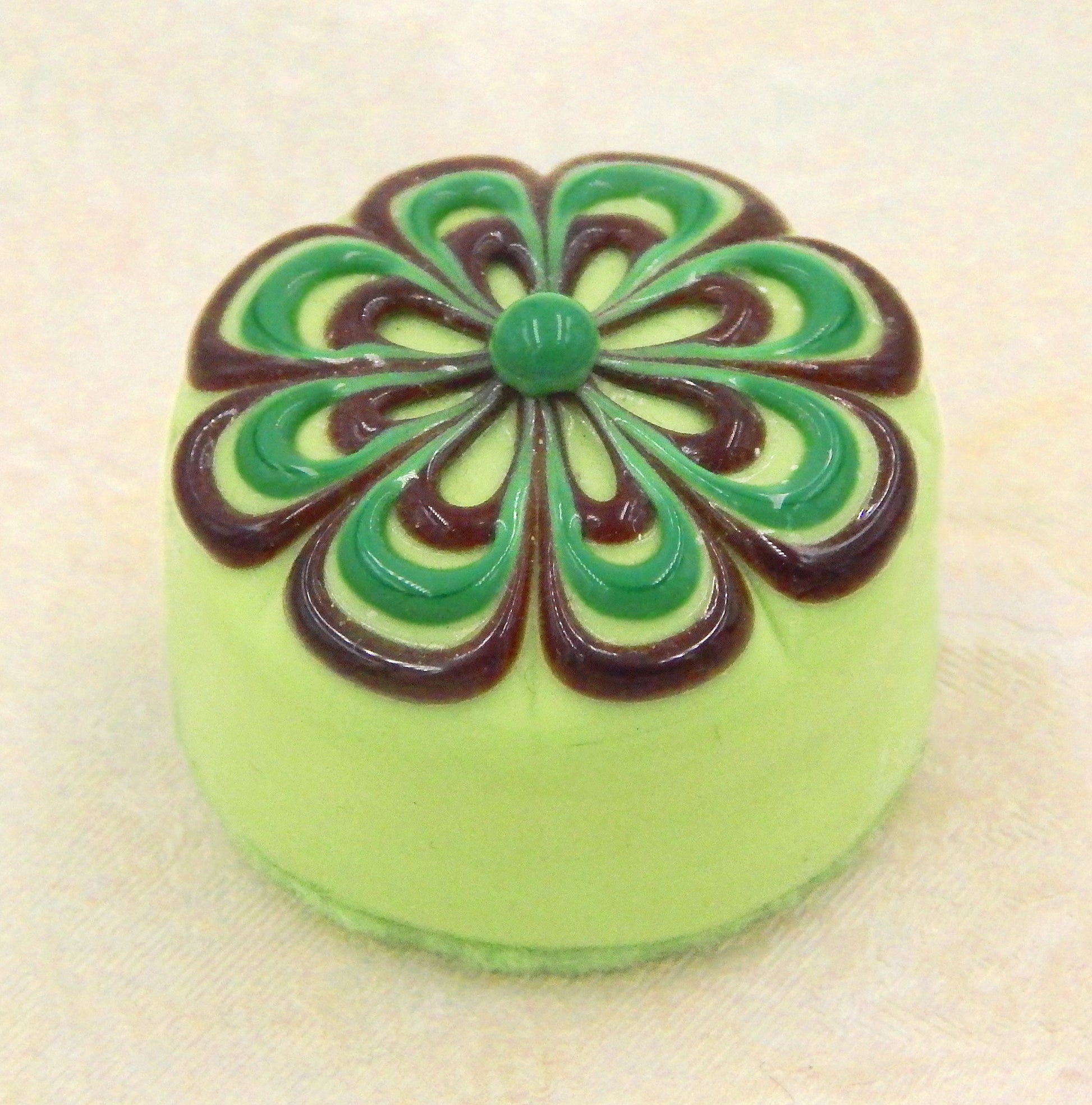 A handmade collectible solid glass pistachio green chocolate with a scrumptious chocolate and wintergreen floral design on top created from colorful glass utilizing flameworking techniques. Meticulous attention to detail has gone into the construction of each of our pieces to enhance its appeal and collectibility.