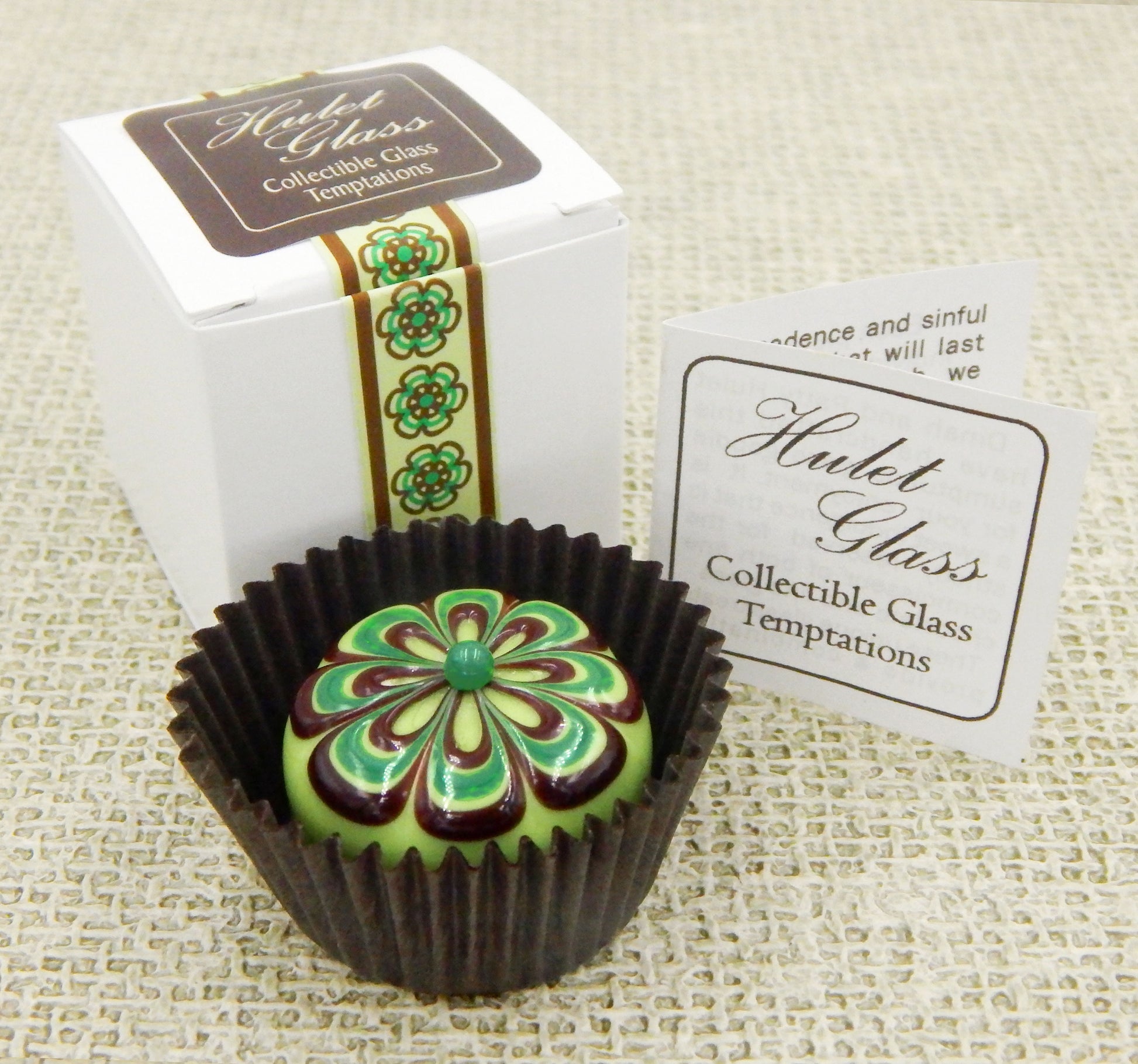 The glass chocolate measures approximately 1.25" x 1" (slightly larger than an actual chocolate candy) and sits in a fluted glassine paper candy cup. The bottom of the chocolate is covered in felt to protect the surface it will sit upon. Each beautiful glass chocolate is signed (Hulet), dated and comes to you in a colorful gift box with an enclosure card telling a bit about the piece.