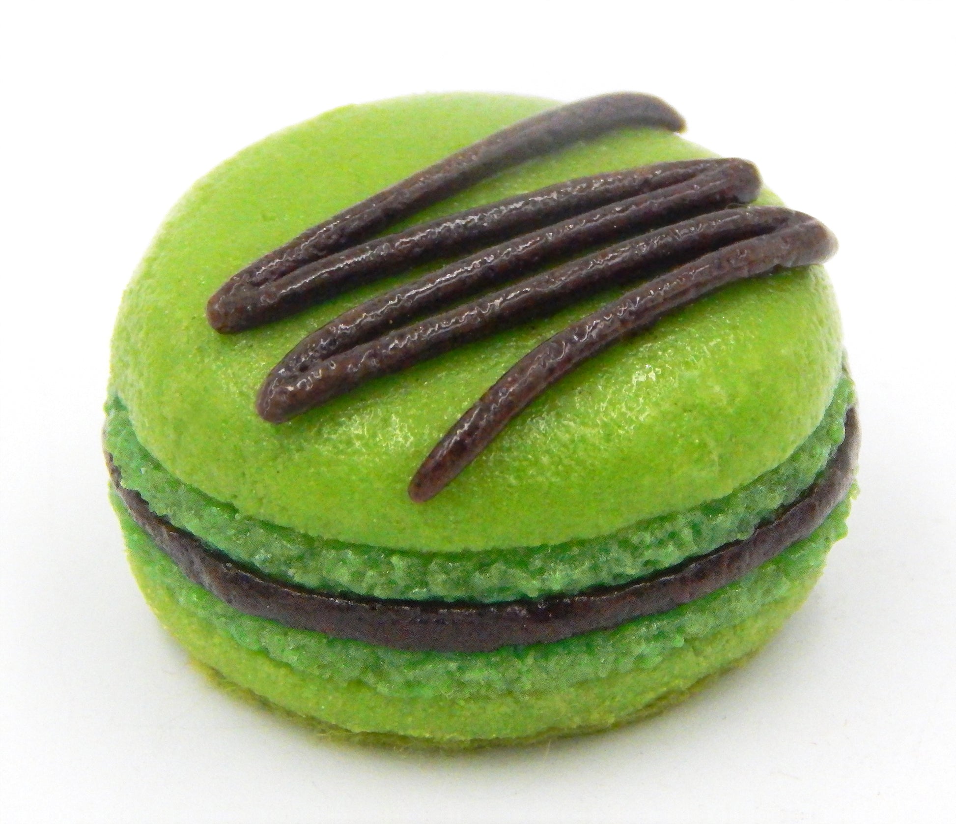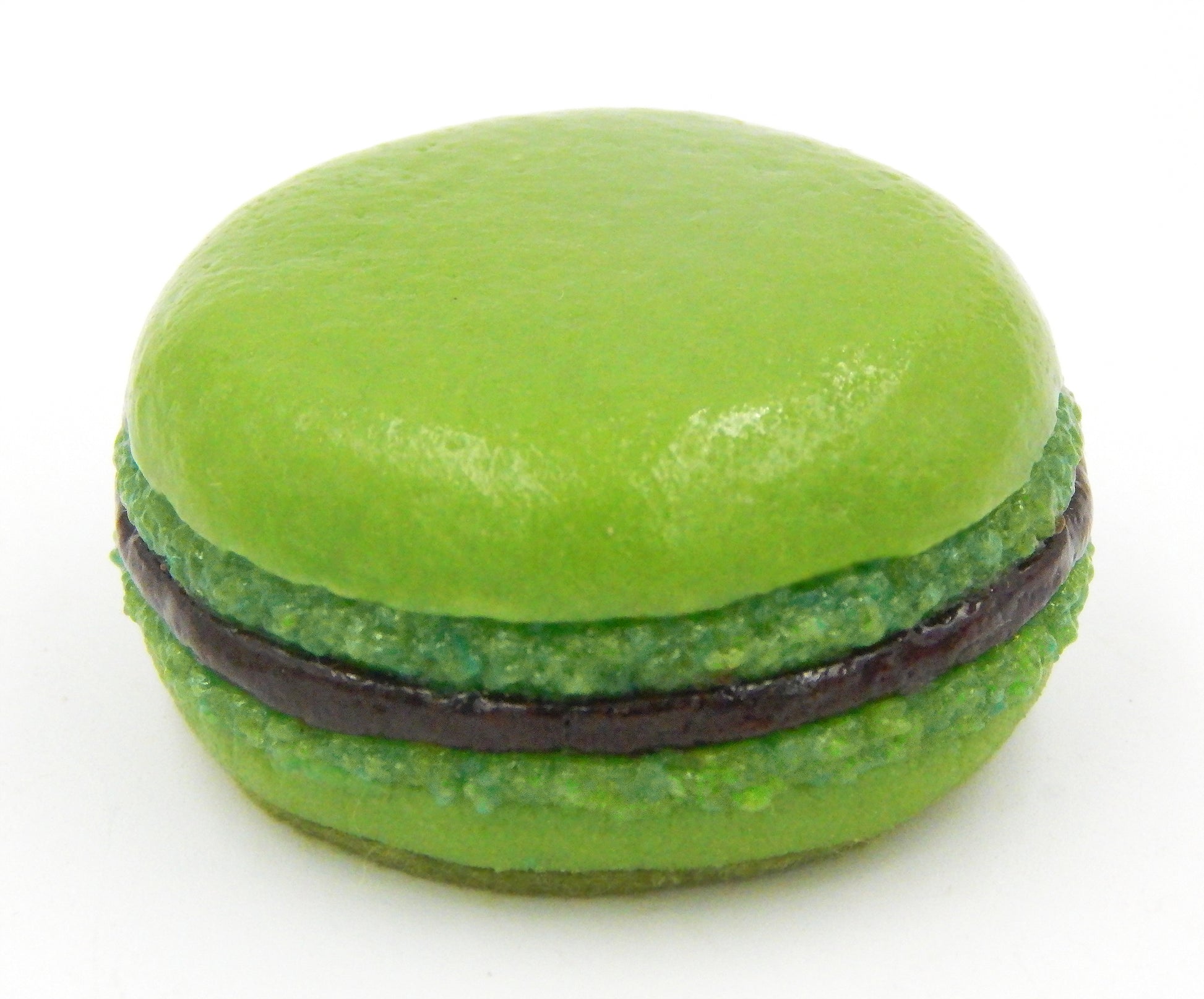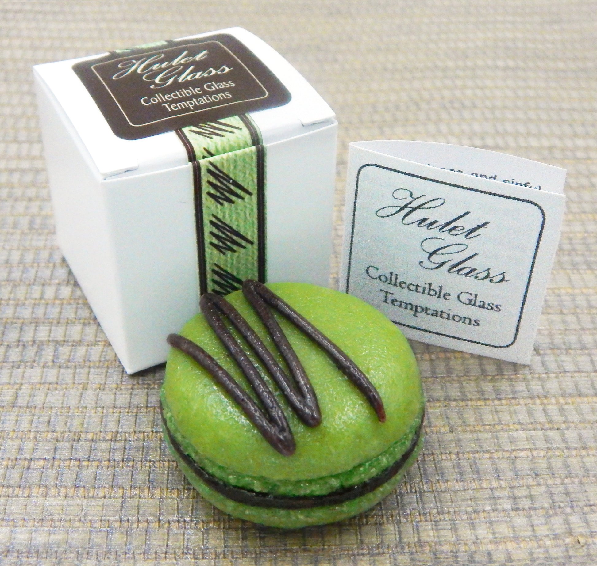 Collectible solid glass pistachio macarons filled with chocolate fudge cream liqueur ganache are created from finely ground colored glass powders using variations of the centuries old technique of pate de verre. Meticulous attention to detail has gone into the construction of each of our pieces to enhance its appeal and collectibility. We offer these macarons either plain or with a drizzle of the chocolate fudge ganache on top.