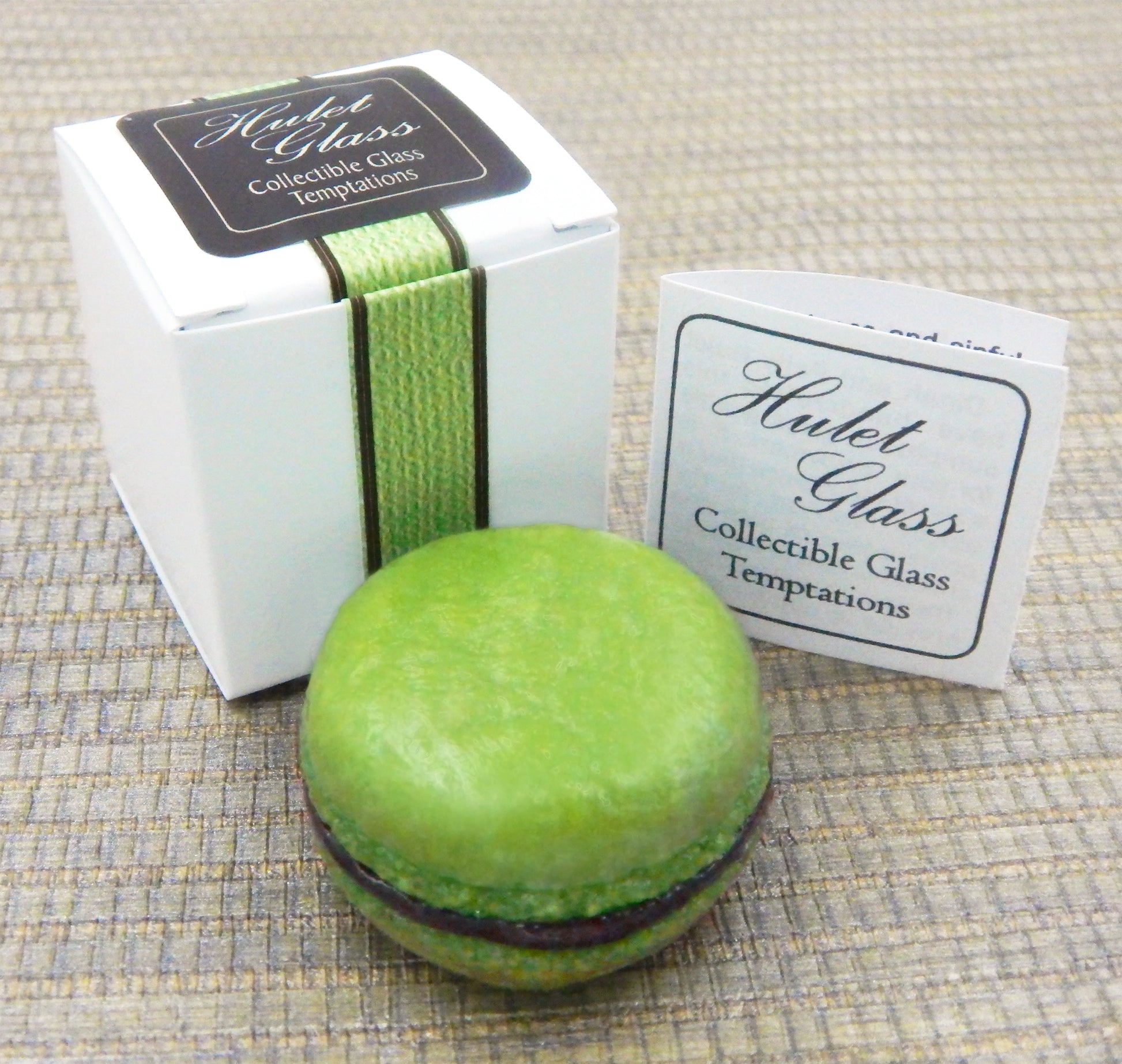 Each glass pistachio macaron measures approx. 1.75" diameter x 1" high. The bottom of the macaron is covered in felt to protect the surface it will sit upon. All of our beautiful glass treats are signed (Hulet), dated and come to you in a small gift box with an enclosure card telling a bit about the piece.