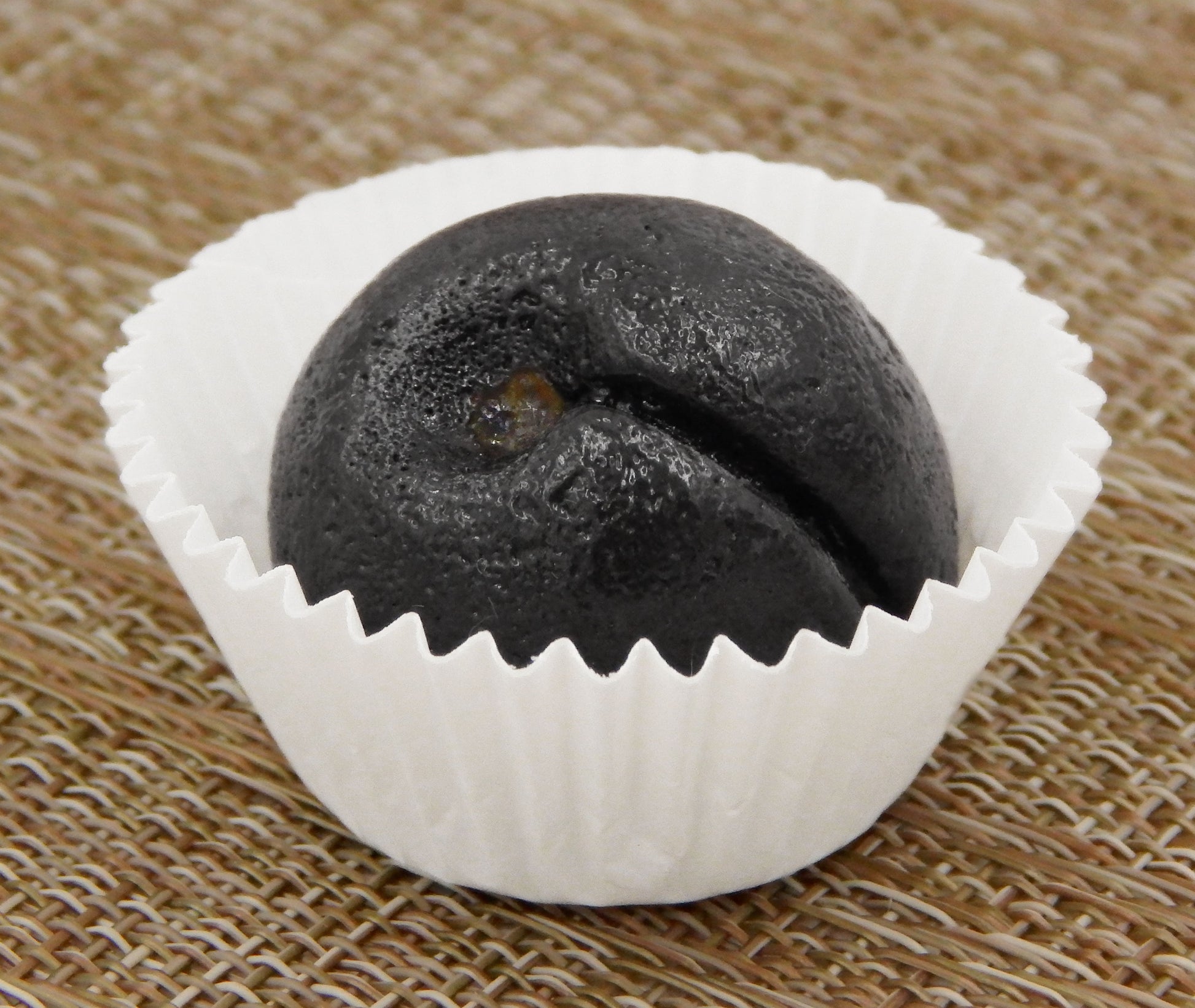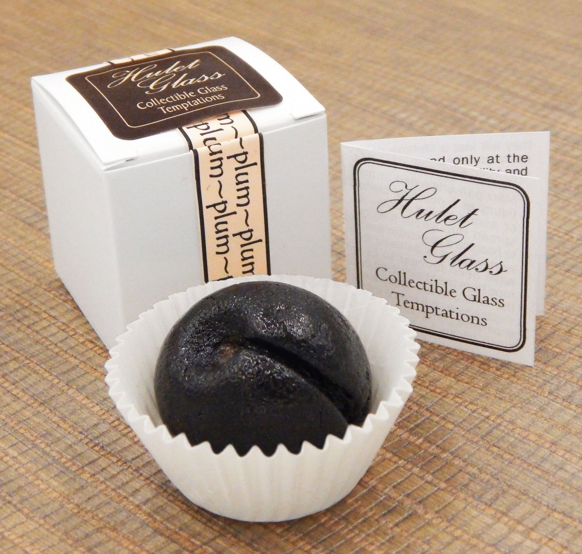 This glass marzipan black plum measures approx. 1.25" x 1.25" x 1" and sits in a fluted glassine paper candy cup. The bottom of the marzipan is covered in felt to protect the surface it will sit upon. Each of our beautiful glass treats is signed (Hulet), dated and comes to you in a small gift box with an enclosure card telling a bit about the piece.