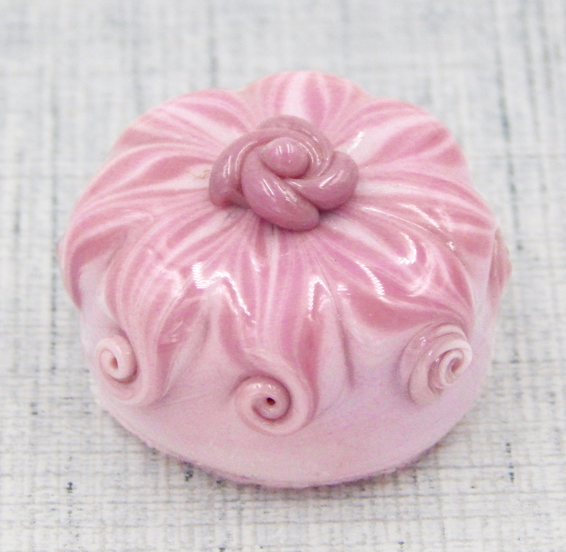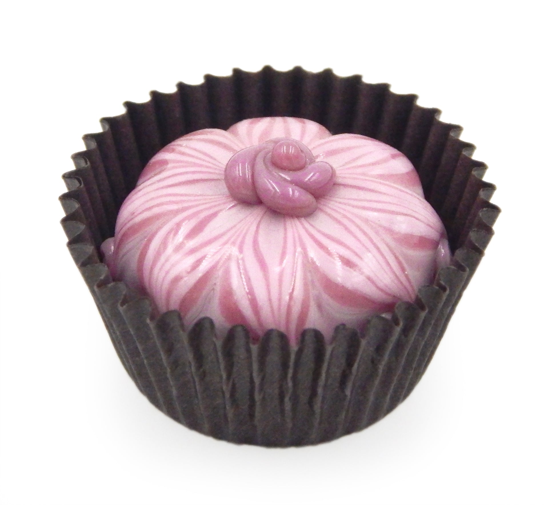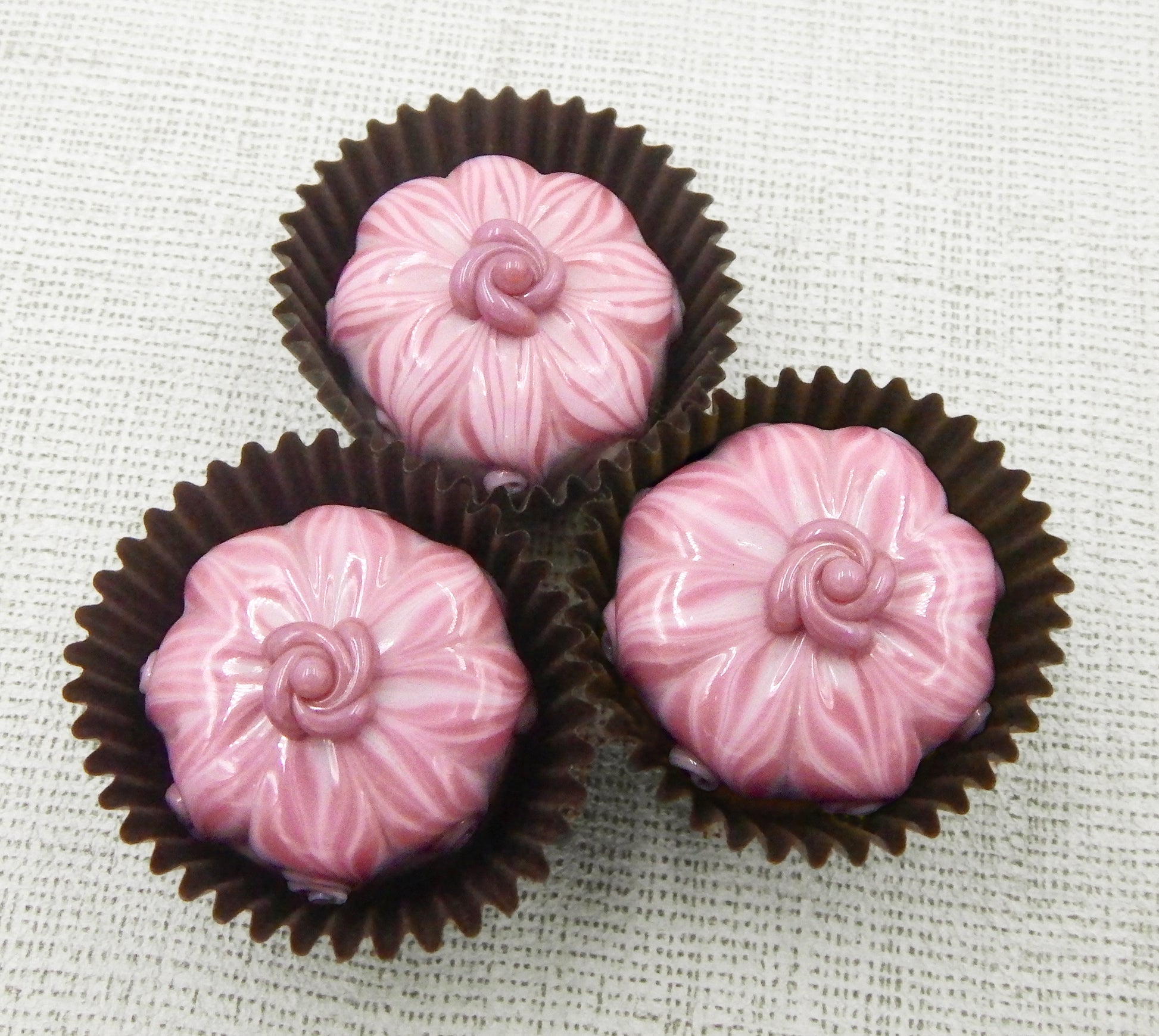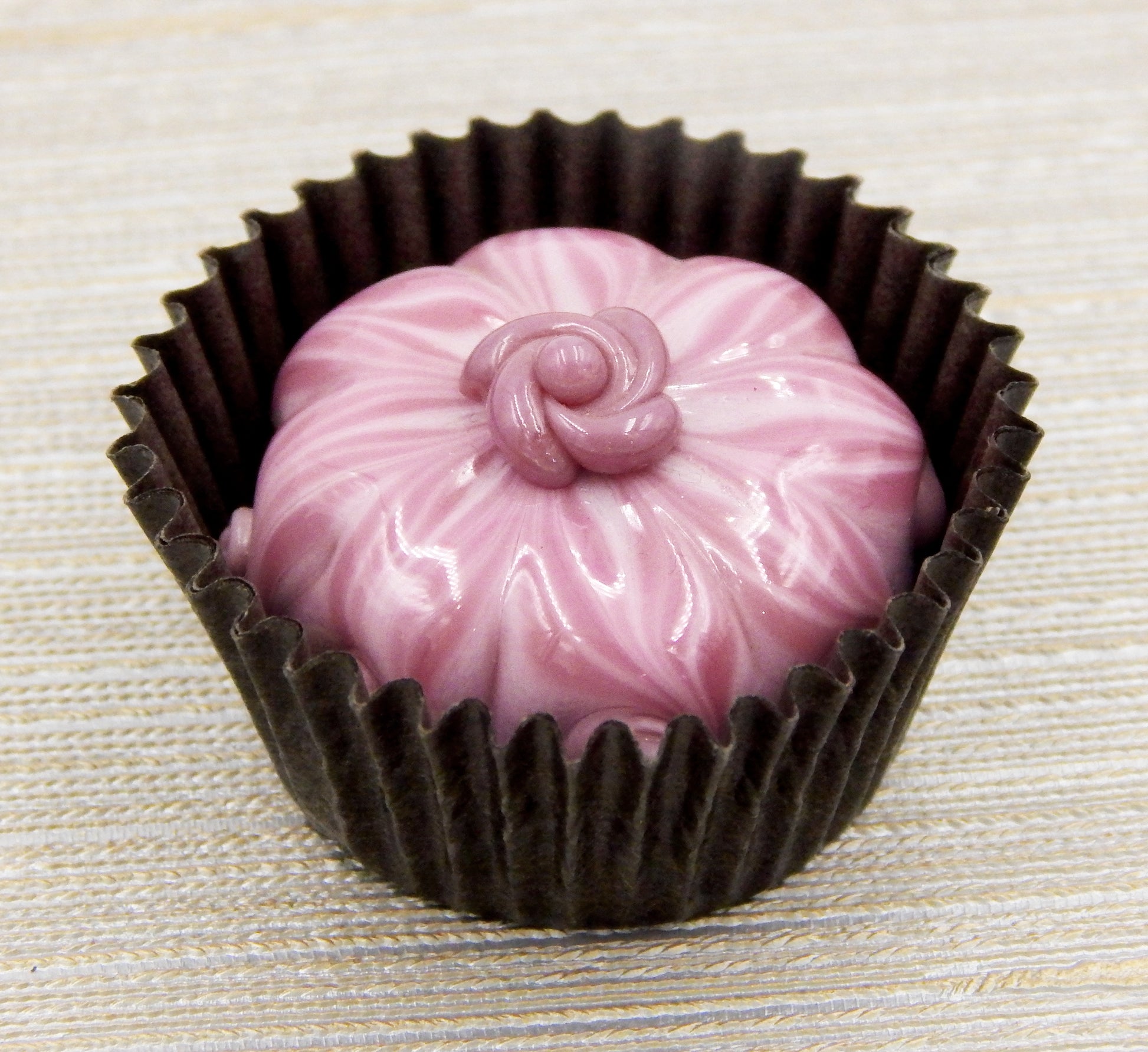 A handmade collectible solid glass strawberry chocolate with a scrumptious raspberry floral design on top created from colorful glass utilizing flameworking techniques. Meticulous attention to detail has gone into the construction of each of our pieces to enhance its appeal and collectibility.