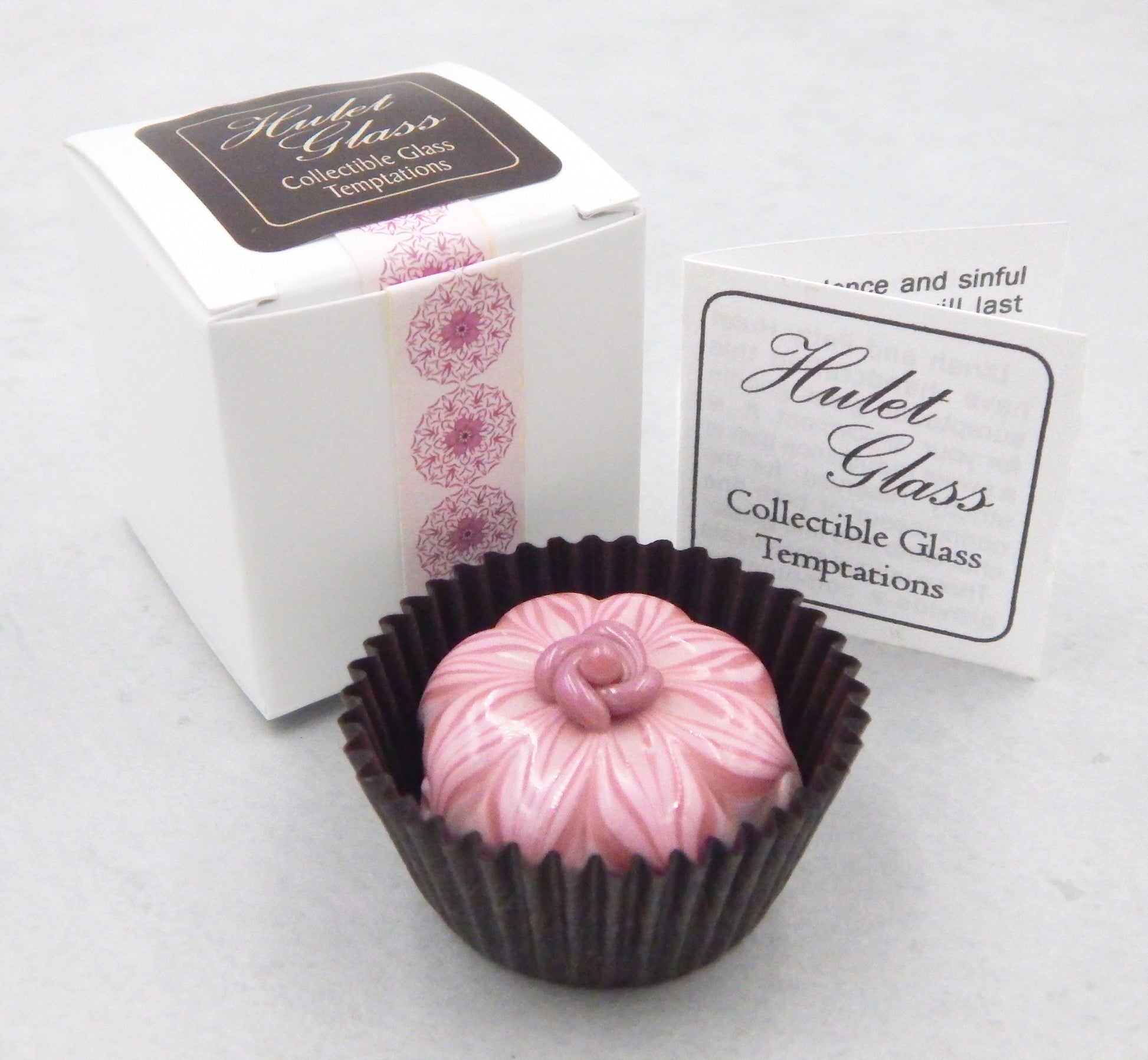 The glass chocolate measures approximately 1.25" x 1" (slightly larger than an actual chocolate candy) and sits in a fluted glassine paper candy cup. The bottom of the chocolate is covered in felt to protect the surface it will sit upon. Each beautiful glass chocolate is signed (Hulet), dated and comes to you in a colorful gift box with an enclosure card telling a bit about the piece.