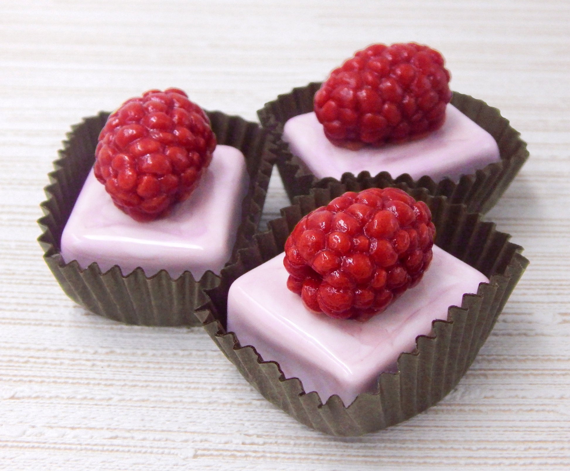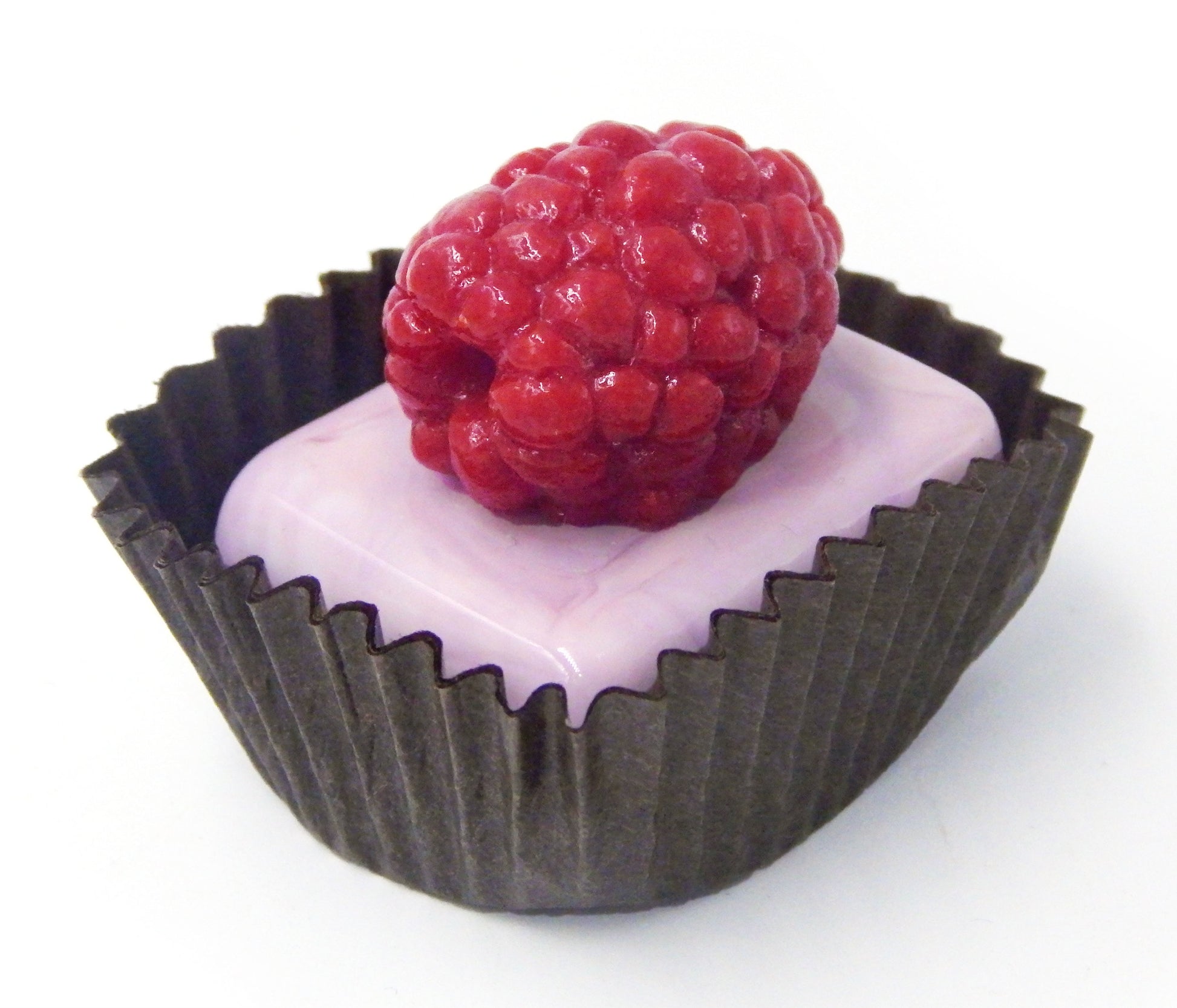 A handmade collectible solid glass juicy raspberry sitting atop a pink chocolate created from colorful glass utilizing ancient pate de verre and lampworking techniques. Meticulous attention to detail has gone into the construction of each of our pieces to enhance its appeal and collectibility.