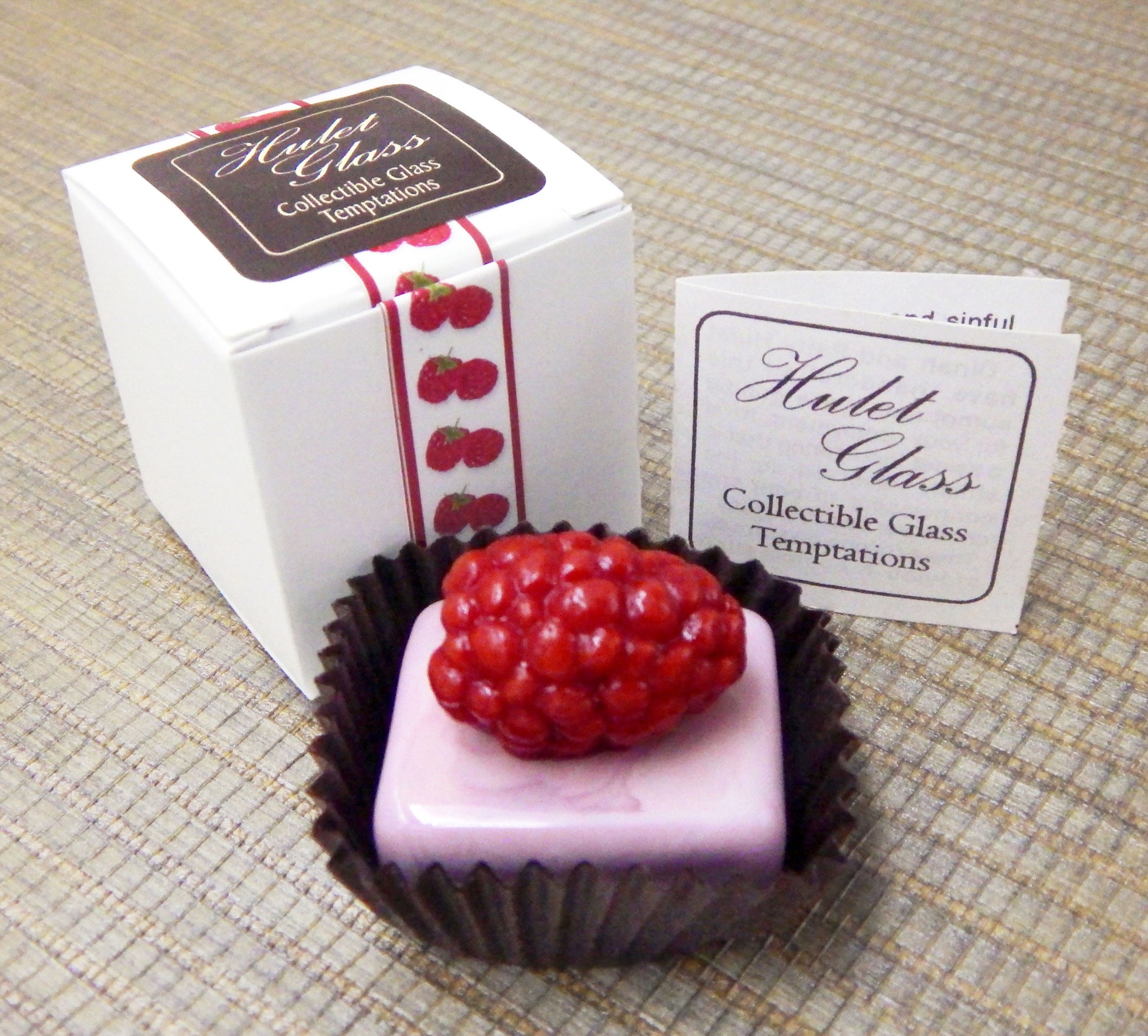 The glass chocolate measures approximately 1.5" x 1.25" x 1.25" (slightly larger than an actual chocolate candy) and sits in a fluted glassine paper candy cup. The bottom of the chocolate is covered in felt to protect the surface it will sit upon. Each beautiful glass chocolate is signed (Hulet), dated and comes to you in a colorful gift box with an enclosure card telling a bit about the piece.
