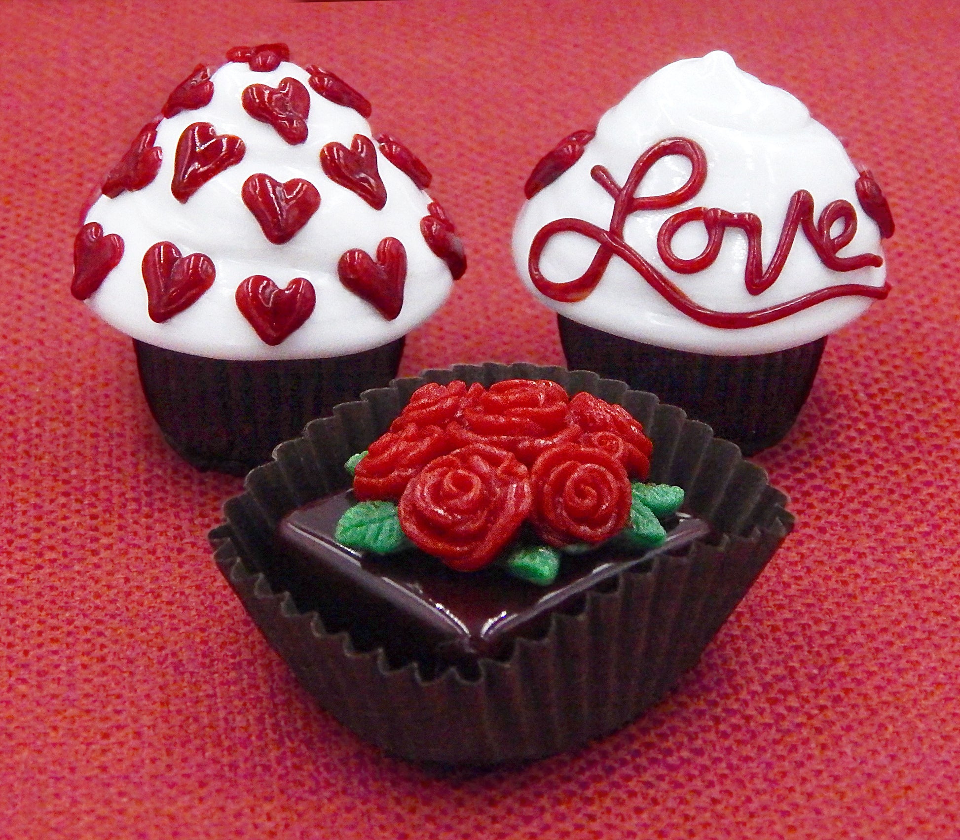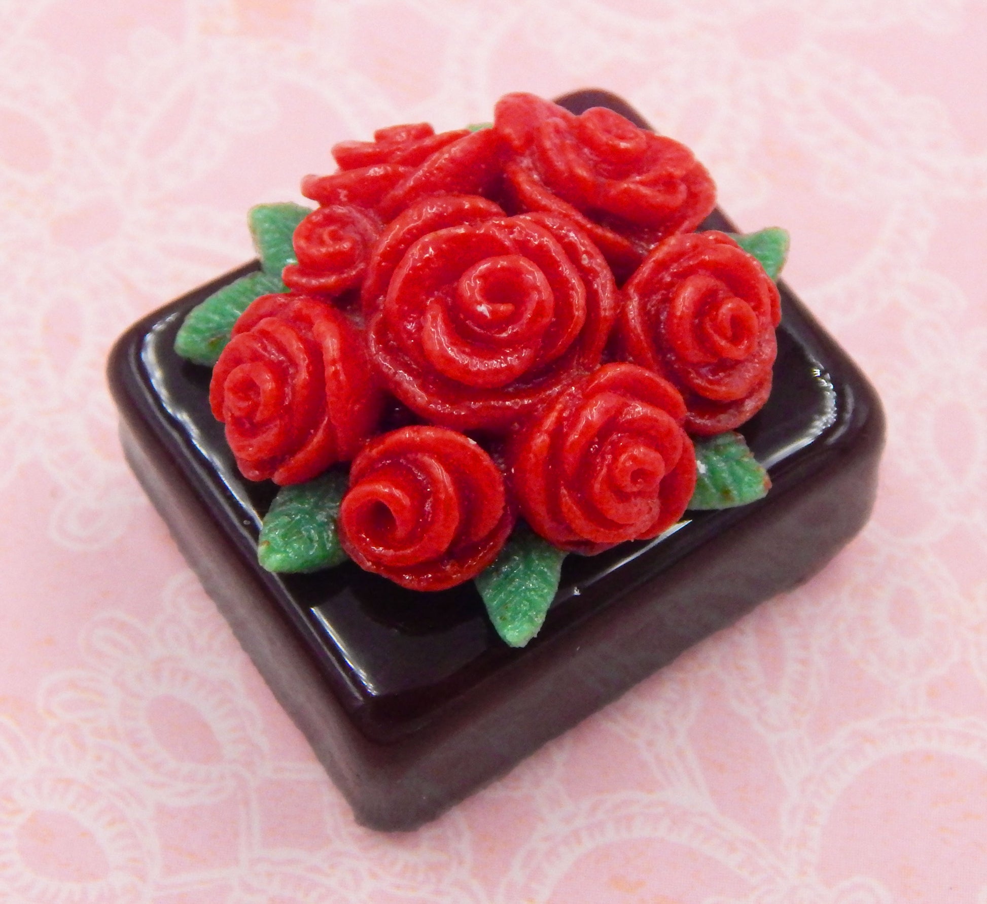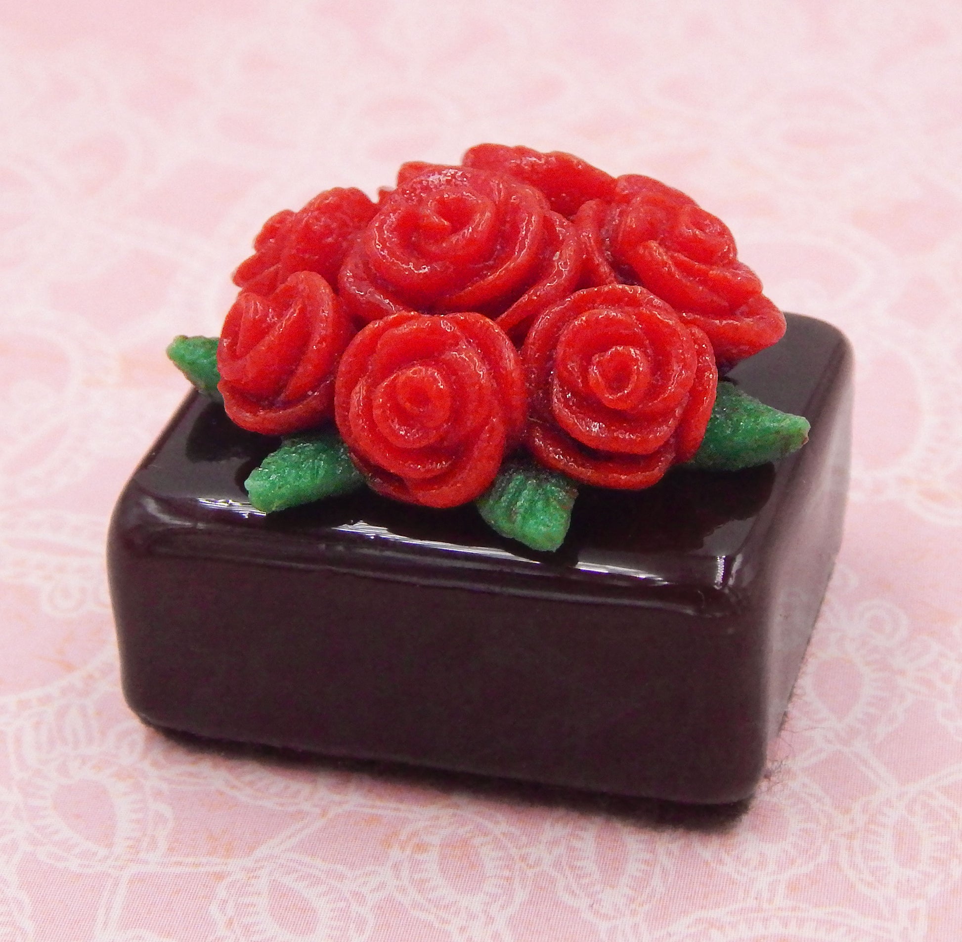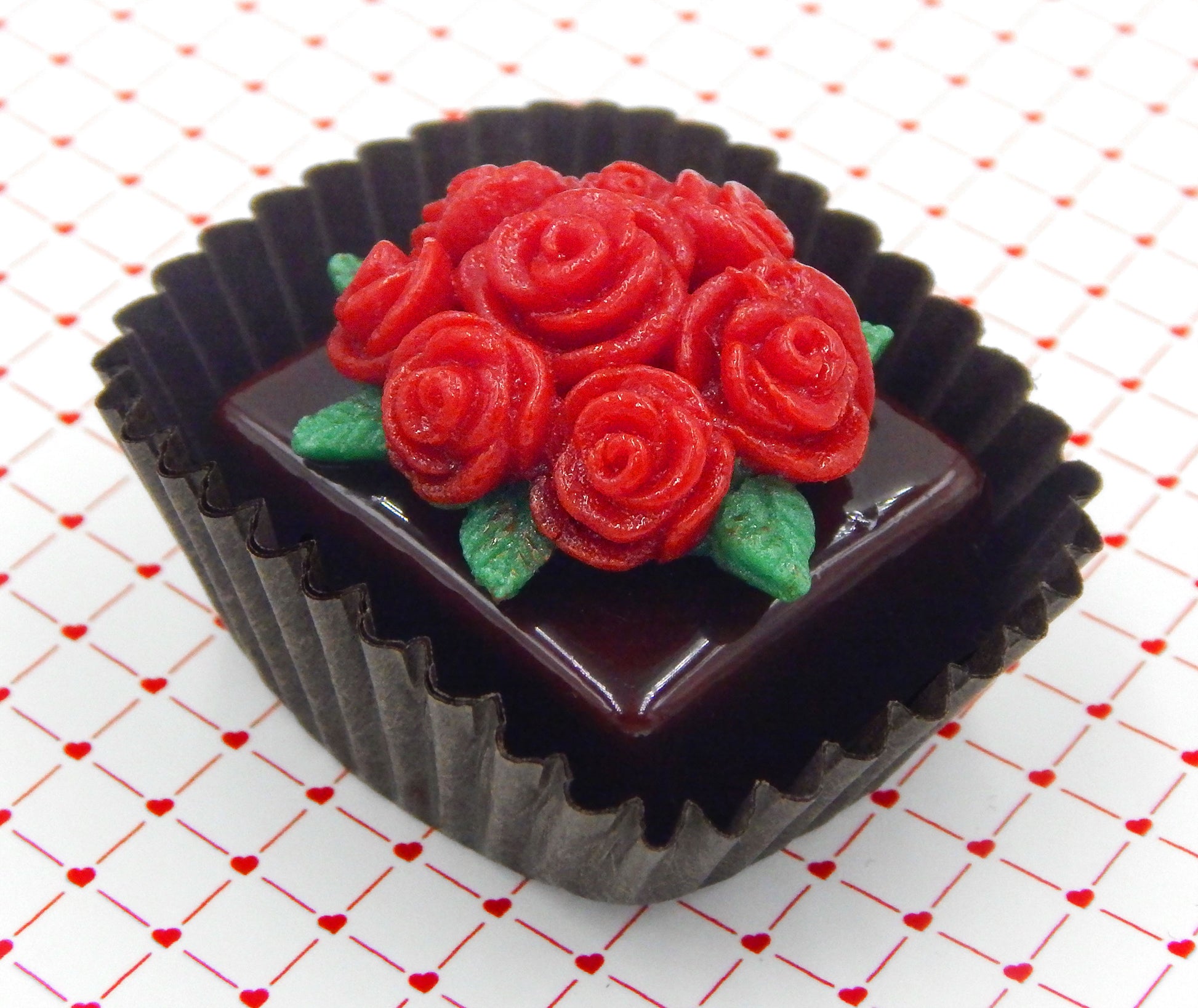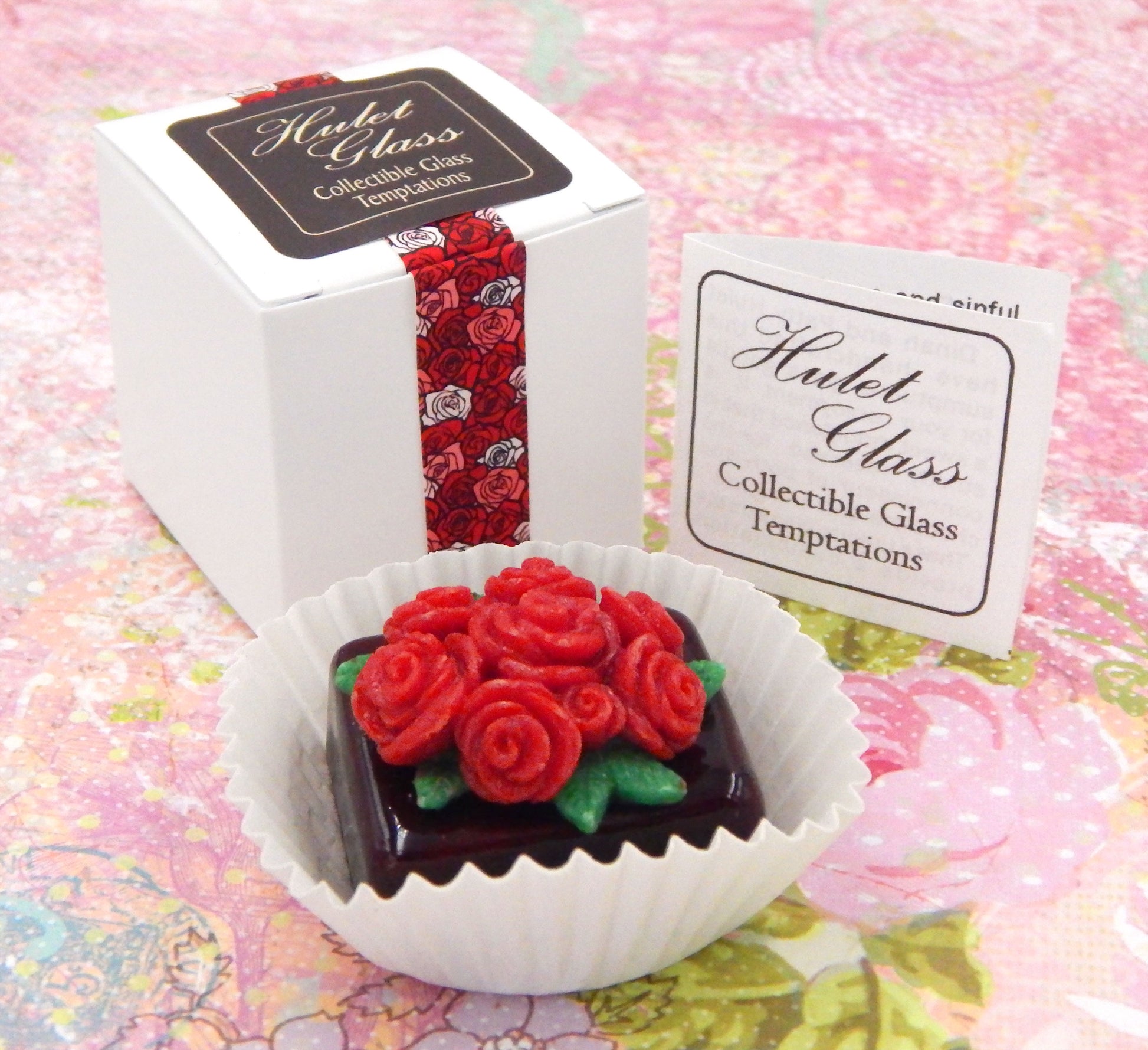 A handmade collectible solid glass chocolate petit four with a beautiful red rose bouquet on top created from colorful glass utilizing ancient pate de verre and lampworking techniques. Meticulous attention to detail has gone into the construction of each of our pieces to enhance its appeal and collectibility.