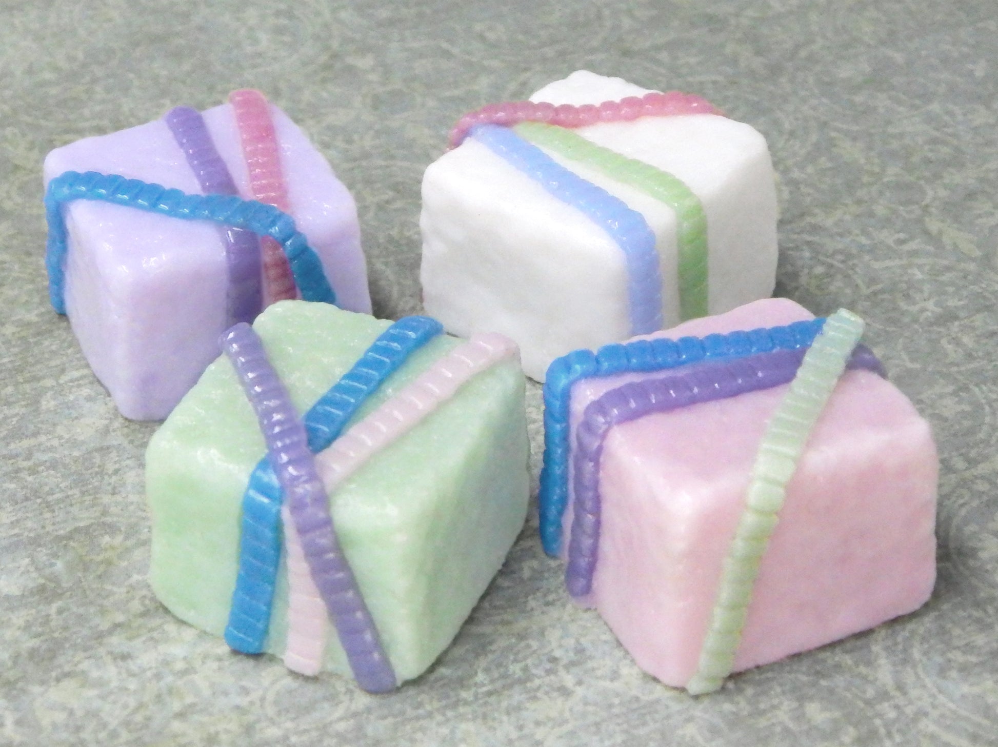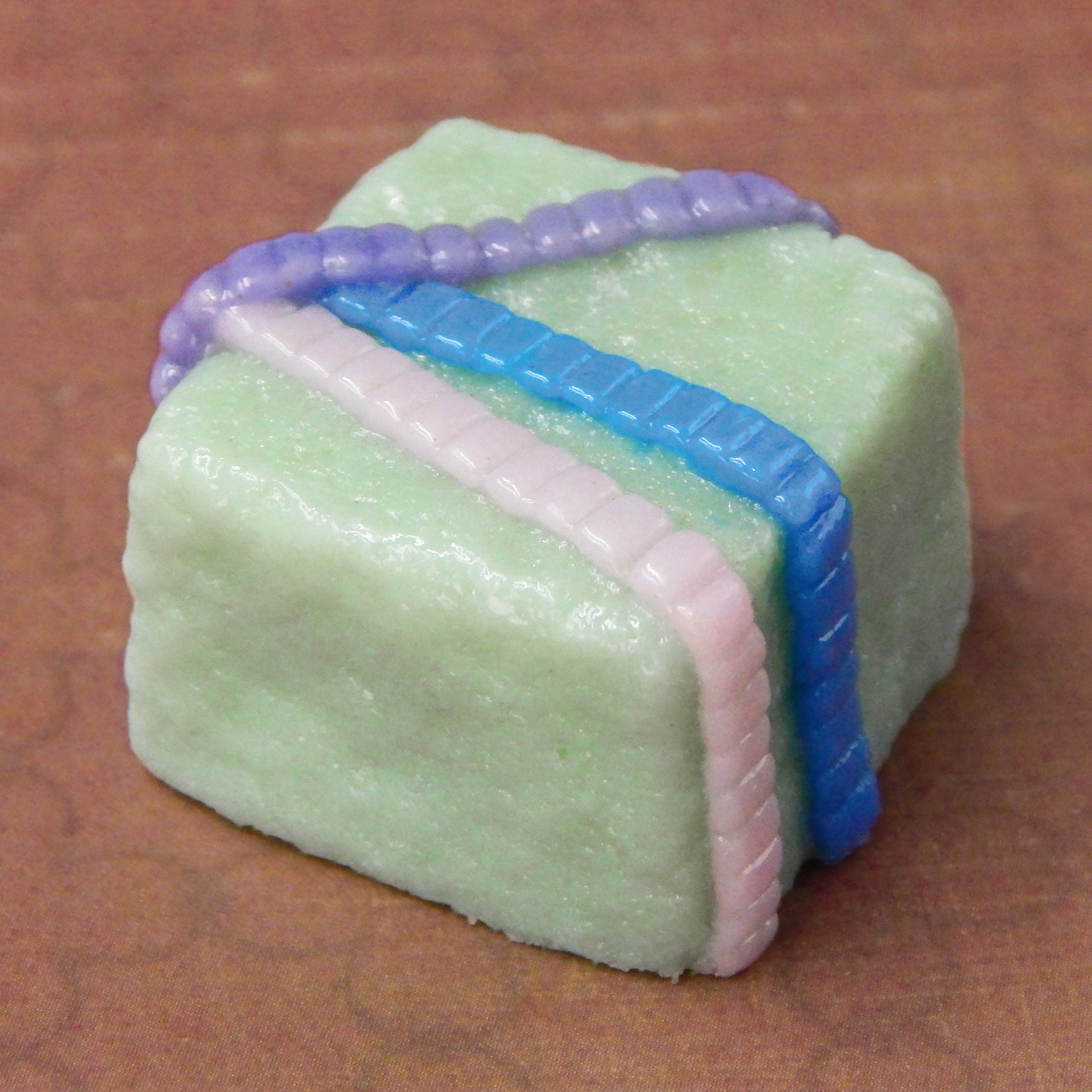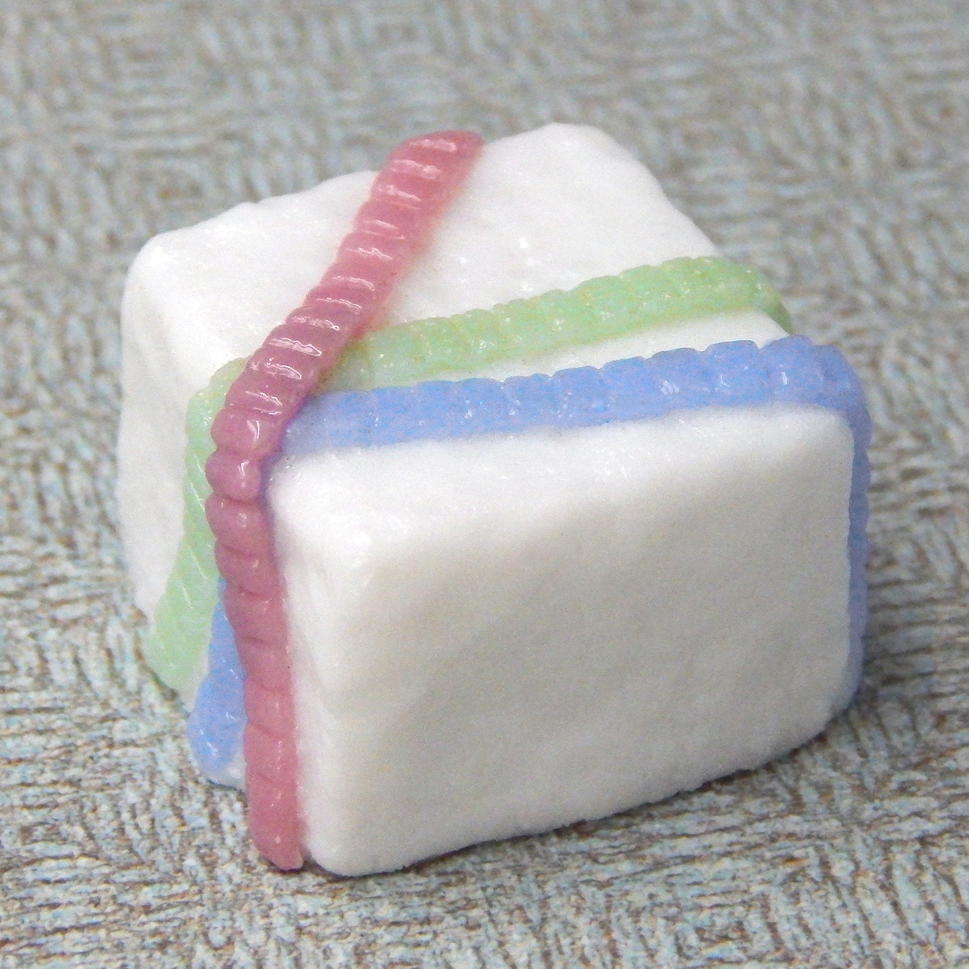 Handmade collectible solid cubes of ribbon draped glass. These glass treats are created from finely ground colored glass powders using variations of the centuries old technique of pate de verre (no paints are used in our work). Meticulous attention to detail has gone into the construction of each of our pieces to enhance its appeal and collectibility.