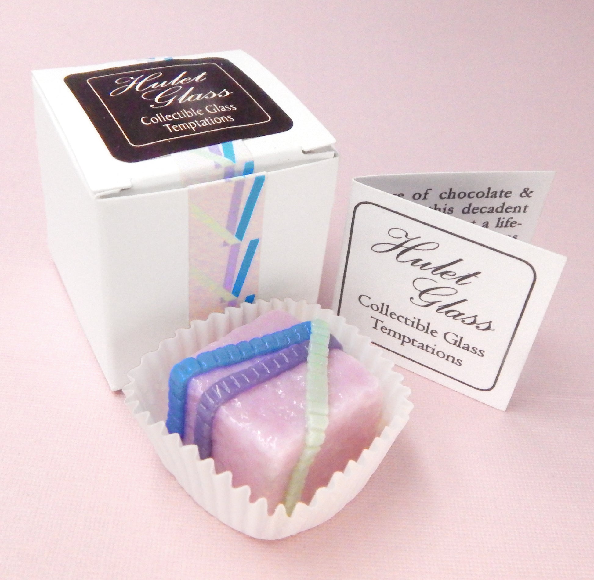 The glass chocolate measures 1" x 1" x .75" (slightly larger than an actual chocolate candy) and sits in a fluted glassine paper candy cup. The bottom of the chocolate is covered in felt to protect the surface it will sit upon. Each beautiful glass chocolate is signed (Hulet), dated and comes to you in a small gift box with an enclosure card telling a bit about the piece.
