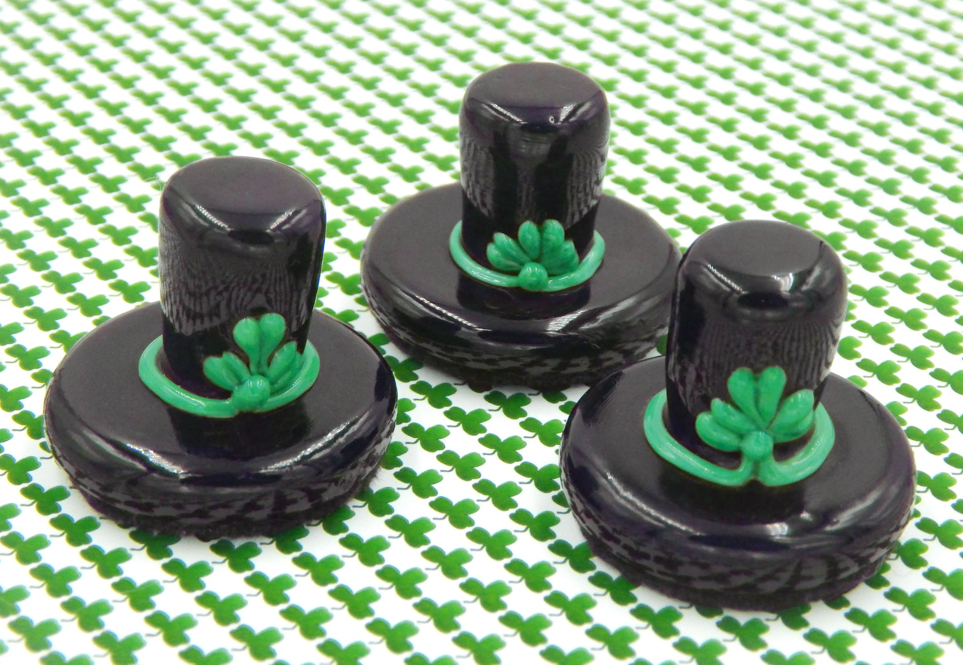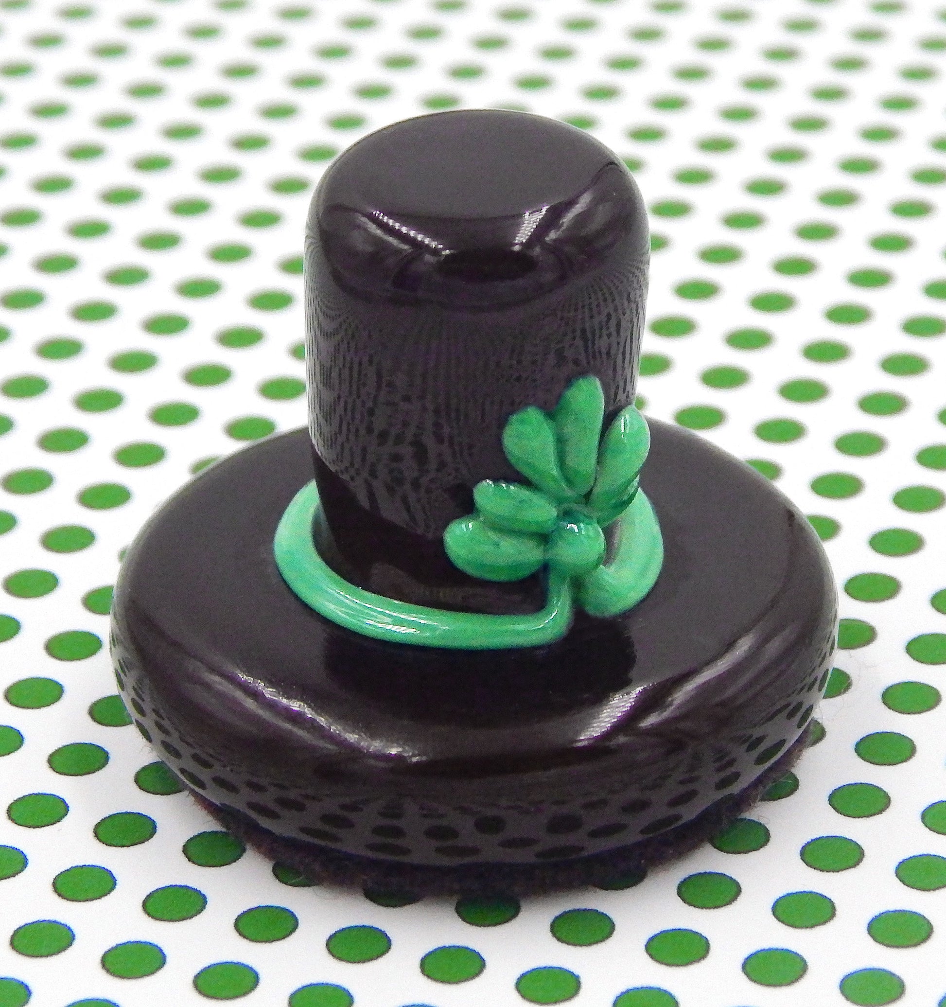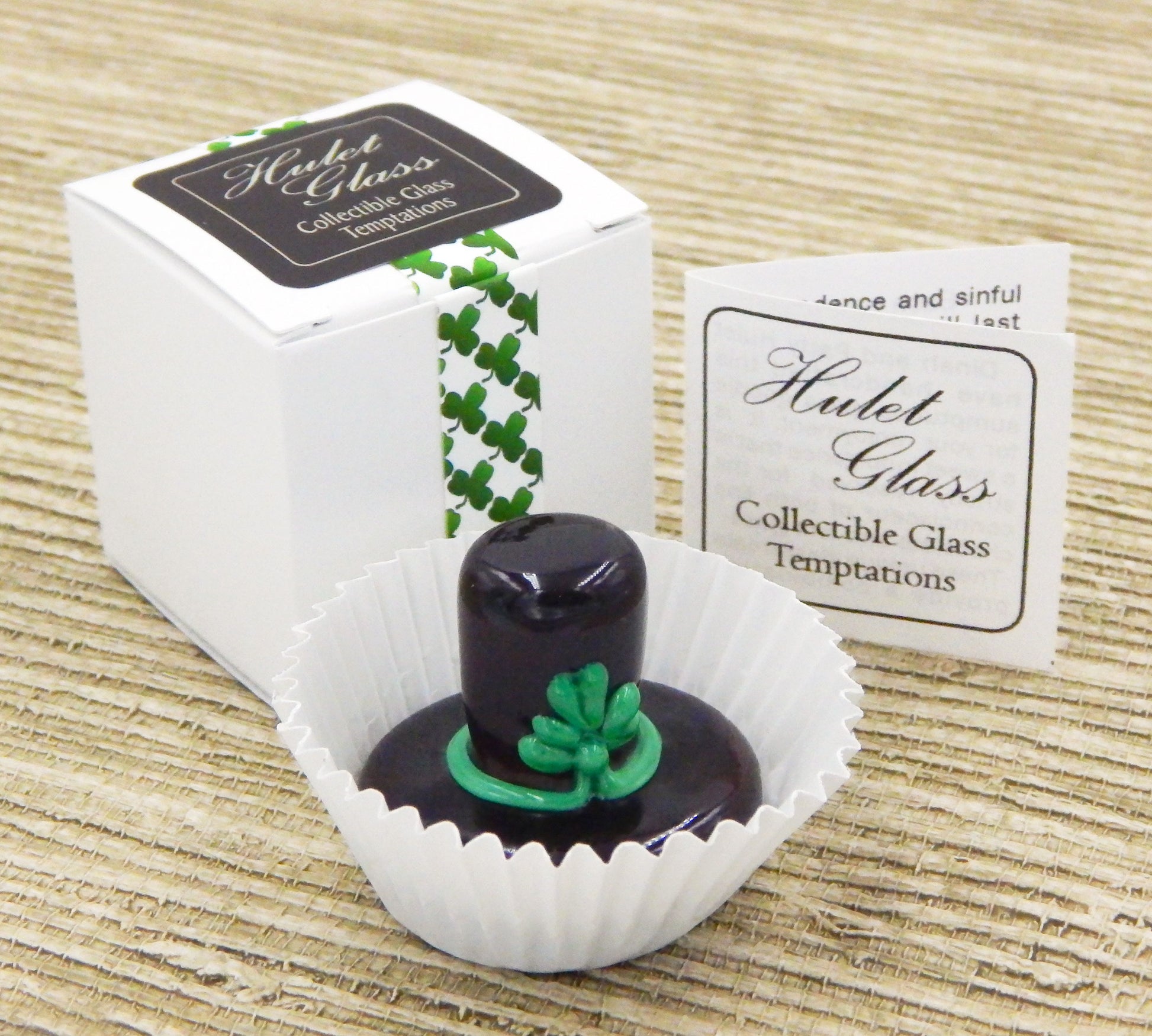 A handmade collectible solid glass chocolate Leprechaun Hat with a creamy St. Patrick's Day Shamrock created from colorful glass utilizing ancient lampworking techniques. Meticulous attention to detail has gone into the construction of each of our pieces to enhance its appeal and collectibility.