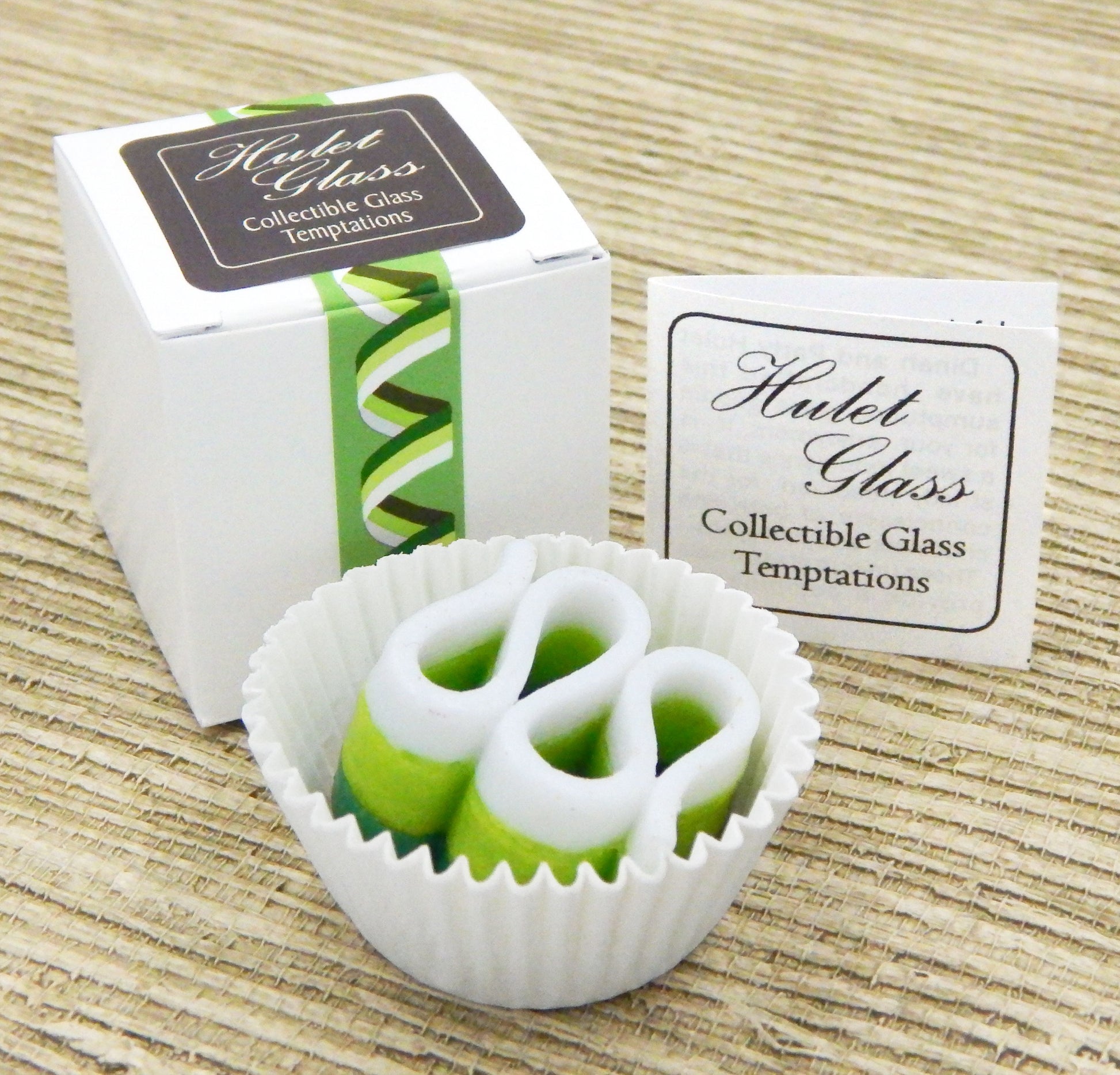 The glass ribbon candy measures 1.25" x 1" x .75" and sits in a fluted glassine paper candy cup. Each beautiful glass candy is signed (Hulet), dated and comes to you in a colorful gift box with an enclosure card telling a bit about the piece.