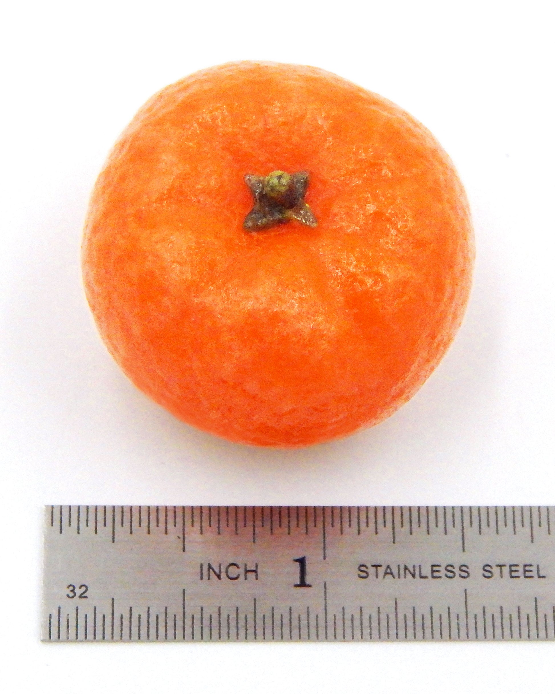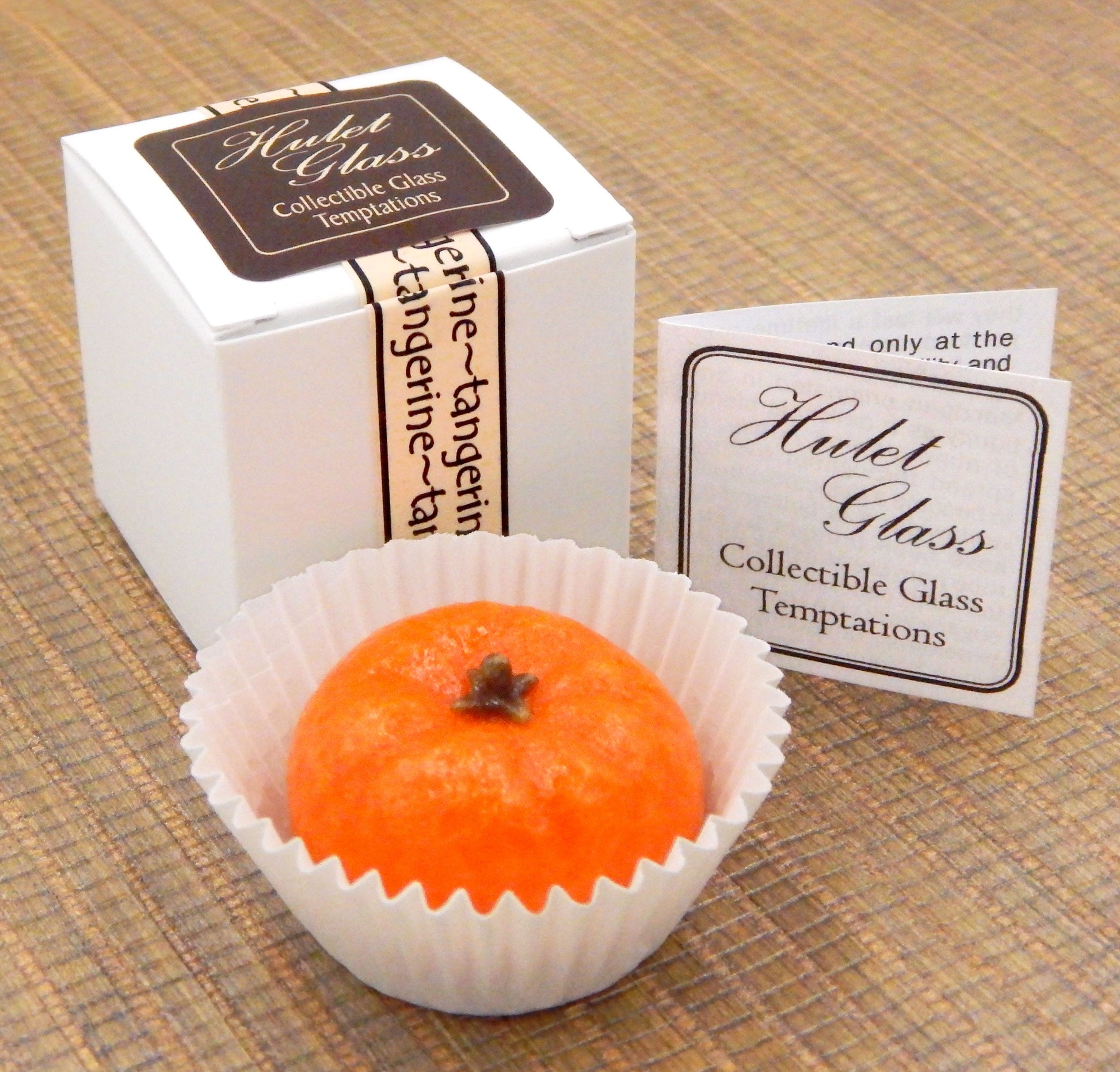 This glass marzipan tangerine measures approx. 1.5" x 1.5" x 1" and sits in a fluted glassine paper candy cup. The bottom of the marzipan is covered in felt to protect the surface it will sit upon. Each of our beautiful glass treats is signed (Hulet), dated and comes to you in a small gift box with an enclosure card telling a bit about the piece.