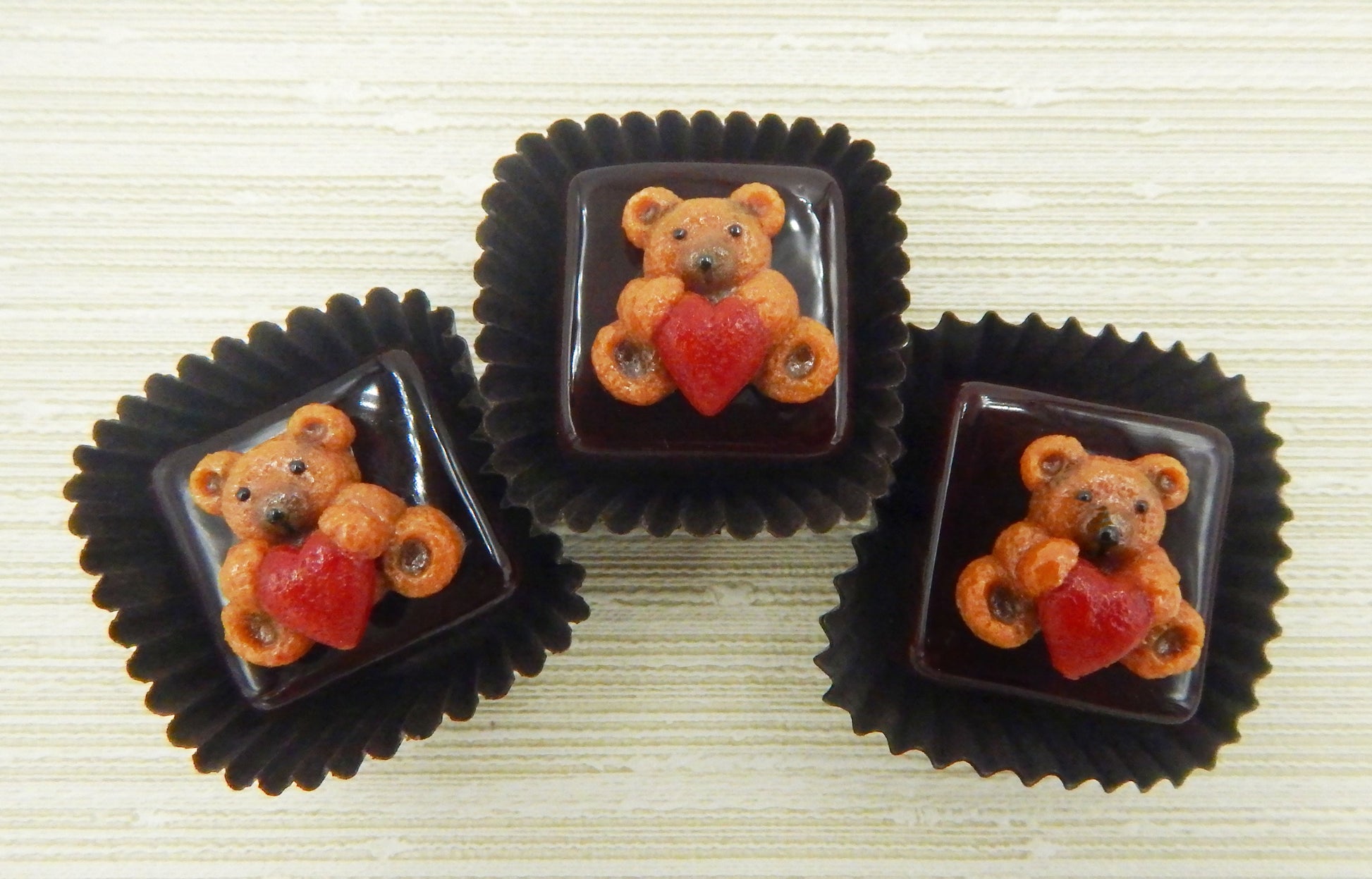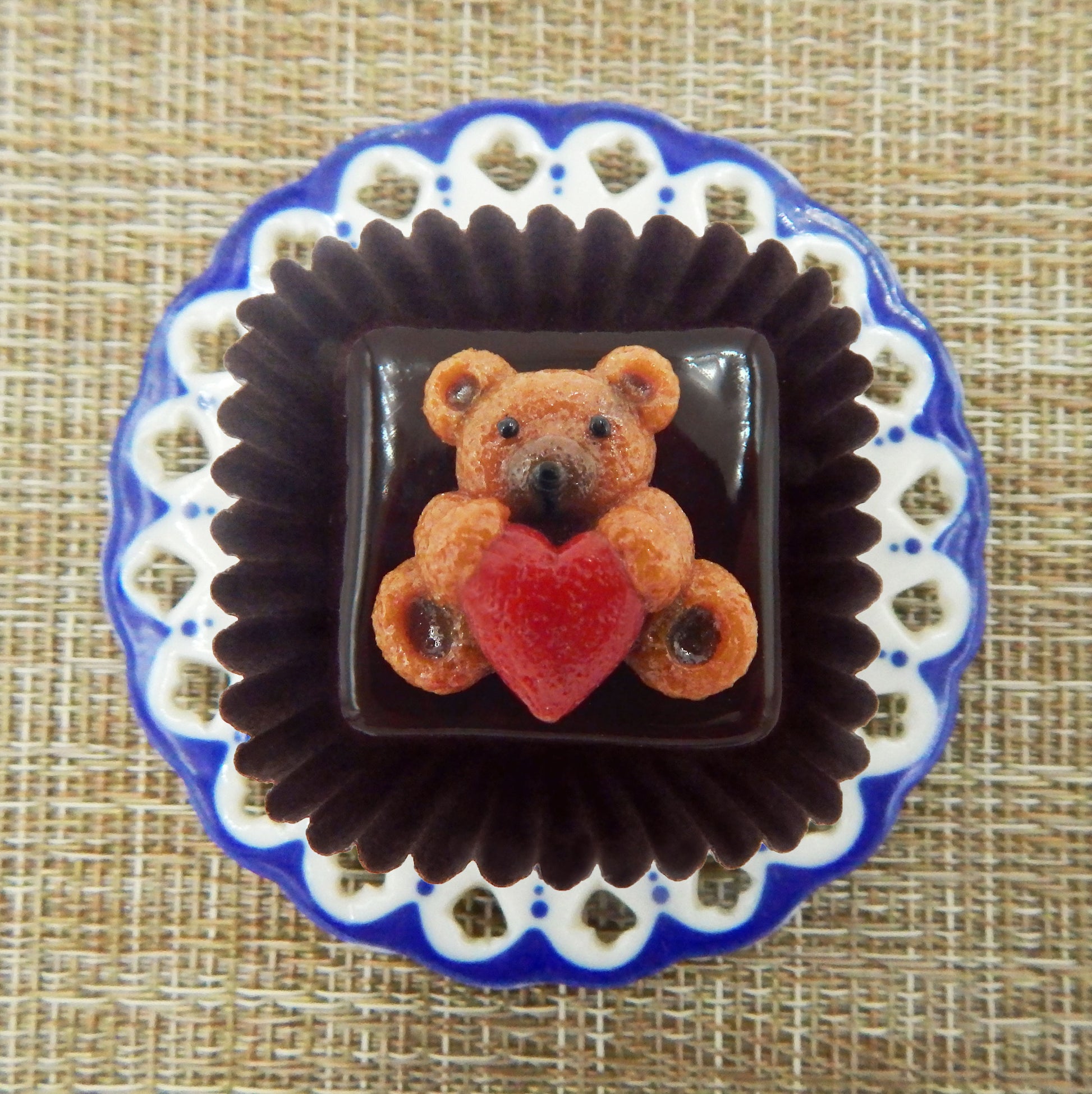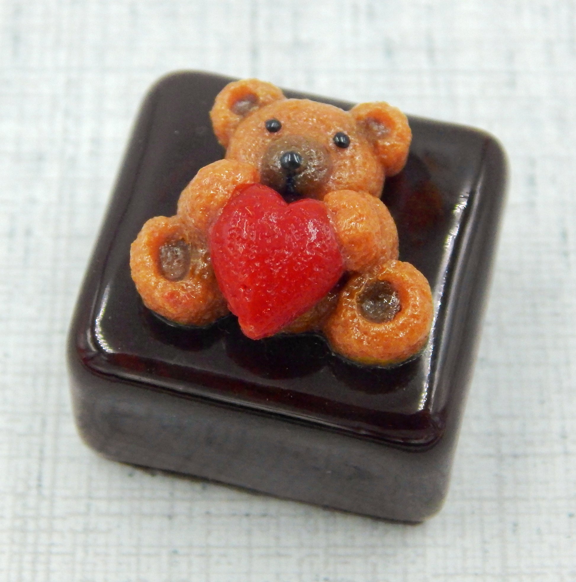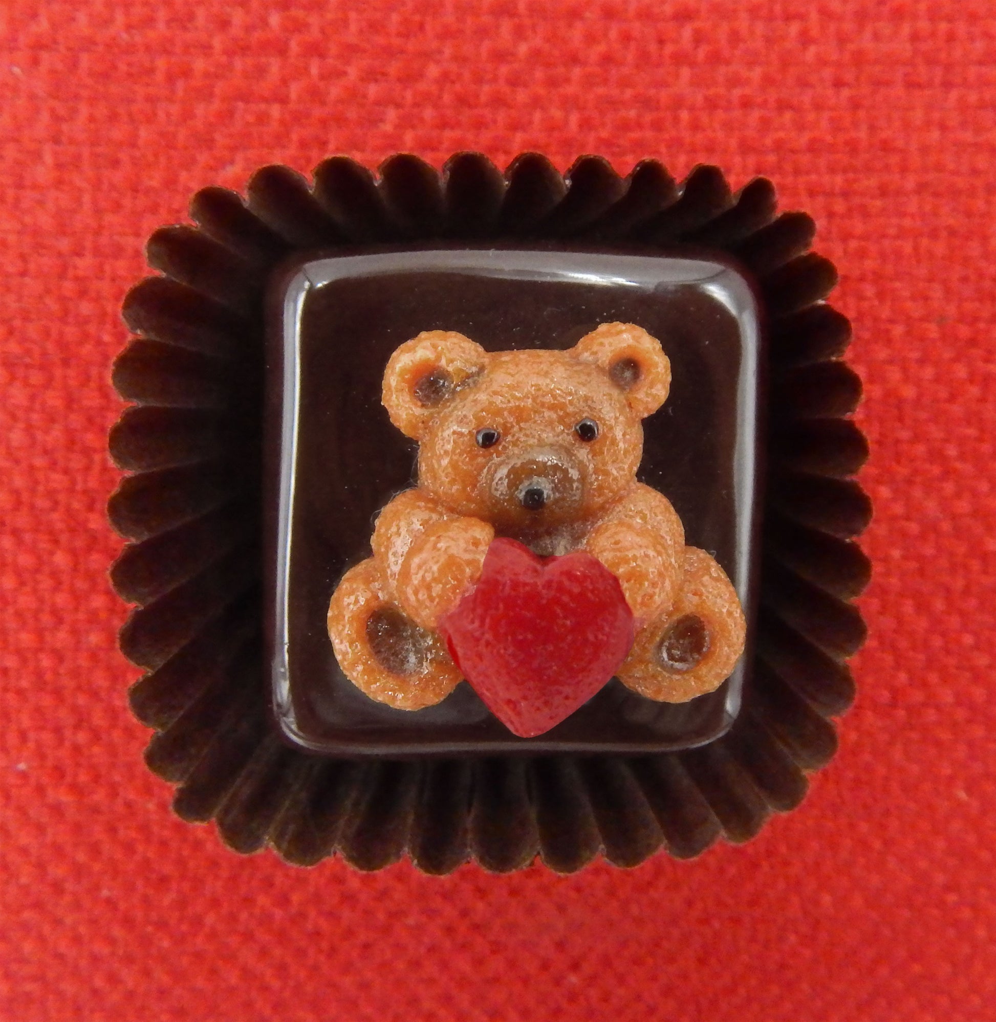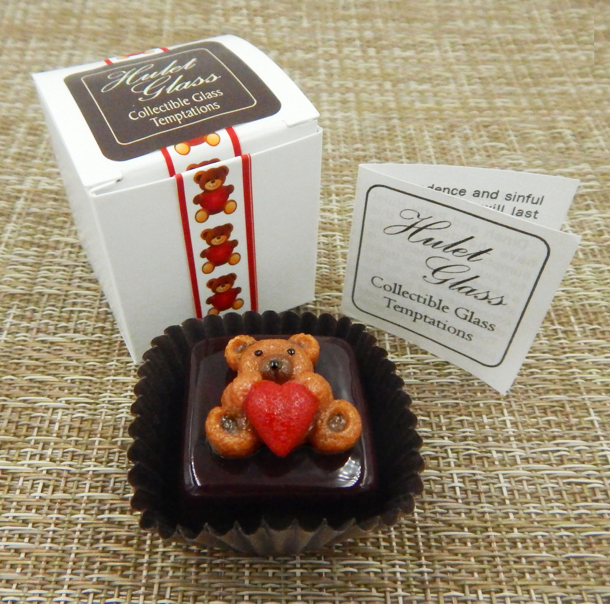 A handmade collectible solid glass chocolate with a cute little teddy bear holding a red heart on top created from colorful glass utilizing flameworking techniques. Meticulous attention to detail has gone into the construction of each of our pieces to enhance its appeal and collectibility.