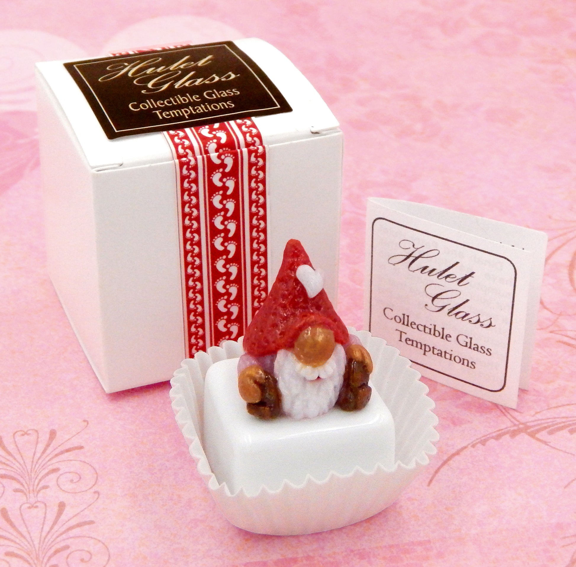 A handmade collectible sweet little solid glass white chocolate petit four with a diminutive love gnome on top created from colorful glass utilizing ancient pate de verre and lampworking techniques. Meticulous attention to detail has gone into the construction of each of our pieces to enhance its appeal and collectibility.